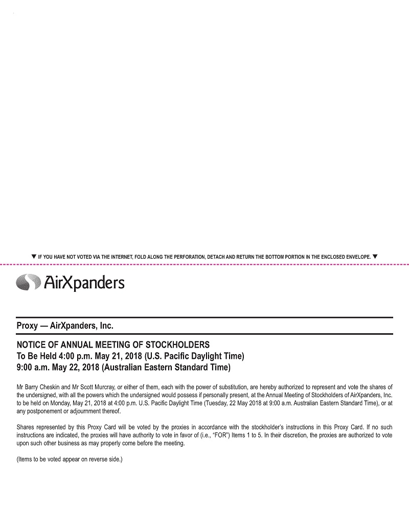 You are cordially invited to attend the 2018 Annual Meeting of Stockholders of AIRXPANDERS, INC., a Delaware corporation. The meeting will be held on Tuesday, May 22, 2018, at 9:00 a.m. Australian Eastern Standard Time (which is 4:00 p.m. on Monday, May 21, 2018 Pacific Daylight Time), at the Melbourne offices of Johnson Winter and Slattery at Level 34, 55 Collins Street, Melbourne, Victoria, Australia, for the following purposes: