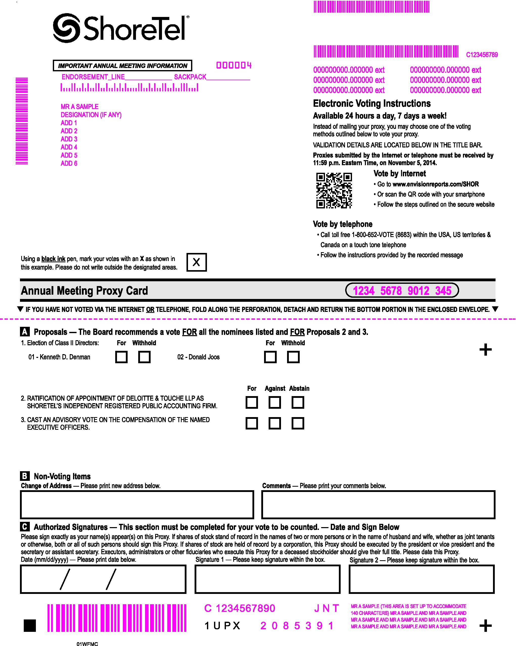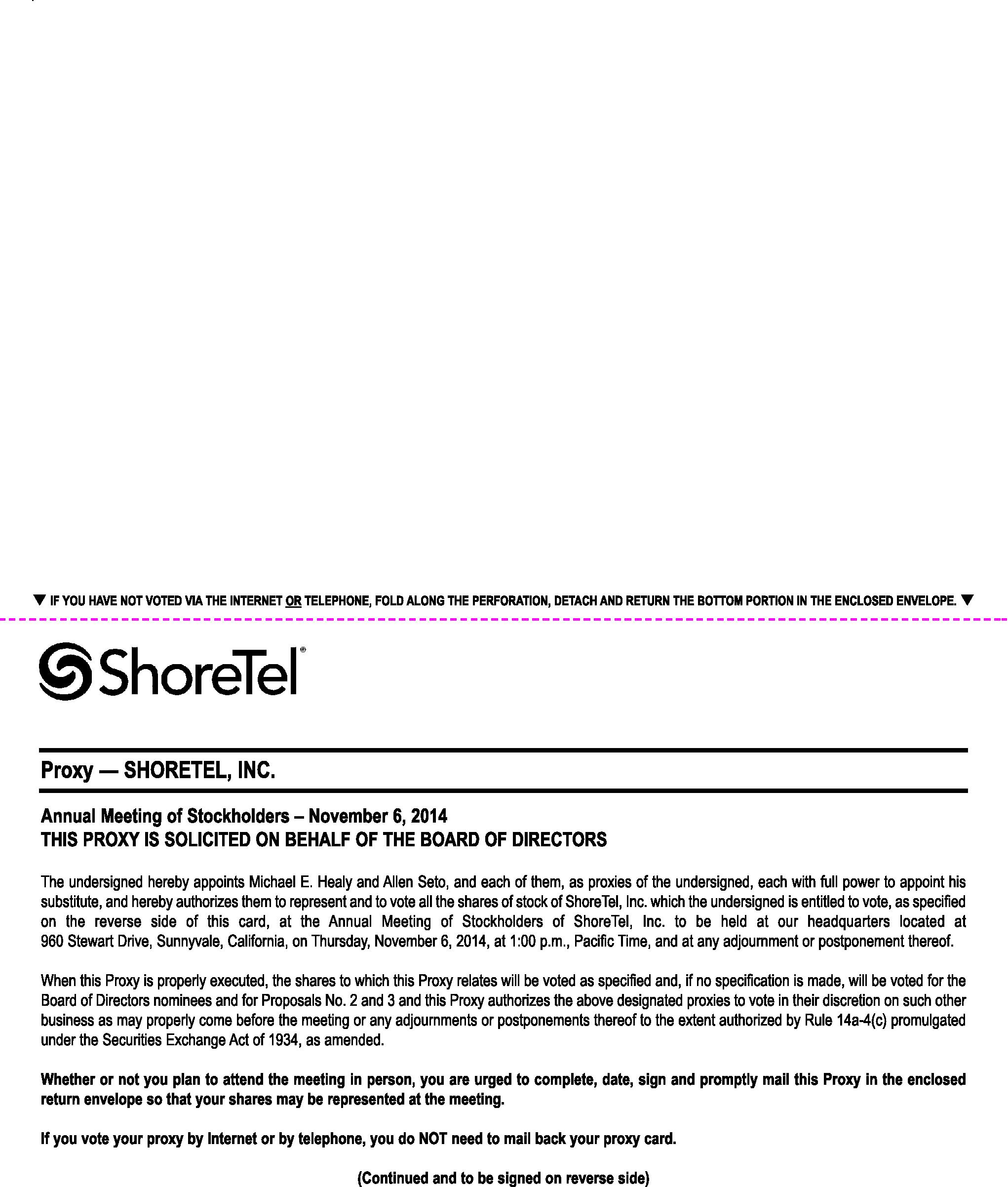 It is important that you use this opportunity to take part in the affairs of ShoreTel by voting on the business to come before this meeting. Whether or not you expect to attend the meeting, please complete, date, sign and promptly return the accompanying proxy in the enclosed postage-paid envelope so that your shares may be represented at the meeting. Returning the proxy does not deprive you of your right to attend the meeting and to vote your shares in person.