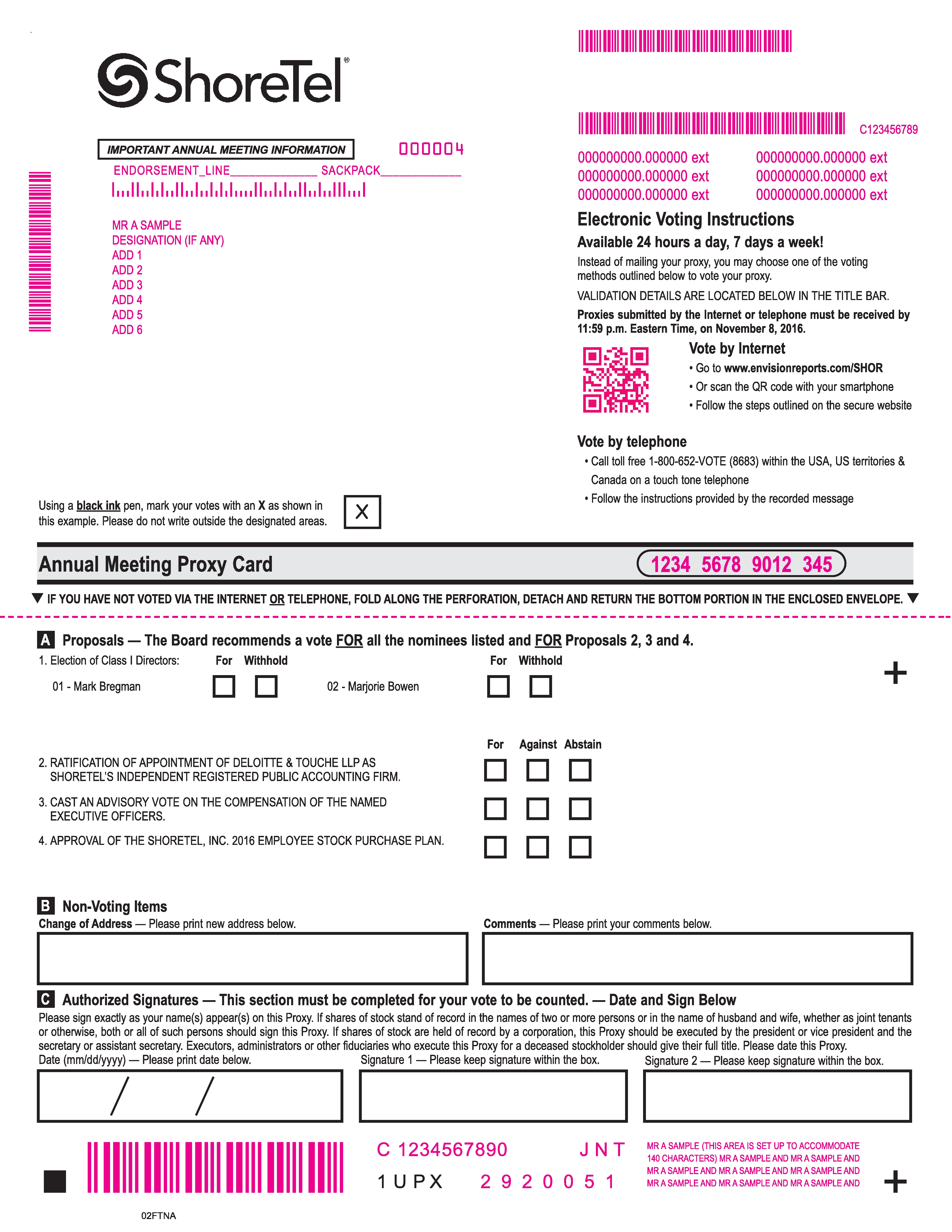 For stockholders with shares registered in the name of a brokerage firm or bank, a number of brokerage firms and banks are participating in a program for shares held in “street name” that offers telephone and Internet voting options. Stockholders with shares registered directly in their names with Computershare, ShoreTel’s transfer agent, will also be able to vote using the telephone and Internet. If your shares are held in an account at a brokerage firm or bank participating in this program or registered directly in your name with Computershare, you may vote those shares by calling the telephone number specified on your proxy or accessing the internet website address specified on your proxy instead of completing and signing the proxy itself. The giving of such a telephonic or internet proxy will not affect your right to vote in person should you decide to attend the annual meeting.