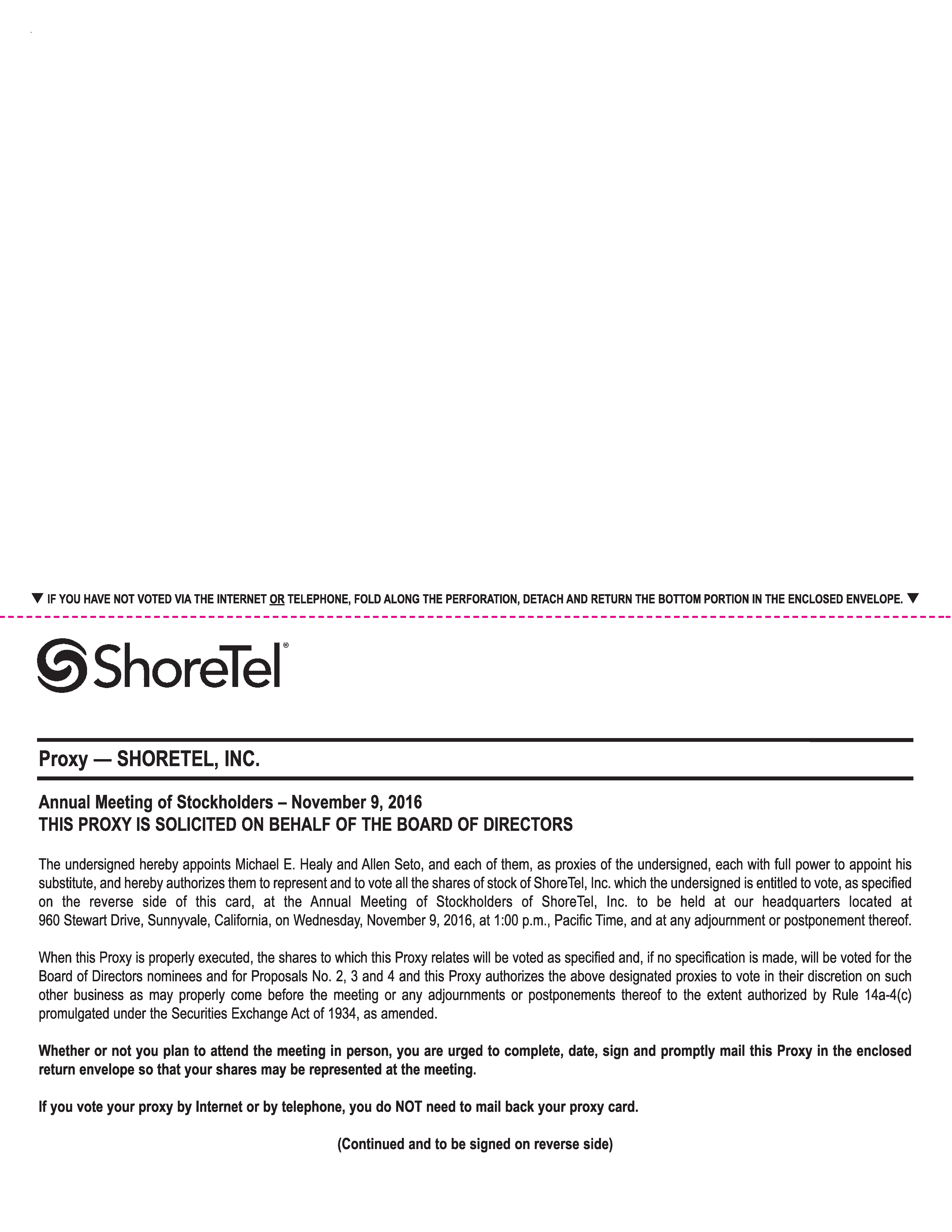 NOTICE IS HEREBY GIVEN that the 2016 Annual Meeting of Stockholders of ShoreTel, Inc. will be held at our headquarters located at 960 Stewart Drive, Sunnyvale, California 94085, on November 9, 2016, at 1:00 p.m., Pacific Time, for the following purposes: