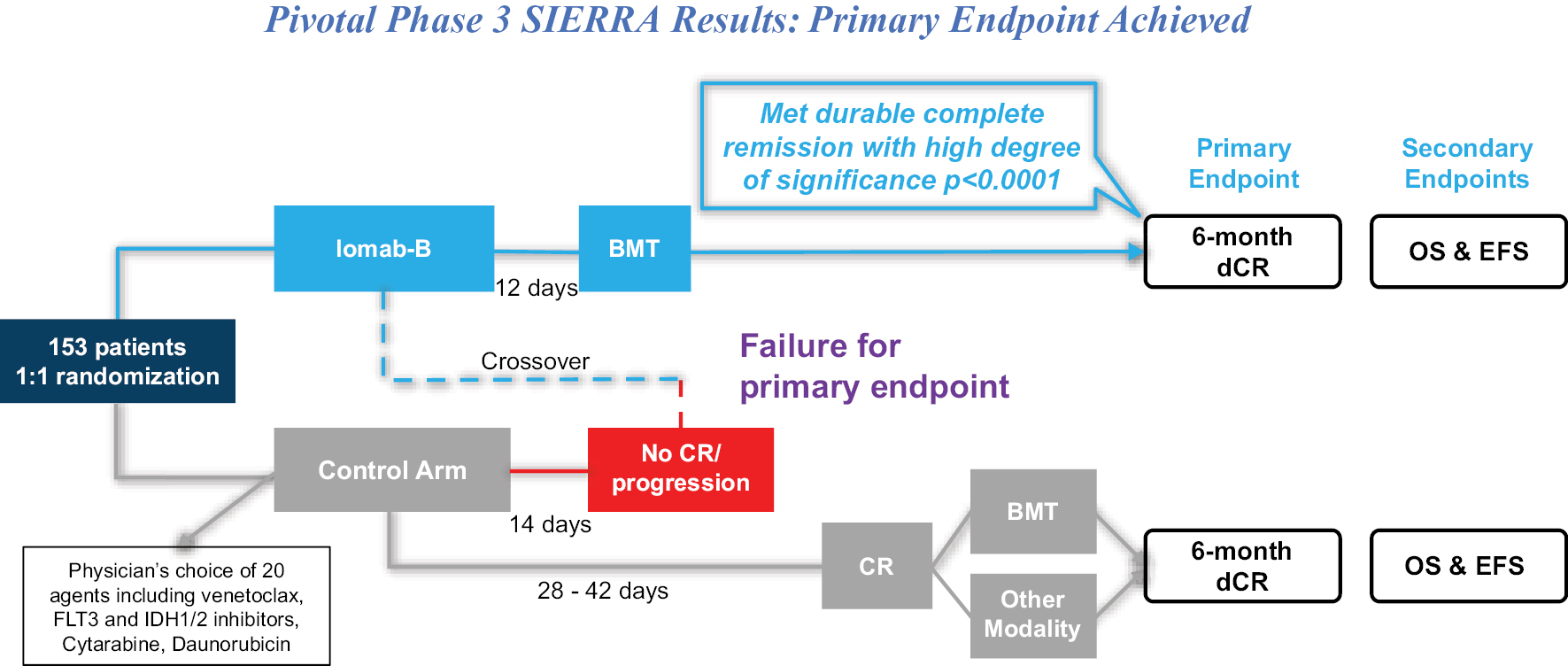 The recently announced topline results from the SIERRA (Study of Iomab-B in Elderly Relapsed or Refractory AML) trial showed that Iomab-B met the primary endpoint of durable complete remission (dCR) of 6-months following initial complete remission after HCT with a high degree of significance (p<0.0001) compared to the control arm. The SIERRA trial is a randomized, multi-center, controlled study which compared Iomab-B as a conditioning regimen prior to a BMT versus a control arm which allowed all current means of conventional care with the intent to transplant these patients. Iomab-B improved BMT access, and produced a statistically higher number of durable remissions, a major clinical benefit, in patients not considered eligible for BMT.