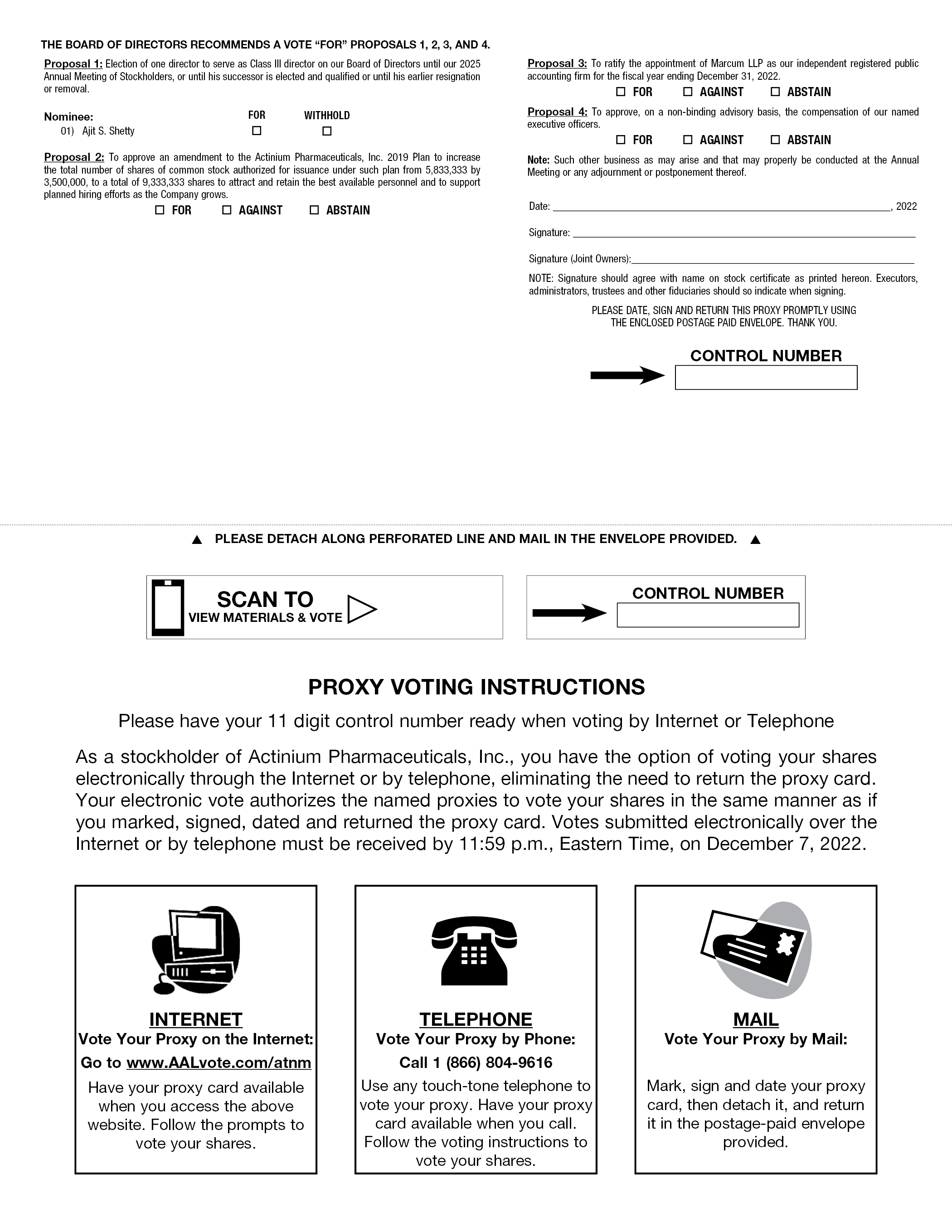 THE BOARD OF DIRECTORS RECOMMENDS A VOTE “FOR” PROPOSALS 1, 2, 3, AND 4. Proposal 1: Election of one director to serve as Class III director on our Board of Directors until our 2025 Annual Meeting of Stockholders, or until his successor is elected and qualified or until his earlier resignation or removal. Proposal 3: To ratify the appointment of Marcum LLP as our independent registered public accounting firm for the fiscal year ending December 31, 2022. FOR AGAINST ABSTAIN Nominee: 01) Ajit S. Shetty FOR WITHHOLD Proposal 4: To approve, on a non-binding advisory basis, the compensation of our named executive officers. Proposal 2: To approve an amendment to the Actinium Pharmaceuticals, Inc. 2019 Plan to increase the total number of shares of common stock authorized for issuance under such plan from 5,833,333 by 3,500,000, to a total of 9,333,333 shares to attract and retain the best available personnel and to support planned hiring efforts as the Company grows. FOR AGAINST ABSTAIN FOR AGAINST ABSTAIN Note: Such other business as may arise and that may properly be conducted at the Annual Meeting or any adjournment or postponement thereof. Date: , 2022 Signature: Signature (Joint Owners): NOTE: Signature should agree with name on stock certificate as printed hereon. Executors, administrators, trustees and other fiduciaries should so indicate when signing. PLEASE DATE, SIGN AND RETURN THIS PROXY PROMPTLY USING THE ENCLOSED POSTAGE PAID ENVELOPE. THANK YOU. CONTROL NUMBER PLEASE DETACH ALONG PERFORATED LINE AND MAIL IN THE ENVELOPE PROVIDED. SCAN TO VIEW MATERIALS & VOTE CONTROL NUMBER PROXY VOTING INSTRUCTIONS Please have your 11 digit control number ready when voting by Internet or Telephone As a stockholder of Actinium Pharmaceuticals, Inc., you have the option of voting your shares electronically through the Internet or by telephone, eliminating the need to return the proxy card. Your electronic vote authorizes the named proxies to vote your shares in the same manner as if you marked, signed, dated and returned the proxy card. Votes submitted electronically over the Internet or by telephone must be received by 11:59 p.m., Eastern Time, on December 7, 2022. INTERNET Vote Your Proxy on the Internet: Go to www.AALvote.com/atnm Have your proxy card available when you access the above website. Follow the prompts to vote your shares. TELEPHONE Vote Your Proxy by Phone: Call 1 (866) 804-9616 Use any touch-tone telephone to vote your proxy. Have your proxy card available when you call. Follow the voting instructions to vote your shares. MAIL Vote Your Proxy by Mail: Mark, sign and date your proxy card, then detach it, and return it in the postage-paid envelope provided.