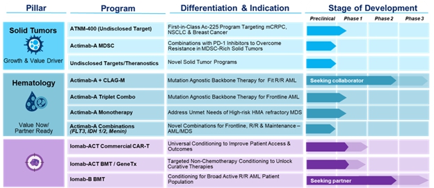 Since our inception, we have focused on developing innovative and differentiated radiotherapies. Our pipeline of both early and later stage development programs is a testimony to our approach in three areas with: (1) two novel solid tumor product candidates, ATNM-400 and Actimab-A, with pan-tumor potential, (2) Actimab-A, which is also being developed as a therapeutic backbone for acute myeloid leukemia (AML) and myelodysplastic syndrome (MDS) in partnership with the National Cancer Institute (NCI), and (3) two targeted conditioning agents, Iomab-B for bone marrow transplant and Iomab-ACT for cell & gene therapies. Our solid tumor asset, ATNM-400, targets a novel, antigen which does not target PSMA, with demonstrated pre-clinical activity across metastatic castration-resistant prostate cancer (mCRPC), non-small cell lung cancer (NSCLC), and breast cancer. Actimab-A, targets myeloid derived suppressor cells (MDSC’s) and is being studied in multiple solid tumors in combination with immune checkpoint inhibitors where MDSC’s are known to act as an efficacy deterrent for these agents. Our hematology franchise includes: Actimab-A, a CD33-targeted therapy; as well as, Iomab-B and Iomab-ACT which are CD45-targeting conditioning agents. Both Actimab-A and Iomab-B are Phase 2/3 ready assets and are supported by extensive validation in over 15 clinical trials in which more than 500 patients were treated.