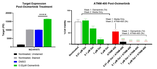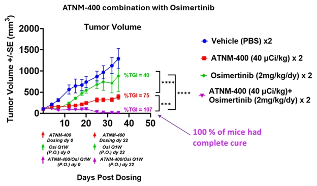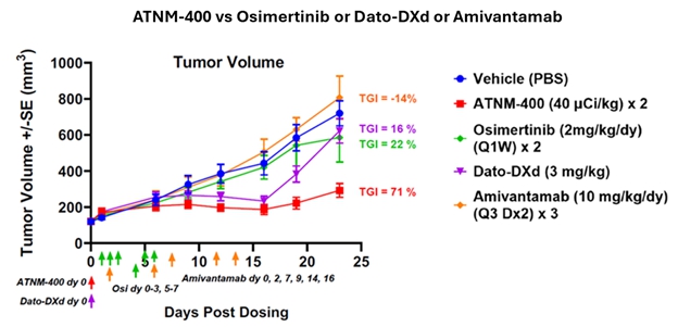 ATNM-400 also demonstrates clinical development potential in EGFR-mutant NSCLC, where our pre-clinical data demonstrated 3-5 fold superiority compared to approved EGFR inhibitors including osimertinib (Tagrisso®), datopotamab deruxtecan (Dato-DXd), and amivantamab, as well as 100% complete responses in combination with osimertinib. We have established mechanistic rationale for this combination through demonstrated upregulation of the ATNM-400 target following osimertinib treatment. Furthermore, in pre-clinical studies, both ATNM-400 monotherapy and ATNM-400 in combination with osimertinib is superior to an osimertinib combination with chemotherapy. This positions ATNM-400 for potential development across first-, second-, and third-line EGFR-mutant NSCLC treatment settings.