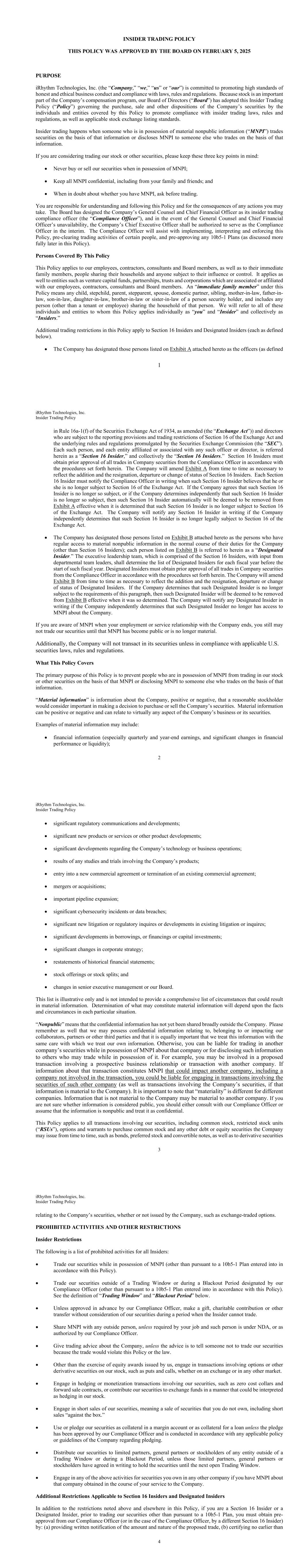 1 INSIDER TRADING POLICY THIS POLICY WAS APPROVED BY THE BOARD ON FEBRUARY 5, 2025 PURPOSE iRhythm Technologies, Inc. (the “Company,” “we,” “us” or “our”) is committed to promoting high standards of honest and ethical business conduct and compliance with laws, rules and regulations. Because stock is an important part of the Company’s compensation program, our Board of Directors (“Board”) has adopted this Insider Trading Policy (“Policy”) governing the purchase, sale and other dispositions of the Company’s securities by the individuals and entities covered by this Policy to promote compliance with insider trading laws, rules and regulations, as well as applicable stock exchange listing standards. Insider trading happens when someone who is in possession of material nonpublic information (“MNPI”) trades securities on the basis of that information or discloses MNPI to someone else who trades on the basis of that information. If you are considering trading our stock or other securities, please keep these three key points in mind: • Never buy or sell our securities when in possession of MNPI; • Keep all MNPI confidential, including from your family and friends; and • When in doubt about whether you have MNPI, ask before trading. You are responsible for understanding and following this Policy and for the consequences of any actions you may take. The Board has designed the Company’s General Counsel and Chief Financial Officer as its insider trading compliance officer (the “Compliance Officer”), and in the event of the General Counsel and Chief Financial Officer’s unavailability, the Company’s Chief Executive Officer shall be authorized to serve as the Compliance Officer in the interim. The Compliance Officer will assist with implementing, interpreting and enforcing this Policy, pre-clearing trading activities of certain people, and pre-approving any 10b5-1 Plans (as discussed more fully later in this Policy). Persons Covered By This Policy This Policy applies to our employees, contractors, consultants and Board members, as well as to their immediate family members, people sharing their households and anyone subject to their influence or control. It applies as well to entities such as venture capital funds, partnerships, trusts and corporations which are associated or affiliated with our employees, contractors, consultants and Board members. An “immediate family member” under this Policy means any child, stepchild, parent, stepparent, spouse, domestic partner, sibling, mother-in-law, father-in- law, son-in-law, daughter-in-law, brother-in-law or sister-in-law of a person security holder, and includes any person (other than a tenant or employee) sharing the household of that person. We will refer to all of these individuals and entities to whom this Policy applies individually as “you” and “Insider” and collectively as “Insiders.” Additional trading restrictions in this Policy apply to Section 16 Insiders and Designated Insiders (each as defined below). • The Company has designated those persons listed on Exhibit A attached hereto as the officers (as defined iRhythm Technologies, Inc. Insider Trading Policy 2 in Rule 16a-1(f) of the Securities Exchange Act of 1934, as amended (the “Exchange Act”)) and directors who are subject to the reporting provisions and trading restrictions of Section 16 of the Exchange Act and the underlying rules and regulations promulgated by the Securities Exchange Commission (the “SEC”). Each such person, and each entity affiliated or associated with any such officer or director, is referred herein as a “Section 16 Insider,” and collectively the “Section 16 Insiders.” Section 16 Insiders must obtain prior approval of all trades in Company securities from the Compliance Officer in accordance with the procedures set forth herein. The Company will amend Exhibit A from time to time as necessary to reflect the addition and the resignation, departure or change of status of Section 16 Insiders. Each Section 16 Insider must notify the Compliance Officer in writing when such Section 16 Insider believes that he or she is no longer subject to Section 16 of the Exchange Act. If the Company agrees that such Section 16 Insider is no longer so subject, or if the Company determines independently that such Section 16 Insider is no longer so subject, then such Section 16 Insider automatically will be deemed to be removed from Exhibit A effective when it is determined that such Section 16 Insider is no longer subject to Section 16 of the Exchange Act. The Company will notify any Section 16 Insider in writing if the Company independently determines that such Section 16 Insider is no longer legally subject to Section 16 of the Exchange Act. • The Company has designated those persons listed on Exhibit B attached hereto as the persons who have regular access to material nonpublic information in the normal course of their duties for the Company (other than Section 16 Insiders); each person listed on Exhibit B is referred to herein as a “Designated Insider.” The executive leadership team, which is comprised of the Section 16 Insiders, with input from departmental team leaders, shall determine the list of Designated Insiders for each fiscal year before the start of such fiscal year. Designated Insiders must obtain prior approval of all trades in Company securities from the Compliance Officer in accordance with the procedures set forth herein. The Company will amend Exhibit B from time to time as necessary to reflect the addition and the resignation, departure or change of status of Designated Insiders. If the Company determines that such Designated Insider is no longer subject to the requirements of this paragraph, then such Designated Insider will be deemed to be removed from Exhibit B effective when it was so determined. The Company will notify any Designated Insider in writing if the Company independently 
