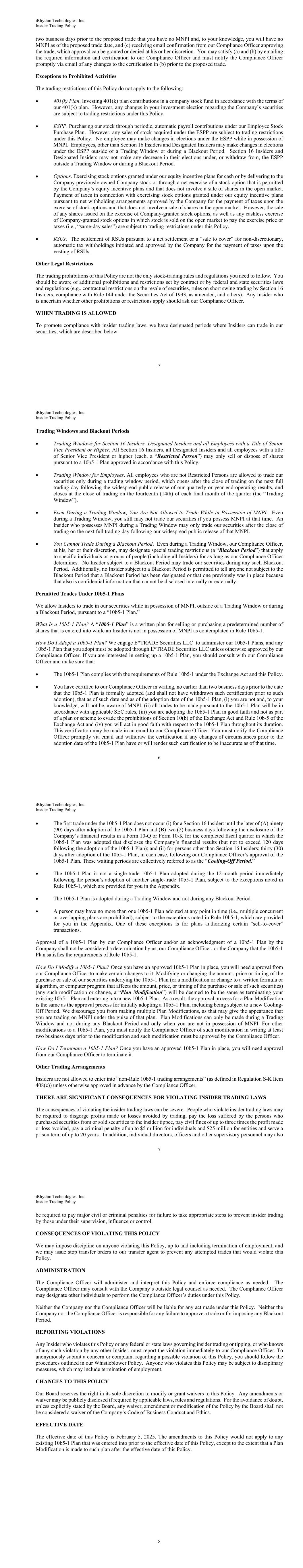 iRhythm Technologies, Inc. Insider Trading Policy 5 two business days prior to the proposed trade that you have no MNPI and, to your knowledge, you will have no MNPI as of the proposed trade date, and (c) receiving email confirmation from our Compliance Officer approving the trade, which approval can be granted or denied at his or her discretion. You may satisfy (a) and (b) by emailing the required information and certification to our Compliance Officer and must notify the Compliance Officer promptly via email of any changes to the certification in (b) prior to the proposed trade. Exceptions to Prohibited Activities The trading restrictions of this Policy do not apply to the following: • 401(k) Plan. Investing 401(k) plan contributions in a company stock fund in accordance with the terms of our 401(k) plan. However, any changes in your investment election regarding the Company’s securities are subject to trading restrictions under this Policy. • ESPP. Purchasing our stock through periodic, automatic payroll contributions under our Employee Stock Purchase Plan. However, any sales of stock acquired under the ESPP are subject to trading restrictions under this Policy. No employee may make changes in elections under the ESPP while in possession of MNPI. Employees, other than Section 16 Insiders and Designated Insiders may make changes in elections under the ESPP outside of a Trading Window or during a Blackout Period. Section 16 Insiders and Designated Insiders may not make any decrease in their elections under, or withdraw from, the ESPP outside a Trading Window or during a Blackout Period. • Options. Exercising stock options granted under our equity incentive plans for cash or by delivering to the Company previously owned Company stock or through a net exercise of a stock option that is permitted by the Company’s equity incentive plans and that does not involve a sale of shares in the open market. Payment of taxes in connection with exercising stock options granted under our equity incentive plans pursuant to net withholding arrangements approved by the Company for the payment of taxes upon the exercise of stock options and that does not involve a sale of shares in the open market. However, the sale of any shares issued on the exercise of Company-granted stock options, as well as any cashless exercise of Company-granted stock options in which stock is sold on the open market to pay the exercise price or taxes (i.e., “same-day sales”) are subject to trading restrictions under this Policy. • RSUs. The settlement of RSUs pursuant to a net settlement or a “sale to cover” for non-discretionary, automatic tax withholdings initiated and approved by the Company for the payment of taxes upon the vesting of RSUs. Other Legal Restrictions The trading prohibitions of this Policy are not the only stock-trading rules and regulations you need to follow. You should be aware of additional prohibitions and restrictions set by contract or by federal and state securities laws and regulations (e.g., contractual restrictions on the resale of securities, rules on short swing trading by Section 16 Insiders, compliance with Rule 144 under the Securities Act of 1933, as amended, and others). Any Insider who is uncertain whether other prohibitions or restrictions apply should ask our Compliance Officer. WHEN TRADING IS ALLOWED To promote compliance with insider trading laws, we have designated periods where Insiders can trade in our securities, which are described below: iRhythm Technologies, Inc. Insider Trading Policy 6 Trading Windows and Blackout Periods • Trading Windows for Section 16 Insiders, Designated Insiders and all Employees with a Title of Senior Vice President or Higher. All Section 16 Insiders, all Designated Insiders and all employees with a title of Senior Vice President or higher (each, a “Restricted Person”) may only sell or dispose of shares pursuant to a 10b5-1 Plan approved in accordance with this Policy. • Trading Window for Employees. All employees who are not Restricted Persons are allowed to trade our securities only during a trading window period, which opens after the close of trading on the next full trading day following the widespread public release of our quarterly or year end operating results, and closes at the close of trading on the fourteenth (14th) of each final month of the quarter (the “Trading Window”). • Even During a Trading Window, You Are Not Allowed to Trade While in Possession of MNPI. Even during a Trading Window, you still may not trade our securities if you possess MNPI at that time. An Insider who possesses MNPI during a Trading Window may only trade our securities after the close of trading on the next full trading day following our widespread public release of that MNPI. • You Cannot Trade During a Blackout Period. Even during a Trading Window, our Compliance Officer, at his, her or their discretion, may designate special trading restrictions (a “Blackout Period”) that apply to specific individuals or groups of people (including all Insiders) for as long as our Compliance Officer determines. No Insider subject to a Blackout Period may trade our securities during any such Blackout Period. Additionally, no Insider subject to a Blackout Period is permitted to tell anyone not subject to the Blackout Period that a Blackout Period has been designated or that one previously was in place because that also is confidential information that cannot be disclosed internally or externally. Permitted Trades Under 10b5-1 Plans We allow Insiders to trade in our securities while in possession of MNPI, outside of a Trading Window or during a Blackout Period, pursuant to a “10b5-1 Plan.” What Is a 10b5-1 Plan? A “10b5-1 Plan” is a written plan for selling or purchasing a predetermined number of shares that is entered into while an Insider is not in possession of MNPI as contemplated in Rule 10b5-1. How Do I Adopt a 10b5-1 Plan? We engag