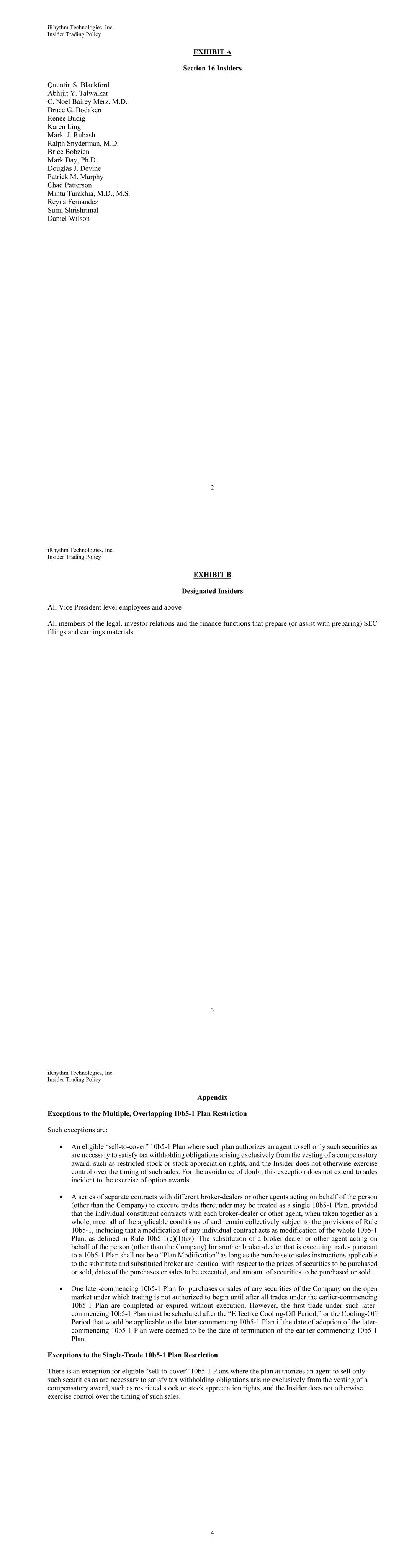 iRhythm Technologies, Inc. Insider Trading Policy 2 EXHIBIT A Section 16 Insiders Quentin S. Blackford Abhijit Y. Talwalkar C. Noel Bairey Merz, M.D. Bruce G. Bodaken Renee Budig Karen Ling Mark. J. Rubash Ralph Snyderman, M.D. Brice Bobzien Mark Day, Ph.D. Douglas J. Devine Patrick M. Murphy Chad Patterson Mintu Turakhia, M.D., M.S. Reyna Fernandez Sumi Shrishrimal Daniel Wilson iRhythm Technologies, Inc. Insider Trading Policy 3 EXHIBIT B Designated Insiders All Vice President level employees and above All members of the legal, investor relations and the finance functions that prepare (or assist with preparing) SEC filings and earnings materials iRhythm Technologies, Inc. Insider Trading Policy 4 Appendix Exceptions to the Multiple, Overlapping 10b5-1 Plan Restriction Such exceptions are: • An eligible “sell-to-cover” 10b5-1 Plan where such plan authorizes an agent to sell only such securities as are necessary to satisfy tax withholding obligations arising exclusively from the vesting of a compensatory award, such as restricted stock or stock appreciation rights, and the Insider does not otherwise exercise control over the timing of such sales. For the avoidance of doubt, this exception does not extend to sales incident to the exercise of option awards. • A series of separate contracts with different broker-dealers or other agents acting on behalf of the person (other than the Company) to execute trades thereunder may be treated as a single 10b5-1 Plan, provided that the individual constituent contracts with each broker-dealer or other agent, when taken together as a whole, meet all of the applicable conditions of and remain collectively subject to the provisions of Rule 10b5-1, including that a modification of any individual contract acts as modification of the whole 10b5-1 Plan, as defined in Rule 10b5-1(c)(1)(iv). The substitution of a broker-dealer or other agent acting on behalf of the person (other than the Company) for another broker-dealer that is executing trades pursuant to a 10b5-1 Plan shall not be a “Plan Modification” as long as the purchase or sales instructions applicable to the substitute and substituted broker are identical with respect to the prices of securities to be purchased or sold, dates of the purchases or sales to be executed, and amount of securities to be purchased or sold. • One later-commencing 10b5-1 Plan for purchases or sales of any securities of the Company on the open market under which trading is not authorized to begin until after all trades under the earlier-commencing 10b5-1 Plan are completed or expired without execution. However, the first trade under such later- commencing 10b5-1 Plan must be scheduled after the “Effective Cooling-Off Period,” or the Cooling-Off Period that would be applicable to the later-commencing 10b5-1 Plan if the date of adoption of the later- commencing 10b5-1 Plan were deemed to be the date of termination of the earlier-commencing 10b5-1 Plan. Exceptions to the Single-Trade 10b5-1 Plan Restriction There is an exception for eligible “sell-to-cover” 10b5-1 Plans where the plan authorizes an agent to sell only such securities as are necessary to satisfy tax withholding obligations arising exclusively from the vesting of a compensatory award, such as restricted stock or stock appreciation rights, and the Insider does not otherwise exercise control over the timing of such sales.