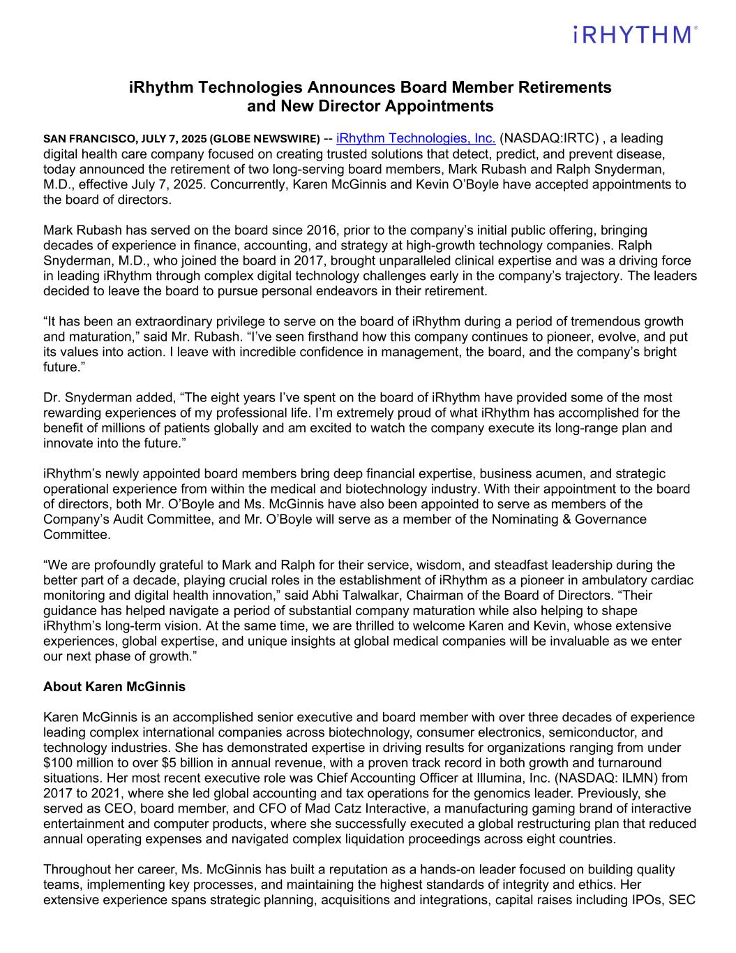 iRhythm Technologies Announces Board Member Retirements and New Director Appointments SAN FRANCISCO, JULY 7, 2025 (GLOBE NEWSWIRE) -- iRhythm Technologies, Inc. (NASDAQ:IRTC) , a leading digital health care company focused on creating trusted solutions that detect, predict, and prevent disease, today announced the retirement of two long-serving board members, Mark Rubash and Ralph Snyderman, M.D., effective July 7, 2025. Concurrently, Karen McGinnis and Kevin O’Boyle have accepted appointments to the board of directors. Mark Rubash has served on the board since 2016, prior to the company’s initial public offering, bringing decades of experience in finance, accounting, and strategy at high-growth technology companies. Ralph Snyderman, M.D., who joined the board in 2017, brought unparalleled clinical expertise and was a driving force in leading iRhythm through complex digital technology challenges early in the company’s trajectory. The leaders decided to leave the board to pursue personal endeavors in their retirement. “It has been an extraordinary privilege to serve on the board of iRhythm during a period of tremendous growth and maturation,” said Mr. Rubash. “I’ve seen firsthand how this company continues to pioneer, evolve, and put its values into action. I leave with incredible confidence in management, the board, and the company’s bright future.” Dr. Snyderman added, “The eight years I’ve spent on the board of iRhythm have provided some of the most rewarding experiences of my professional life. I’m extremely proud of what iRhythm has accomplished for the benefit of millions of patients globally and am excited to watch the company execute its long-range plan and innovate into the future.” iRhythm’s newly appointed board members bring deep financial expertise, business acumen, and strategic operational experience from within the medical and biotechnology industry. With their appointment to the board of directors, both Mr. O’Boyle and Ms. McGinnis have also been appointed to serve as members of the Company’s Audit Committee, and Mr. O’Boyle will serve as a member of the Nominating & Governance Committee. “We are profoundly grateful to Mark and Ralph for their service, wisdom, and steadfast leadership during the better part of a decade, playing crucial roles in the establishment of iRhythm as a pioneer in ambulatory cardiac monitoring and digital health innovation,” said Abhi Talwalkar, Chairman of the Board of Directors. “Their guidance has helped navigate a period of substantial company maturation while also helping to shape iRhythm’s long-term vision. At the same time, we are thrilled to welcome Karen and Kevin, whose extensive experiences, global expertise, and unique insights at global medical companies will be invaluable as we enter our next phase of growth.” About Karen McGinnis Karen McGinnis is an accomplished senior executive and board member with over three decades of experience leading complex international companies across biotechnology, consumer electronics, semiconductor, and technology industries. She has demonstrated expertise in driving results for organizations ranging from under $100 million to over $5 billion in annual revenue, with a proven track record in both growth and turnaround situations. Her most recent executive role was Chief Accounting Officer at Illumina, Inc. (NASDAQ: ILMN) from 2017 to 2021, where she led global accounting and tax operations for the genomics leader. Previously, she served as CEO, board member, and CFO of Mad Catz Interactive, a manufacturing gaming brand of interactive entertainment and computer products, where she successfully executed a global restructuring plan that reduced annual operating expenses and navigated complex liquidation proceedings across eight countries. Throughout her career, Ms. McGinnis has built a reputation as a hands-on leader focused on building quality teams, implementing key processes, and maintaining the highest standards of integrity and ethics. Her extensive experience spans strategic planning, acquisitions and integrations, capital raises including IPOs, SEC