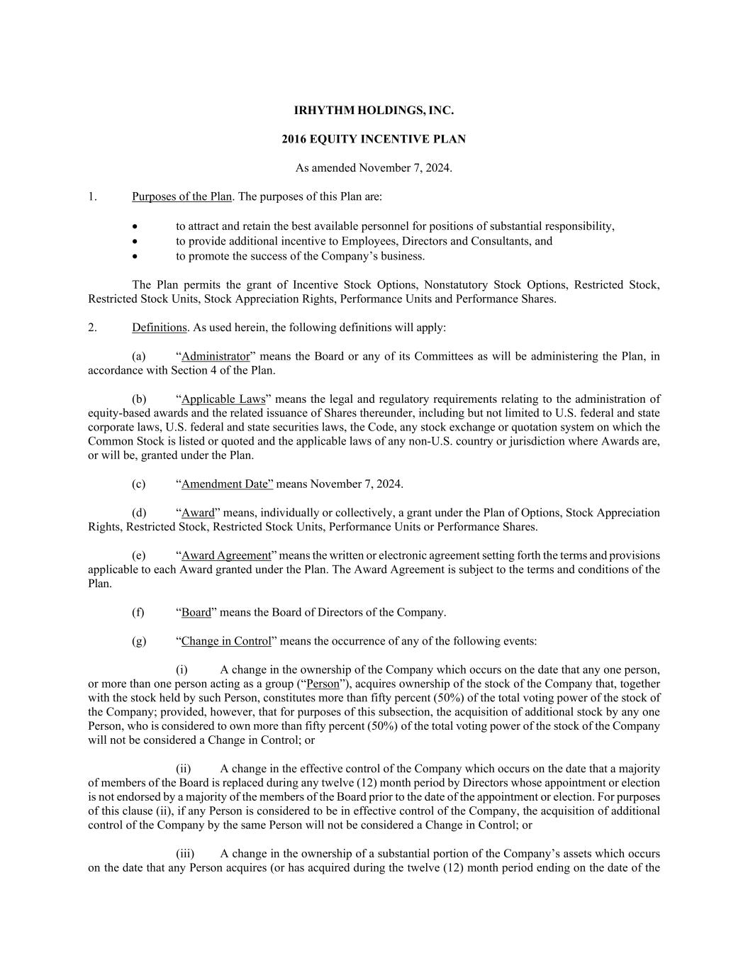 IRHYTHM HOLDINGS, INC. 2016 EQUITY INCENTIVE PLAN As amended November 7, 2024. 1. Purposes of the Plan. The purposes of this Plan are: • to attract and retain the best available personnel for positions of substantial responsibility, • to provide additional incentive to Employees, Directors and Consultants, and • to promote the success of the Company’s business. The Plan permits the grant of Incentive Stock Options, Nonstatutory Stock Options, Restricted Stock, Restricted Stock Units, Stock Appreciation Rights, Performance Units and Performance Shares. 2. Definitions. As used herein, the following definitions will apply: (a) “Administrator” means the Board or any of its Committees as will be administering the Plan, in accordance with Section 4 of the Plan. (b) “Applicable Laws” means the legal and regulatory requirements relating to the administration of equity-based awards and the related issuance of Shares thereunder, including but not limited to U.S. federal and state corporate laws, U.S. federal and state securities laws, the Code, any stock exchange or quotation system on which the Common Stock is listed or quoted and the applicable laws of any non-U.S. country or jurisdiction where Awards are, or will be, granted under the Plan. (c) “Amendment Date” means November 7, 2024. (d) “Award” means, individually or collectively, a grant under the Plan of Options, Stock Appreciation Rights, Restricted Stock, Restricted Stock Units, Performance Units or Performance Shares. (e) “Award Agreement” means the written or electronic agreement setting forth the terms and provisions applicable to each Award granted under the Plan. The Award Agreement is subject to the terms and conditions of the Plan. (f) “Board” means the Board of Directors of the Company. (g) “Change in Control” means the occurrence of any of the following events: (i) A change in the ownership of the Company which occurs on the date that any one person, or more than one person acting as a group (“Person”), acquires ownership of the stock of the Company that, together with the stock held by such Person, constitutes more than fifty percent (50%) of the total voting power of the stock of the Company; provided, however, that for purposes of this subsection, the acquisition of additional stock by any one Person, who is considered to own more than fifty percent (50%) of the total voting power of the stock of the Company will not be considered a Change in Control; or (ii) A change in the effective control of the Company which occurs on the date that a majority of members of the Board is replaced during any twelve (12) month period by Directors whose appointment or election is not endorsed by a majority of the members of the Board prior to the date of the appointment or election. For purposes of this clause (ii), if any Person is considered to be in effective control of the Company, the acquisition of additional control of the Company by the same Person will not be considered a Change in Control; or (iii) A change in the ownership of a substantial portion of the Company’s assets which occurs on the date that any Person acquires (or has acquired during the twelve (12) month period ending on the date of the