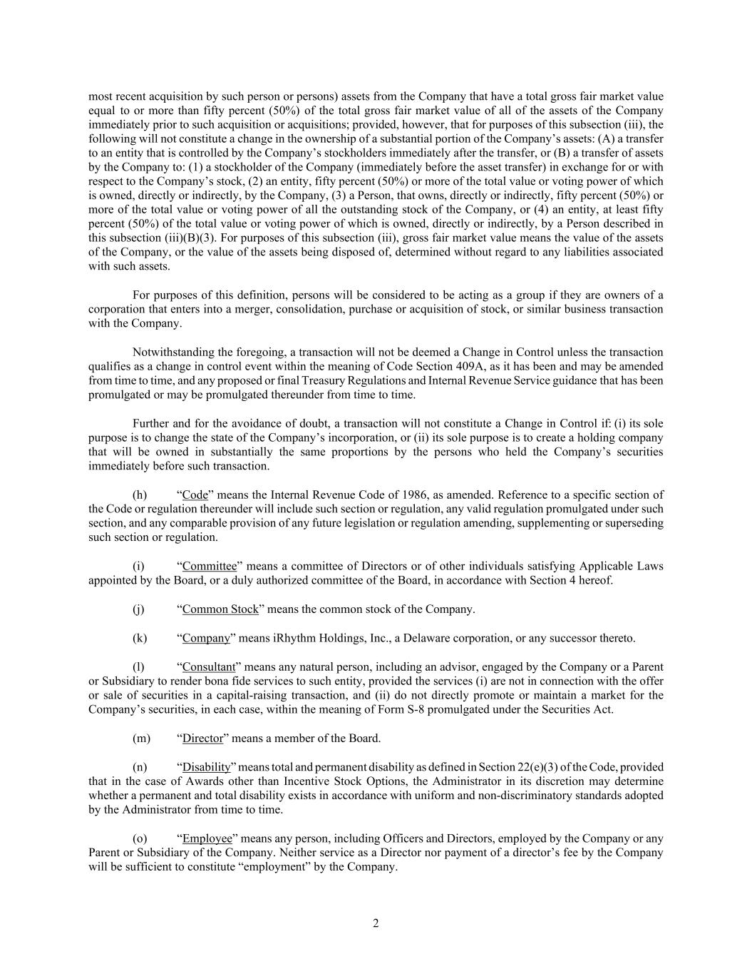 2 most recent acquisition by such person or persons) assets from the Company that have a total gross fair market value equal to or more than fifty percent (50%) of the total gross fair market value of all of the assets of the Company immediately prior to such acquisition or acquisitions; provided, however, that for purposes of this subsection (iii), the following will not constitute a change in the ownership of a substantial portion of the Company’s assets: (A) a transfer to an entity that is controlled by the Company’s stockholders immediately after the transfer, or (B) a transfer of assets by the Company to: (1) a stockholder of the Company (immediately before the asset transfer) in exchange for or with respect to the Company’s stock, (2) an entity, fifty percent (50%) or more of the total value or voting power of which is owned, directly or indirectly, by the Company, (3) a Person, that owns, directly or indirectly, fifty percent (50%) or more of the total value or voting power of all the outstanding stock of the Company, or (4) an entity, at least fifty percent (50%) of the total value or voting power of which is owned, directly or indirectly, by a Person described in this subsection (iii)(B)(3). For purposes of this subsection (iii), gross fair market value means the value of the assets of the Company, or the value of the assets being disposed of, determined without regard to any liabilities associated with such assets. For purposes of this definition, persons will be considered to be acting as a group if they are owners of a corporation that enters into a merger, consolidation, purchase or acquisition of stock, or similar business transaction with the Company. Notwithstanding the foregoing, a transaction will not be deemed a Change in Control unless the transaction qualifies as a change in control event within the meaning of Code Section 409A, as it has been and may be amended from time to time, and any proposed or final Treasury Regulations and Internal Revenue Service guidance that has been promulgated or may be promulgated thereunder from time to time. Further and for the avoidance of doubt, a transaction will not constitute a Change in Control if: (i) its sole purpose is to change the state of the Company’s incorporation, or (ii) its sole purpose is to create a holding company that will be owned in substantially the same proportions by the persons who held the Company’s securities immediately before such transaction. (h) “Code” means the Internal Revenue Code of 1986, as amended. Reference to a specific section of the Code or regulation thereunder will include such section or regulation, any valid regulation promulgated under such section, and any comparable provision of any future legislation or regulation amending, supplementing or superseding such section or regulation. (i) “Committee” means a committee of Directors or of other individuals satisfying Applicable Laws appointed by the Board, or a duly authorized committee of the Board, in accordance with Section 4 hereof. (j) “Common Stock” means the common stock of the Company. (k) “Company” means iRhythm Holdings, Inc., a Delaware corporation, or any successor thereto. (l) “Consultant” means any natural person, including an advisor, engaged by the Company or a Parent or Subsidiary to render bona fide services to such entity, provided the services (i) are not in connection with the offer or sale of securities in a capital-raising transaction, and (ii) do not directly promote or maintain a market for the Company’s securities, in each case, within the meaning of Form S-8 promulgated under the Securities Act. (m) “Director” means a member of the Board. (n) “Disability” means total and permanent disability as defined in Section 22(e)(3) of the Code, provided that in the case of Awards other than Incentive Stock Options, the Administrator in its discretion may determine whether a permanent and total disability exists in accordance with uniform and non-discriminatory standards adopted by the Administrator from time to time. (o) “Employee” means any person, including Officers and Directors, employed by the Company or any Parent or Subsidiary of the Company. Neither service as a Director nor payment of a director’s fee by the Company will be sufficient to constitute “employment” by the Company.