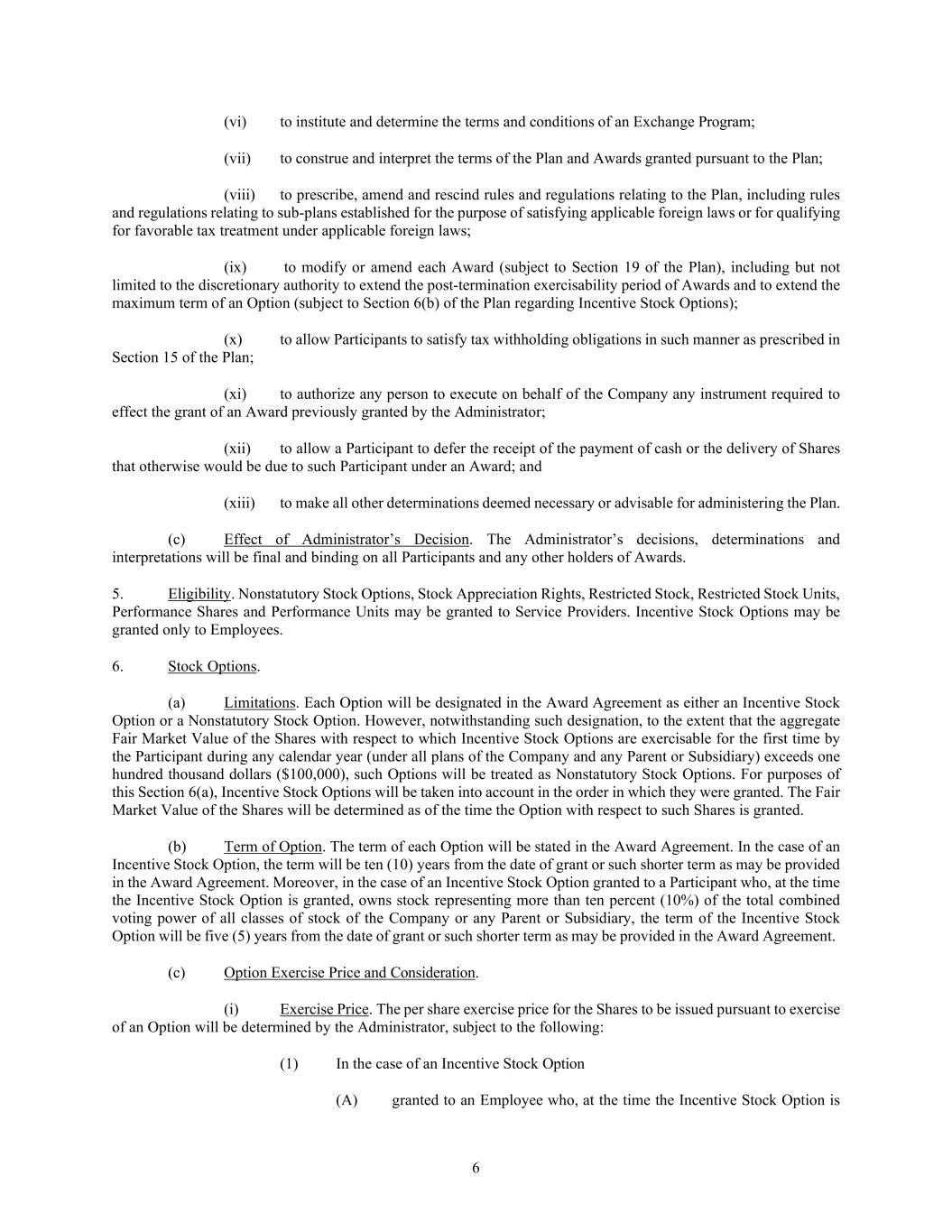 6 (vi) to institute and determine the terms and conditions of an Exchange Program; (vii) to construe and interpret the terms of the Plan and Awards granted pursuant to the Plan; (viii) to prescribe, amend and rescind rules and regulations relating to the Plan, including rules and regulations relating to sub-plans established for the purpose of satisfying applicable foreign laws or for qualifying for favorable tax treatment under applicable foreign laws; (ix) to modify or amend each Award (subject to Section 19 of the Plan), including but not limited to the discretionary authority to extend the post-termination exercisability period of Awards and to extend the maximum term of an Option (subject to Section 6(b) of the Plan regarding Incentive Stock Options); (x) to allow Participants to satisfy tax withholding obligations in such manner as prescribed in Section 15 of the Plan; (xi) to authorize any person to execute on behalf of the Company any instrument required to effect the grant of an Award previously granted by the Administrator; (xii) to allow a Participant to defer the receipt of the payment of cash or the delivery of Shares that otherwise would be due to such Participant under an Award; and (xiii) to make all other determinations deemed necessary or advisable for administering the Plan. (c) Effect of Administrator’s Decision. The Administrator’s decisions, determinations and interpretations will be final and binding on all Participants and any other holders of Awards. 5. Eligibility. Nonstatutory Stock Options, Stock Appreciation Rights, Restricted Stock, Restricted Stock Units, Performance Shares and Performance Units may be granted to Service Providers. Incentive Stock Options may be granted only to Employees. 6. Stock Options. (a) Limitations. Each Option will be designated in the Award Agreement as either an Incentive Stock Option or a Nonstatutory Stock Option. However, notwithstanding such designation, to the extent that the aggregate Fair Market Value of the Shares with respect to which Incentive Stock Options are exercisable for the first time by the Participant during any calendar year (under all plans of the Company and any Parent or Subsidiary) exceeds one hundred thousand dollars ($100,000), such Options will be treated as Nonstatutory Stock Options. For purposes of this Section 6(a), Incentive Stock Options will be taken into account in the order in which they were granted. The Fair Market Value of the Shares will be determined as of the time the Option with respect to such Shares is granted. (b) Term of Option. The term of each Option will be stated in the Award Agreement. In the case of an Incentive Stock Option, the term will be ten (10) years from the date of grant or such shorter term as may be provided in the Award Agreement. Moreover, in the case of an Incentive Stock Option granted to a Participant who, at the time the Incentive Stock Option is granted, owns stock representing more than ten percent (10%) of the total combined voting power of all classes of stock of the Company or any Parent or Subsidiary, the term of the Incentive Stock Option will be five (5) years from the date of grant or such shorter term as may be provided in the Award Agreement. (c) Option Exercise Price and Consideration. (i) Exercise Price. The per share exercise price for the Shares to be issued pursuant to exercise of an Option will be determined by the Administrator, subject to the following: (1) In the case of an Incentive Stock Option (A) granted to an Employee who, at the time the Incentive Stock Option is