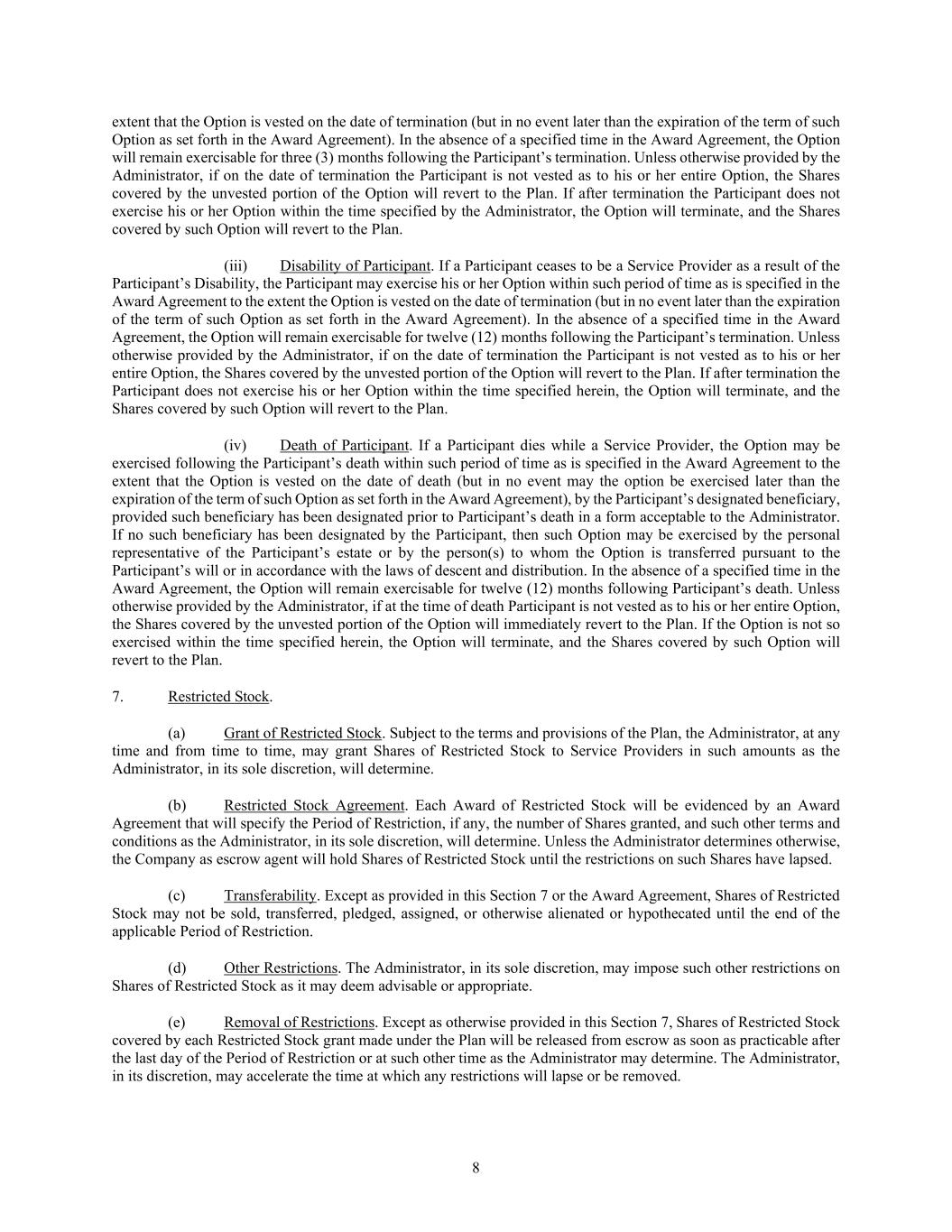 8 extent that the Option is vested on the date of termination (but in no event later than the expiration of the term of such Option as set forth in the Award Agreement). In the absence of a specified time in the Award Agreement, the Option will remain exercisable for three (3) months following the Participant’s termination. Unless otherwise provided by the Administrator, if on the date of termination the Participant is not vested as to his or her entire Option, the Shares covered by the unvested portion of the Option will revert to the Plan. If after termination the Participant does not exercise his or her Option within the time specified by the Administrator, the Option will terminate, and the Shares covered by such Option will revert to the Plan. (iii) Disability of Participant. If a Participant ceases to be a Service Provider as a result of the Participant’s Disability, the Participant may exercise his or her Option within such period of time as is specified in the Award Agreement to the extent the Option is vested on the date of termination (but in no event later than the expiration of the term of such Option as set forth in the Award Agreement). In the absence of a specified time in the Award Agreement, the Option will remain exercisable for twelve (12) months following the Participant’s termination. Unless otherwise provided by the Administrator, if on the date of termination the Participant is not vested as to his or her entire Option, the Shares covered by the unvested portion of the Option will revert to the Plan. If after termination the Participant does not exercise his or her Option within the time specified herein, the Option will terminate, and the Shares covered by such Option will revert to the Plan. (iv) Death of Participant. If a Participant dies while a Service Provider, the Option may be exercised following the Participant’s death within such period of time as is specified in the Award Agreement to the extent that the Option is vested on the date of death (but in no event may the option be exercised later than the expiration of the term of such Option as set forth in the Award Agreement), by the Participant’s designated beneficiary, provided such beneficiary has been designated prior to Participant’s death in a form acceptable to the Administrator. If no such beneficiary has been designated by the Participant, then such Option may be exercised by the personal representative of the Participant’s estate or by the person(s) to whom the Option is transferred pursuant to the Participant’s will or in accordance with the laws of descent and distribution. In the absence of a specified time in the Award Agreement, the Option will remain exercisable for twelve (12) months following Participant’s death. Unless otherwise provided by the Administrator, if at the time of death Participant is not vested as to his or her entire Option, the Shares covered by the unvested portion of the Option will immediately revert to the Plan. If the Option is not so exercised within the time specified herein, the Option will terminate, and the Shares covered by such Option will revert to the Plan. 7. Restricted Stock. (a) Grant of Restricted Stock. Subject to the terms and provisions of the Plan, the Administrator, at any time and from time to time, may grant Shares of Restricted Stock to Service Providers in such amounts as the Administrator, in its sole discretion, will determine. (b) Restricted Stock Agreement. Each Award of Restricted Stock will be evidenced by an Award Agreement that will specify the Period of Restriction, if any, the number of Shares granted, and such other terms and conditions as the Administrator, in its sole discretion, will determine. Unless the Administrator determines otherwise, the Company as escrow agent will hold Shares of Restricted Stock until the restrictions on such Shares have lapsed. (c) Transferability. Except as provided in this Section 7 or the Award Agreement, Shares of Restricted Stock may not be sold, transferred, pledged, assigned, or otherwise alienated or hypothecated until the end of the applicable Period of Restriction. (d) Other Restrictions. The Administrator, in its sole discretion, may impose such other restrictions on Shares of Restricted Stock as it may deem advisable or appropriate. (e) Removal of Restrictions. Except as otherwise provided in this Section 7, Shares of Restricted Stock covered by each Restricted Stock grant made under the Plan will be released from escrow as soon as practicable after the last day of the Period of Restriction or at such other time as the Administrator may determine. The Administrator, in its discretion, may accelerate the time at which any restrictions will lapse or be removed.