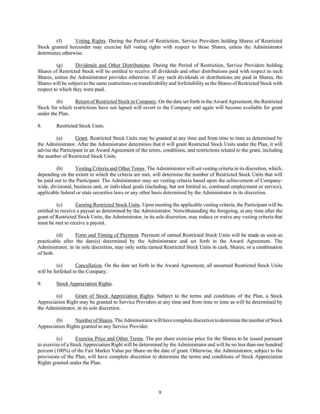 9 (f) Voting Rights. During the Period of Restriction, Service Providers holding Shares of Restricted Stock granted hereunder may exercise full voting rights with respect to those Shares, unless the Administrator determines otherwise. (g) Dividends and Other Distributions. During the Period of Restriction, Service Providers holding Shares of Restricted Stock will be entitled to receive all dividends and other distributions paid with respect to such Shares, unless the Administrator provides otherwise. If any such dividends or distributions are paid in Shares, the Shares will be subject to the same restrictions on transferability and forfeitability as the Shares of Restricted Stock with respect to which they were paid. (h) Return of Restricted Stock to Company. On the date set forth in the Award Agreement, the Restricted Stock for which restrictions have not lapsed will revert to the Company and again will become available for grant under the Plan. 8. Restricted Stock Units. (a) Grant. Restricted Stock Units may be granted at any time and from time to time as determined by the Administrator. After the Administrator determines that it will grant Restricted Stock Units under the Plan, it will advise the Participant in an Award Agreement of the terms, conditions, and restrictions related to the grant, including the number of Restricted Stock Units. (b) Vesting Criteria and Other Terms. The Administrator will set vesting criteria in its discretion, which, depending on the extent to which the criteria are met, will determine the number of Restricted Stock Units that will be paid out to the Participant. The Administrator may set vesting criteria based upon the achievement of Company- wide, divisional, business unit, or individual goals (including, but not limited to, continued employment or service), applicable federal or state securities laws or any other basis determined by the Administrator in its discretion. (c) Earning Restricted Stock Units. Upon meeting the applicable vesting criteria, the Participant will be entitled to receive a payout as determined by the Administrator. Notwithstanding the foregoing, at any time after the grant of Restricted Stock Units, the Administrator, in its sole discretion, may reduce or waive any vesting criteria that must be met to receive a payout. (d) Form and Timing of Payment. Payment of earned Restricted Stock Units will be made as soon as practicable after the date(s) determined by the Administrator and set forth in the Award Agreement. The Administrator, in its sole discretion, may only settle earned Restricted Stock Units in cash, Shares, or a combination of both. (e) Cancellation. On the date set forth in the Award Agreement, all unearned Restricted Stock Units will be forfeited to the Company. 9. Stock Appreciation Rights. (a) Grant of Stock Appreciation Rights. Subject to the terms and conditions of the Plan, a Stock Appreciation Right may be granted to Service Providers at any time and from time to time as will be determined by the Administrator, in its sole discretion. (b) Number of Shares. The Administrator will have complete discretion to determine the number of Stock Appreciation Rights granted to any Service Provider. (c) Exercise Price and Other Terms. The per share exercise price for the Shares to be issued pursuant to exercise of a Stock Appreciation Right will be determined by the Administrator and will be no less than one hundred percent (100%) of the Fair Market Value per Share on the date of grant. Otherwise, the Administrator, subject to the provisions of the Plan, will have complete discretion to determine the terms and conditions of Stock Appreciation Rights granted under the Plan.