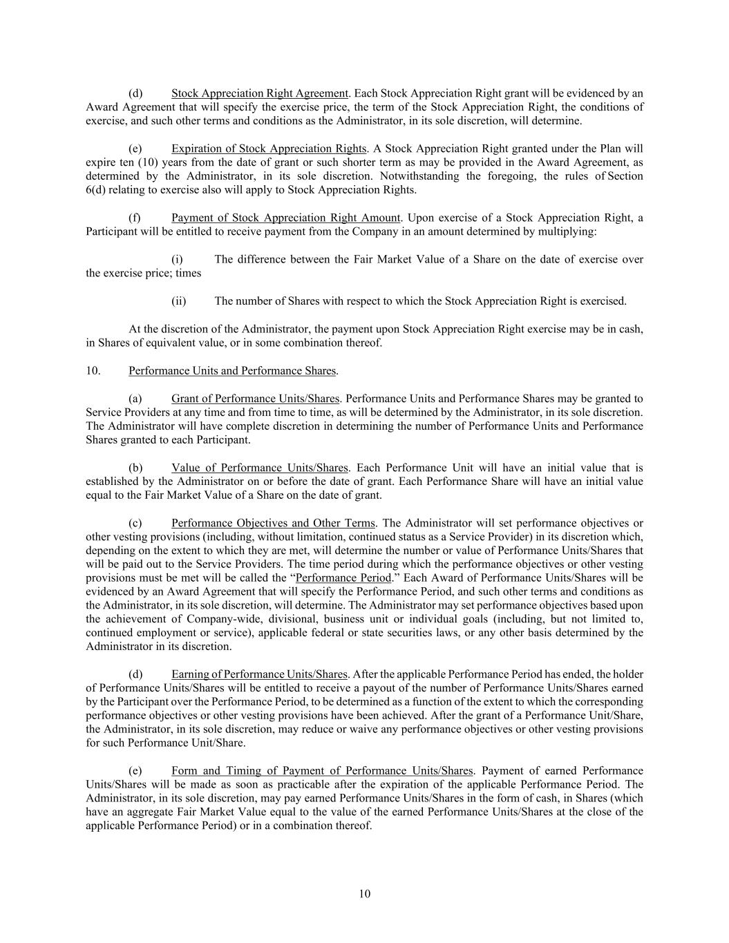 10 (d) Stock Appreciation Right Agreement. Each Stock Appreciation Right grant will be evidenced by an Award Agreement that will specify the exercise price, the term of the Stock Appreciation Right, the conditions of exercise, and such other terms and conditions as the Administrator, in its sole discretion, will determine. (e) Expiration of Stock Appreciation Rights. A Stock Appreciation Right granted under the Plan will expire ten (10) years from the date of grant or such shorter term as may be provided in the Award Agreement, as determined by the Administrator, in its sole discretion. Notwithstanding the foregoing, the rules of Section 6(d) relating to exercise also will apply to Stock Appreciation Rights. (f) Payment of Stock Appreciation Right Amount. Upon exercise of a Stock Appreciation Right, a Participant will be entitled to receive payment from the Company in an amount determined by multiplying: (i) The difference between the Fair Market Value of a Share on the date of exercise over the exercise price; times (ii) The number of Shares with respect to which the Stock Appreciation Right is exercised. At the discretion of the Administrator, the payment upon Stock Appreciation Right exercise may be in cash, in Shares of equivalent value, or in some combination thereof. 10. Performance Units and Performance Shares. (a) Grant of Performance Units/Shares. Performance Units and Performance Shares may be granted to Service Providers at any time and from time to time, as will be determined by the Administrator, in its sole discretion. The Administrator will have complete discretion in determining the number of Performance Units and Performance Shares granted to each Participant. (b) Value of Performance Units/Shares. Each Performance Unit will have an initial value that is established by the Administrator on or before the date of grant. Each Performance Share will have an initial value equal to the Fair Market Value of a Share on the date of grant. (c) Performance Objectives and Other Terms. The Administrator will set performance objectives or other vesting provisions (including, without limitation, continued status as a Service Provider) in its discretion which, depending on the extent to which they are met, will determine the number or value of Performance Units/Shares that will be paid out to the Service Providers. The time period during which the performance objectives or other vesting provisions must be met will be called the “Performance Period.” Each Award of Performance Units/Shares will be evidenced by an Award Agreement that will specify the Performance Period, and such other terms and conditions as the Administrator, in its sole discretion, will determine. The Administrator may set performance objectives based upon the achievement of Company-wide, divisional, business unit or individual goals (including, but not limited to, continued employment or service), applicable federal or state securities laws, or any other basis determined by the Administrator in its discretion. (d) Earning of Performance Units/Shares. After the applicable Performance Period has ended, the holder of Performance Units/Shares will be entitled to receive a payout of the number of Performance Units/Shares earned by the Participant over the Performance Period, to be determined as a function of the extent to which the corresponding performance objectives or other vesting provisions have been achieved. After the grant of a Performance Unit/Share, the Administrator, in its sole discretion, may reduce or waive any performance objectives or other vesting provisions for such Performance Unit/Share. (e) Form and Timing of Payment of Performance Units/Shares. Payment of earned Performance Units/Shares will be made as soon as practicable after the expiration of the applicable Performance Period. The Administrator, in its sole discretion, may pay earned Performance Units/Shares in the form of cash, in Shares (which have an aggregate Fair Market Value equal to the value of the earned Performance Units/Shares at the close of the applicable Performance Period) or in a combination thereof.
