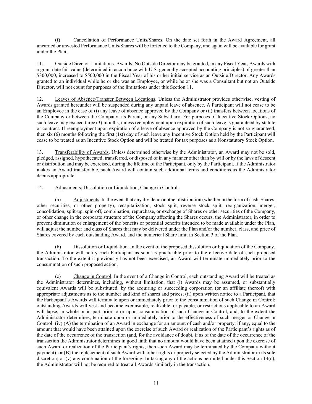 11 (f) Cancellation of Performance Units/Shares. On the date set forth in the Award Agreement, all unearned or unvested Performance Units/Shares will be forfeited to the Company, and again will be available for grant under the Plan. 11. Outside Director Limitations. Awards. No Outside Director may be granted, in any Fiscal Year, Awards with a grant date fair value (determined in accordance with U.S. generally accepted accounting principles) of greater than $300,000, increased to $500,000 in the Fiscal Year of his or her initial service as an Outside Director. Any Awards granted to an individual while he or she was an Employee, or while he or she was a Consultant but not an Outside Director, will not count for purposes of the limitations under this Section 11. 12. Leaves of Absence/Transfer Between Locations. Unless the Administrator provides otherwise, vesting of Awards granted hereunder will be suspended during any unpaid leave of absence. A Participant will not cease to be an Employee in the case of (i) any leave of absence approved by the Company or (ii) transfers between locations of the Company or between the Company, its Parent, or any Subsidiary. For purposes of Incentive Stock Options, no such leave may exceed three (3) months, unless reemployment upon expiration of such leave is guaranteed by statute or contract. If reemployment upon expiration of a leave of absence approved by the Company is not so guaranteed, then six (6) months following the first (1st) day of such leave any Incentive Stock Option held by the Participant will cease to be treated as an Incentive Stock Option and will be treated for tax purposes as a Nonstatutory Stock Option. 13. Transferability of Awards. Unless determined otherwise by the Administrator, an Award may not be sold, pledged, assigned, hypothecated, transferred, or disposed of in any manner other than by will or by the laws of descent or distribution and may be exercised, during the lifetime of the Participant, only by the Participant. If the Administrator makes an Award transferable, such Award will contain such additional terms and conditions as the Administrator deems appropriate. 14. Adjustments; Dissolution or Liquidation; Change in Control. (a) Adjustments. In the event that any dividend or other distribution (whether in the form of cash, Shares, other securities, or other property), recapitalization, stock split, reverse stock split, reorganization, merger, consolidation, split-up, spin-off, combination, repurchase, or exchange of Shares or other securities of the Company, or other change in the corporate structure of the Company affecting the Shares occurs, the Administrator, in order to prevent diminution or enlargement of the benefits or potential benefits intended to be made available under the Plan, will adjust the number and class of Shares that may be delivered under the Plan and/or the number, class, and price of Shares covered by each outstanding Award, and the numerical Share limit in Section 3 of the Plan. (b) Dissolution or Liquidation. In the event of the proposed dissolution or liquidation of the Company, the Administrator will notify each Participant as soon as practicable prior to the effective date of such proposed transaction. To the extent it previously has not been exercised, an Award will terminate immediately prior to the consummation of such proposed action. (c) Change in Control. In the event of a Change in Control, each outstanding Award will be treated as the Administrator determines, including, without limitation, that (i) Awards may be assumed, or substantially equivalent Awards will be substituted, by the acquiring or succeeding corporation (or an affiliate thereof) with appropriate adjustments as to the number and kind of shares and prices; (ii) upon written notice to a Participant, that the Participant’s Awards will terminate upon or immediately prior to the consummation of such Change in Control; outstanding Awards will vest and become exercisable, realizable, or payable, or restrictions applicable to an Award will lapse, in whole or in part prior to or upon consummation of such Change in Control, and, to the extent the Administrator determines, terminate upon or immediately prior to the effectiveness of such merger or Change in Control; (iv) (A) the termination of an Award in exchange for an amount of cash and/or property, if any, equal to the amount that would have been attained upon the exercise of such Award or realization of the Participant’s rights as of the date of the occurrence of the transaction (and, for the avoidance of doubt, if as of the date of the occurrence of the transaction the Administrator determines in good faith that no amount would have been attained upon the exercise of such Award or realization of the Participant’s rights, then such Award may be terminated by the Company without payment), or (B) the replacement of such Award with other rights or property selected by the Administrator in its sole discretion; or (v) any combination of the foregoing. In taking any of the actions permitted under this Section 14(c), the Administrator will not be required to treat all Awards similarly in the transaction.
