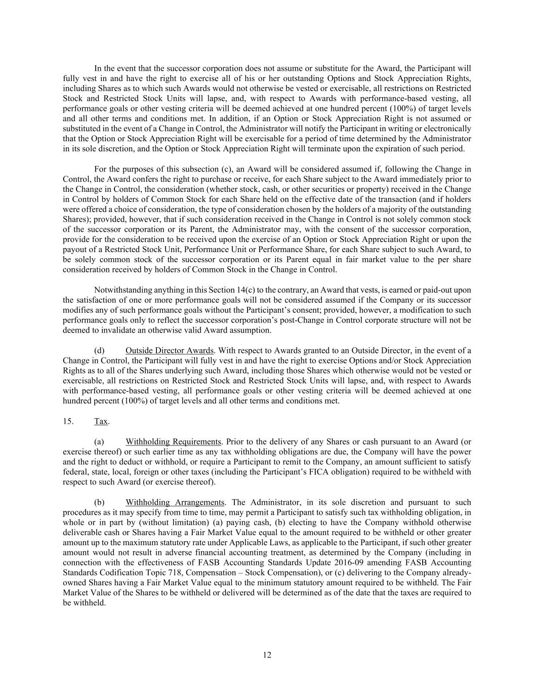 12 In the event that the successor corporation does not assume or substitute for the Award, the Participant will fully vest in and have the right to exercise all of his or her outstanding Options and Stock Appreciation Rights, including Shares as to which such Awards would not otherwise be vested or exercisable, all restrictions on Restricted Stock and Restricted Stock Units will lapse, and, with respect to Awards with performance-based vesting, all performance goals or other vesting criteria will be deemed achieved at one hundred percent (100%) of target levels and all other terms and conditions met. In addition, if an Option or Stock Appreciation Right is not assumed or substituted in the event of a Change in Control, the Administrator will notify the Participant in writing or electronically that the Option or Stock Appreciation Right will be exercisable for a period of time determined by the Administrator in its sole discretion, and the Option or Stock Appreciation Right will terminate upon the expiration of such period. For the purposes of this subsection (c), an Award will be considered assumed if, following the Change in Control, the Award confers the right to purchase or receive, for each Share subject to the Award immediately prior to the Change in Control, the consideration (whether stock, cash, or other securities or property) received in the Change in Control by holders of Common Stock for each Share held on the effective date of the transaction (and if holders were offered a choice of consideration, the type of consideration chosen by the holders of a majority of the outstanding Shares); provided, however, that if such consideration received in the Change in Control is not solely common stock of the successor corporation or its Parent, the Administrator may, with the consent of the successor corporation, provide for the consideration to be received upon the exercise of an Option or Stock Appreciation Right or upon the payout of a Restricted Stock Unit, Performance Unit or Performance Share, for each Share subject to such Award, to be solely common stock of the successor corporation or its Parent equal in fair market value to the per share consideration received by holders of Common Stock in the Change in Control. Notwithstanding anything in this Section 14(c) to the contrary, an Award that vests, is earned or paid-out upon the satisfaction of one or more performance goals will not be considered assumed if the Company or its successor modifies any of such performance goals without the Participant’s consent; provided, however, a modification to such performance goals only to reflect the successor corporation’s post-Change in Control corporate structure will not be deemed to invalidate an otherwise valid Award assumption. (d) Outside Director Awards. With respect to Awards granted to an Outside Director, in the event of a Change in Control, the Participant will fully vest in and have the right to exercise Options and/or Stock Appreciation Rights as to all of the Shares underlying such Award, including those Shares which otherwise would not be vested or exercisable, all restrictions on Restricted Stock and Restricted Stock Units will lapse, and, with respect to Awards with performance-based vesting, all performance goals or other vesting criteria will be deemed achieved at one hundred percent (100%) of target levels and all other terms and conditions met. 15. Tax. (a) Withholding Requirements. Prior to the delivery of any Shares or cash pursuant to an Award (or exercise thereof) or such earlier time as any tax withholding obligations are due, the Company will have the power and the right to deduct or withhold, or require a Participant to remit to the Company, an amount sufficient to satisfy federal, state, local, foreign or other taxes (including the Participant’s FICA obligation) required to be withheld with respect to such Award (or exercise thereof). (b) Withholding Arrangements. The Administrator, in its sole discretion and pursuant to such procedures as it may specify from time to time, may permit a Participant to satisfy such tax withholding obligation, in whole or in part by (without limitation) (a) paying cash, (b) electing to have the Company withhold otherwise deliverable cash or Shares having a Fair Market Value equal to the amount required to be withheld or other greater amount up to the maximum statutory rate under Applicable Laws, as applicable to the Participant, if such other greater amount would not result in adverse financial accounting treatment, as determined by the Company (including in connection with the effectiveness of FASB Accounting Standards Update 2016-09 amending FASB Accounting Standards Codification Topic 718, Compensation – Stock Compensation), or (c) delivering to the Company already- owned Shares having a Fair Market Value equal to the minimum statutory amount required to be withheld. The Fair Market Value of the Shares to be withheld or delivered will be determined as of the date that the taxes are required to be withheld.