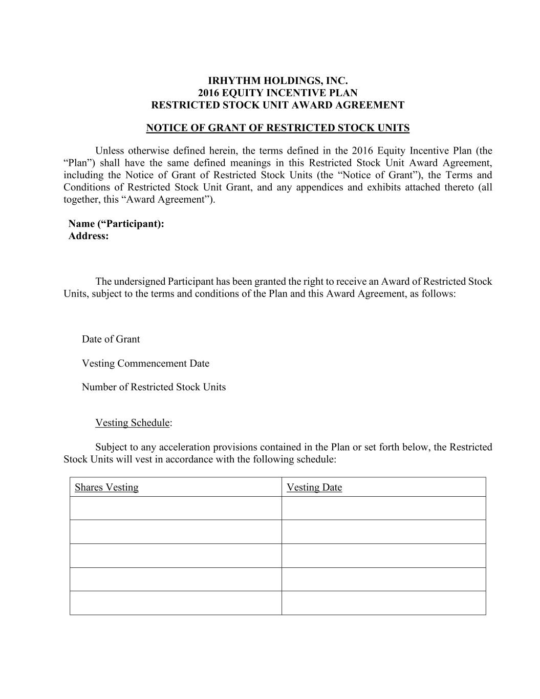 IRHYTHM HOLDINGS, INC. 2016 EQUITY INCENTIVE PLAN RESTRICTED STOCK UNIT AWARD AGREEMENT NOTICE OF GRANT OF RESTRICTED STOCK UNITS Unless otherwise defined herein, the terms defined in the 2016 Equity Incentive Plan (the “Plan”) shall have the same defined meanings in this Restricted Stock Unit Award Agreement, including the Notice of Grant of Restricted Stock Units (the “Notice of Grant”), the Terms and Conditions of Restricted Stock Unit Grant, and any appendices and exhibits attached thereto (all together, this “Award Agreement”). Name (“Participant): Address: The undersigned Participant has been granted the right to receive an Award of Restricted Stock Units, subject to the terms and conditions of the Plan and this Award Agreement, as follows: Date of Grant Vesting Commencement Date Number of Restricted Stock Units Vesting Schedule: Subject to any acceleration provisions contained in the Plan or set forth below, the Restricted Stock Units will vest in accordance with the following schedule: Shares Vesting Vesting Date