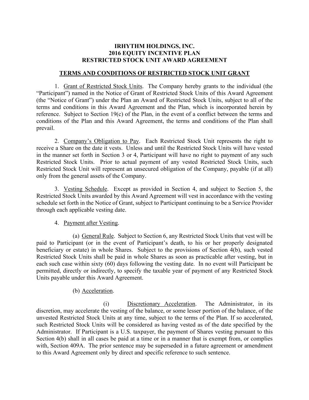 IRHYTHM HOLDINGS, INC. 2016 EQUITY INCENTIVE PLAN RESTRICTED STOCK UNIT AWARD AGREEMENT TERMS AND CONDITIONS OF RESTRICTED STOCK UNIT GRANT 1. Grant of Restricted Stock Units. The Company hereby grants to the individual (the “Participant”) named in the Notice of Grant of Restricted Stock Units of this Award Agreement (the “Notice of Grant”) under the Plan an Award of Restricted Stock Units, subject to all of the terms and conditions in this Award Agreement and the Plan, which is incorporated herein by reference. Subject to Section 19(c) of the Plan, in the event of a conflict between the terms and conditions of the Plan and this Award Agreement, the terms and conditions of the Plan shall prevail. 2. Company’s Obligation to Pay. Each Restricted Stock Unit represents the right to receive a Share on the date it vests. Unless and until the Restricted Stock Units will have vested in the manner set forth in Section 3 or 4, Participant will have no right to payment of any such Restricted Stock Units. Prior to actual payment of any vested Restricted Stock Units, such Restricted Stock Unit will represent an unsecured obligation of the Company, payable (if at all) only from the general assets of the Company. 3. Vesting Schedule. Except as provided in Section 4, and subject to Section 5, the Restricted Stock Units awarded by this Award Agreement will vest in accordance with the vesting schedule set forth in the Notice of Grant, subject to Participant continuing to be a Service Provider through each applicable vesting date. 4. Payment after Vesting. (a) General Rule. Subject to Section 6, any Restricted Stock Units that vest will be paid to Participant (or in the event of Participant’s death, to his or her properly designated beneficiary or estate) in whole Shares. Subject to the provisions of Section 4(b), such vested Restricted Stock Units shall be paid in whole Shares as soon as practicable after vesting, but in each such case within sixty (60) days following the vesting date. In no event will Participant be permitted, directly or indirectly, to specify the taxable year of payment of any Restricted Stock Units payable under this Award Agreement. (b) Acceleration. (i) Discretionary Acceleration. The Administrator, in its discretion, may accelerate the vesting of the balance, or some lesser portion of the balance, of the unvested Restricted Stock Units at any time, subject to the terms of the Plan. If so accelerated, such Restricted Stock Units will be considered as having vested as of the date specified by the Administrator. If Participant is a U.S. taxpayer, the payment of Shares vesting pursuant to this Section 4(b) shall in all cases be paid at a time or in a manner that is exempt from, or complies with, Section 409A. The prior sentence may be superseded in a future agreement or amendment to this Award Agreement only by direct and specific reference to such sentence.
