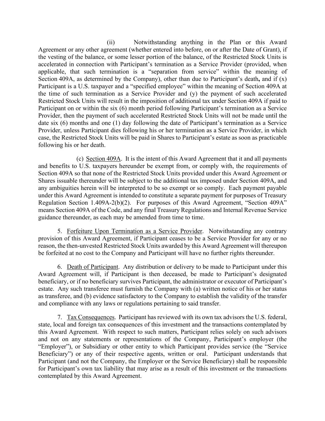 (ii) Notwithstanding anything in the Plan or this Award Agreement or any other agreement (whether entered into before, on or after the Date of Grant), if the vesting of the balance, or some lesser portion of the balance, of the Restricted Stock Units is accelerated in connection with Participant’s termination as a Service Provider (provided, when applicable, that such termination is a “separation from service” within the meaning of Section 409A, as determined by the Company), other than due to Participant’s death, and if (x) Participant is a U.S. taxpayer and a “specified employee” within the meaning of Section 409A at the time of such termination as a Service Provider and (y) the payment of such accelerated Restricted Stock Units will result in the imposition of additional tax under Section 409A if paid to Participant on or within the six (6) month period following Participant’s termination as a Service Provider, then the payment of such accelerated Restricted Stock Units will not be made until the date six (6) months and one (1) day following the date of Participant’s termination as a Service Provider, unless Participant dies following his or her termination as a Service Provider, in which case, the Restricted Stock Units will be paid in Shares to Participant’s estate as soon as practicable following his or her death. (c) Section 409A. It is the intent of this Award Agreement that it and all payments and benefits to U.S. taxpayers hereunder be exempt from, or comply with, the requirements of Section 409A so that none of the Restricted Stock Units provided under this Award Agreement or Shares issuable thereunder will be subject to the additional tax imposed under Section 409A, and any ambiguities herein will be interpreted to be so exempt or so comply. Each payment payable under this Award Agreement is intended to constitute a separate payment for purposes of Treasury Regulation Section 1.409A-2(b)(2). For purposes of this Award Agreement, “Section 409A” means Section 409A of the Code, and any final Treasury Regulations and Internal Revenue Service guidance thereunder, as each may be amended from time to time. 5. Forfeiture Upon Termination as a Service Provider. Notwithstanding any contrary provision of this Award Agreement, if Participant ceases to be a Service Provider for any or no reason, the then-unvested Restricted Stock Units awarded by this Award Agreement will thereupon be forfeited at no cost to the Company and Participant will have no further rights thereunder. 6. Death of Participant. Any distribution or delivery to be made to Participant under this Award Agreement will, if Participant is then deceased, be made to Participant’s designated beneficiary, or if no beneficiary survives Participant, the administrator or executor of Participant’s estate. Any such transferee must furnish the Company with (a) written notice of his or her status as transferee, and (b) evidence satisfactory to the Company to establish the validity of the transfer and compliance with any laws or regulations pertaining to said transfer. 7. Tax Consequences. Participant has reviewed with its own tax advisors the U.S. federal, state, local and foreign tax consequences of this investment and the transactions contemplated by this Award Agreement. With respect to such matters, Participant relies solely on such advisors and not on any statements or representations of the Company, Participant’s employer (the “Employer”), or Subsidiary or other entity to which Participant provides service (the “Service Beneficiary”) or any of their respective agents, written or oral. Participant understands that Participant (and not the Company, the Employer or the Service Beneficiary) shall be responsible for Participant’s own tax liability that may arise as a result of this investment or the transactions contemplated by this Award Agreement.