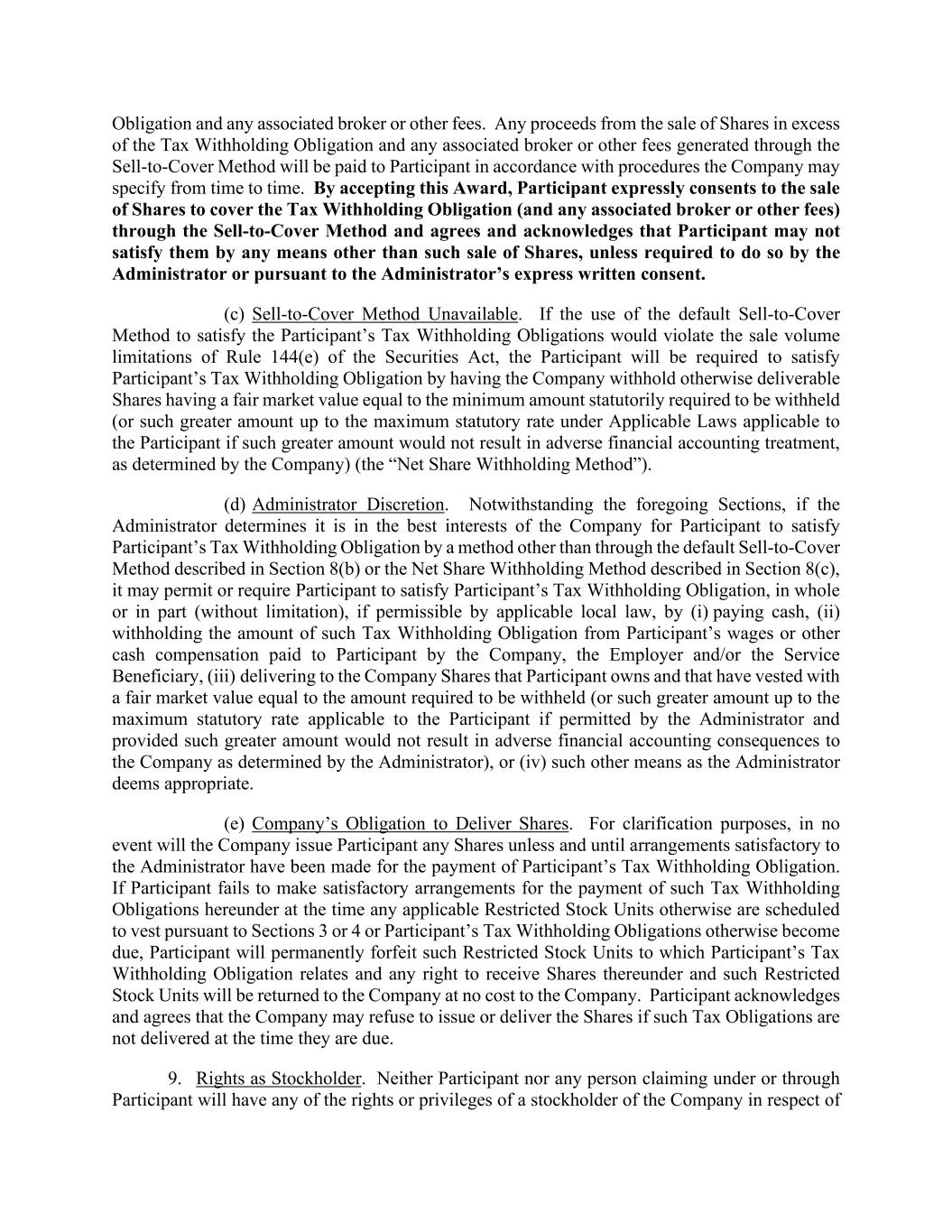 Obligation and any associated broker or other fees. Any proceeds from the sale of Shares in excess of the Tax Withholding Obligation and any associated broker or other fees generated through the Sell-to-Cover Method will be paid to Participant in accordance with procedures the Company may specify from time to time. By accepting this Award, Participant expressly consents to the sale of Shares to cover the Tax Withholding Obligation (and any associated broker or other fees) through the Sell-to-Cover Method and agrees and acknowledges that Participant may not satisfy them by any means other than such sale of Shares, unless required to do so by the Administrator or pursuant to the Administrator’s express written consent. (c) Sell-to-Cover Method Unavailable. If the use of the default Sell-to-Cover Method to satisfy the Participant’s Tax Withholding Obligations would violate the sale volume limitations of Rule 144(e) of the Securities Act, the Participant will be required to satisfy Participant’s Tax Withholding Obligation by having the Company withhold otherwise deliverable Shares having a fair market value equal to the minimum amount statutorily required to be withheld (or such greater amount up to the maximum statutory rate under Applicable Laws applicable to the Participant if such greater amount would not result in adverse financial accounting treatment, as determined by the Company) (the “Net Share Withholding Method”). (d) Administrator Discretion. Notwithstanding the foregoing Sections, if the Administrator determines it is in the best interests of the Company for Participant to satisfy Participant’s Tax Withholding Obligation by a method other than through the default Sell-to-Cover Method described in Section 8(b) or the Net Share Withholding Method described in Section 8(c), it may permit or require Participant to satisfy Participant’s Tax Withholding Obligation, in whole or in part (without limitation), if permissible by applicable local law, by (i) paying cash, (ii) withholding the amount of such Tax Withholding Obligation from Participant’s wages or other cash compensation paid to Participant by the Company, the Employer and/or the Service Beneficiary, (iii) delivering to the Company Shares that Participant owns and that have vested with a fair market value equal to the amount required to be withheld (or such greater amount up to the maximum statutory rate applicable to the Participant if permitted by the Administrator and provided such greater amount would not result in adverse financial accounting consequences to the Company as determined by the Administrator), or (iv) such other means as the Administrator deems appropriate. (e) Company’s Obligation to Deliver Shares. For clarification purposes, in no event will the Company issue Participant any Shares unless and until arrangements satisfactory to the Administrator have been made for the payment of Participant’s Tax Withholding Obligation. If Participant fails to make satisfactory arrangements for the payment of such Tax Withholding Obligations hereunder at the time any applicable Restricted Stock Units otherwise are scheduled to vest pursuant to Sections 3 or 4 or Participant’s Tax Withholding Obligations otherwise become due, Participant will permanently forfeit such Restricted Stock Units to which Participant’s Tax Withholding Obligation relates and any right to receive Shares thereunder and such Restricted Stock Units will be returned to the Company at no cost to the Company. Participant acknowledges and agrees that the Company may refuse to issue or deliver the Shares if such Tax Obligations are not delivered at the time they are due. 9. Rights as Stockholder. Neither Participant nor any person claiming under or through Participant will have any of the rights or privileges of a stockholder of the Company in respect of