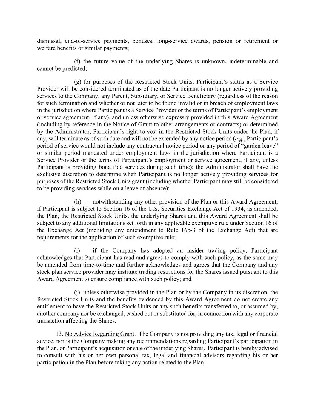dismissal, end-of-service payments, bonuses, long-service awards, pension or retirement or welfare benefits or similar payments; (f) the future value of the underlying Shares is unknown, indeterminable and cannot be predicted; (g) for purposes of the Restricted Stock Units, Participant’s status as a Service Provider will be considered terminated as of the date Participant is no longer actively providing services to the Company, any Parent, Subsidiary, or Service Beneficiary (regardless of the reason for such termination and whether or not later to be found invalid or in breach of employment laws in the jurisdiction where Participant is a Service Provider or the terms of Participant’s employment or service agreement, if any), and unless otherwise expressly provided in this Award Agreement (including by reference in the Notice of Grant to other arrangements or contracts) or determined by the Administrator, Participant’s right to vest in the Restricted Stock Units under the Plan, if any, will terminate as of such date and will not be extended by any notice period (e.g., Participant’s period of service would not include any contractual notice period or any period of “garden leave” or similar period mandated under employment laws in the jurisdiction where Participant is a Service Provider or the terms of Participant’s employment or service agreement, if any, unless Participant is providing bona fide services during such time); the Administrator shall have the exclusive discretion to determine when Participant is no longer actively providing services for purposes of the Restricted Stock Units grant (including whether Participant may still be considered to be providing services while on a leave of absence); (h) notwithstanding any other provision of the Plan or this Award Agreement, if Participant is subject to Section 16 of the U.S. Securities Exchange Act of 1934, as amended, the Plan, the Restricted Stock Units, the underlying Shares and this Award Agreement shall be subject to any additional limitations set forth in any applicable exemptive rule under Section 16 of the Exchange Act (including any amendment to Rule 16b-3 of the Exchange Act) that are requirements for the application of such exemptive rule; (i) if the Company has adopted an insider trading policy, Participant acknowledges that Participant has read and agrees to comply with such policy, as the same may be amended from time-to-time and further acknowledges and agrees that the Company and any stock plan service provider may institute trading restrictions for the Shares issued pursuant to this Award Agreement to ensure compliance with such policy; and (j) unless otherwise provided in the Plan or by the Company in its discretion, the Restricted Stock Units and the benefits evidenced by this Award Agreement do not create any entitlement to have the Restricted Stock Units or any such benefits transferred to, or assumed by, another company nor be exchanged, cashed out or substituted for, in connection with any corporate transaction affecting the Shares. 13. No Advice Regarding Grant. The Company is not providing any tax, legal or financial advice, nor is the Company making any recommendations regarding Participant’s participation in the Plan, or Participant’s acquisition or sale of the underlying Shares. Participant is hereby advised to consult with his or her own personal tax, legal and financial advisors regarding his or her participation in the Plan before taking any action related to the Plan.