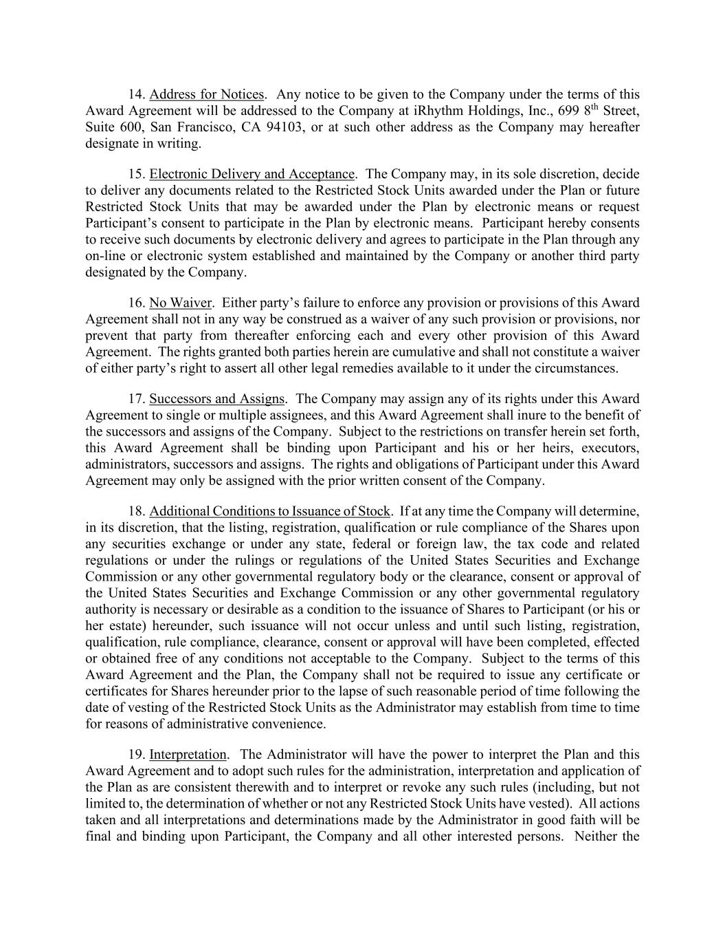 14. Address for Notices. Any notice to be given to the Company under the terms of this Award Agreement will be addressed to the Company at iRhythm Holdings, Inc., 699 8th Street, Suite 600, San Francisco, CA 94103, or at such other address as the Company may hereafter designate in writing. 15. Electronic Delivery and Acceptance. The Company may, in its sole discretion, decide to deliver any documents related to the Restricted Stock Units awarded under the Plan or future Restricted Stock Units that may be awarded under the Plan by electronic means or request Participant’s consent to participate in the Plan by electronic means. Participant hereby consents to receive such documents by electronic delivery and agrees to participate in the Plan through any on-line or electronic system established and maintained by the Company or another third party designated by the Company. 16. No Waiver. Either party’s failure to enforce any provision or provisions of this Award Agreement shall not in any way be construed as a waiver of any such provision or provisions, nor prevent that party from thereafter enforcing each and every other provision of this Award Agreement. The rights granted both parties herein are cumulative and shall not constitute a waiver of either party’s right to assert all other legal remedies available to it under the circumstances. 17. Successors and Assigns. The Company may assign any of its rights under this Award Agreement to single or multiple assignees, and this Award Agreement shall inure to the benefit of the successors and assigns of the Company. Subject to the restrictions on transfer herein set forth, this Award Agreement shall be binding upon Participant and his or her heirs, executors, administrators, successors and assigns. The rights and obligations of Participant under this Award Agreement may only be assigned with the prior written consent of the Company. 18. Additional Conditions to Issuance of Stock. If at any time the Company will determine, in its discretion, that the listing, registration, qualification or rule compliance of the Shares upon any securities exchange or under any state, federal or foreign law, the tax code and related regulations or under the rulings or regulations of the United States Securities and Exchange Commission or any other governmental regulatory body or the clearance, consent or approval of the United States Securities and Exchange Commission or any other governmental regulatory authority is necessary or desirable as a condition to the issuance of Shares to Participant (or his or her estate) hereunder, such issuance will not occur unless and until such listing, registration, qualification, rule compliance, clearance, consent or approval will have been completed, effected or obtained free of any conditions not acceptable to the Company. Subject to the terms of this Award Agreement and the Plan, the Company shall not be required to issue any certificate or certificates for Shares hereunder prior to the lapse of such reasonable period of time following the date of vesting of the Restricted Stock Units as the Administrator may establish from time to time for reasons of administrative convenience. 19. Interpretation. The Administrator will have the power to interpret the Plan and this Award Agreement and to adopt such rules for the administration, interpretation and application of the Plan as are consistent therewith and to interpret or revoke any such rules (including, but not limited to, the determination of whether or not any Restricted Stock Units have vested). All actions taken and all interpretations and determinations made by the Administrator in good faith will be final and binding upon Participant, the Company and all other interested persons. Neither the