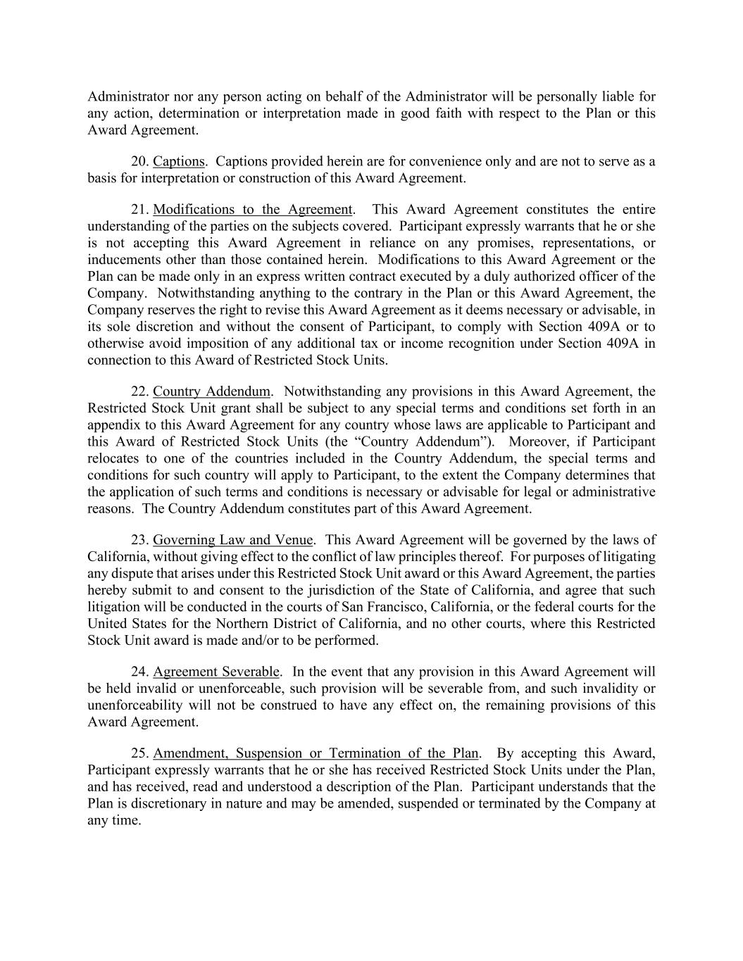 Administrator nor any person acting on behalf of the Administrator will be personally liable for any action, determination or interpretation made in good faith with respect to the Plan or this Award Agreement. 20. Captions. Captions provided herein are for convenience only and are not to serve as a basis for interpretation or construction of this Award Agreement. 21. Modifications to the Agreement. This Award Agreement constitutes the entire understanding of the parties on the subjects covered. Participant expressly warrants that he or she is not accepting this Award Agreement in reliance on any promises, representations, or inducements other than those contained herein. Modifications to this Award Agreement or the Plan can be made only in an express written contract executed by a duly authorized officer of the Company. Notwithstanding anything to the contrary in the Plan or this Award Agreement, the Company reserves the right to revise this Award Agreement as it deems necessary or advisable, in its sole discretion and without the consent of Participant, to comply with Section 409A or to otherwise avoid imposition of any additional tax or income recognition under Section 409A in connection to this Award of Restricted Stock Units. 22. Country Addendum. Notwithstanding any provisions in this Award Agreement, the Restricted Stock Unit grant shall be subject to any special terms and conditions set forth in an appendix to this Award Agreement for any country whose laws are applicable to Participant and this Award of Restricted Stock Units (the “Country Addendum”). Moreover, if Participant relocates to one of the countries included in the Country Addendum, the special terms and conditions for such country will apply to Participant, to the extent the Company determines that the application of such terms and conditions is necessary or advisable for legal or administrative reasons. The Country Addendum constitutes part of this Award Agreement. 23. Governing Law and Venue. This Award Agreement will be governed by the laws of California, without giving effect to the conflict of law principles thereof. For purposes of litigating any dispute that arises under this Restricted Stock Unit award or this Award Agreement, the parties hereby submit to and consent to the jurisdiction of the State of California, and agree that such litigation will be conducted in the courts of San Francisco, California, or the federal courts for the United States for the Northern District of California, and no other courts, where this Restricted Stock Unit award is made and/or to be performed. 24. Agreement Severable. In the event that any provision in this Award Agreement will be held invalid or unenforceable, such provision will be severable from, and such invalidity or unenforceability will not be construed to have any effect on, the remaining provisions of this Award Agreement. 25. Amendment, Suspension or Termination of the Plan. By accepting this Award, Participant expressly warrants that he or she has received Restricted Stock Units under the Plan, and has received, read and understood a description of the Plan. Participant understands that the Plan is discretionary in nature and may be amended, suspended or terminated by the Company at any time.
