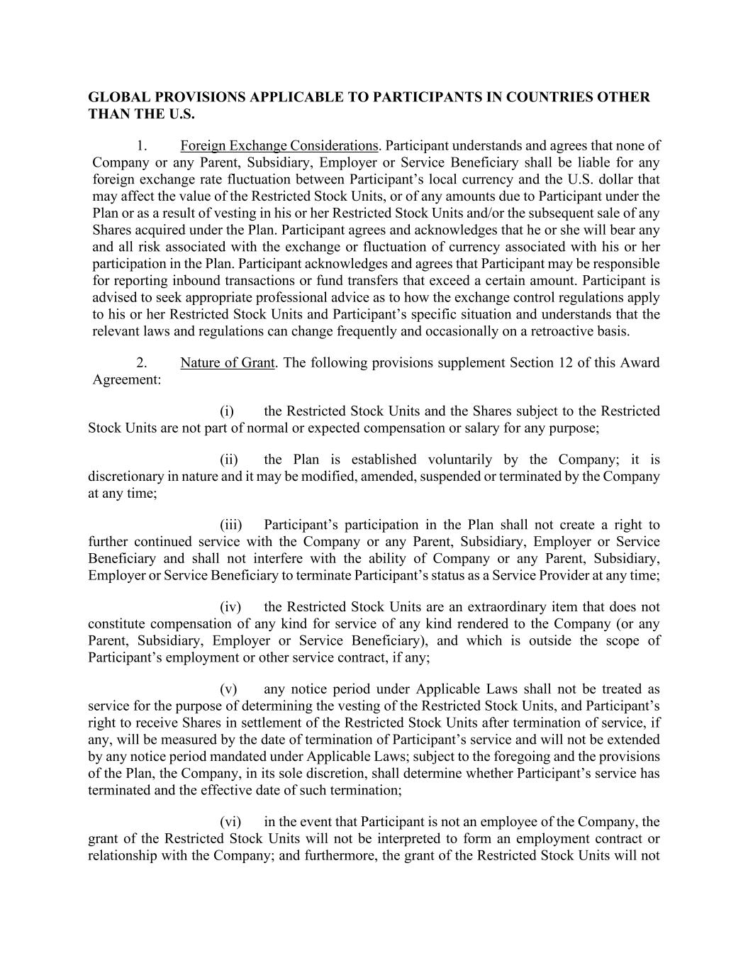 GLOBAL PROVISIONS APPLICABLE TO PARTICIPANTS IN COUNTRIES OTHER THAN THE U.S. 1. Foreign Exchange Considerations. Participant understands and agrees that none of Company or any Parent, Subsidiary, Employer or Service Beneficiary shall be liable for any foreign exchange rate fluctuation between Participant’s local currency and the U.S. dollar that may affect the value of the Restricted Stock Units, or of any amounts due to Participant under the Plan or as a result of vesting in his or her Restricted Stock Units and/or the subsequent sale of any Shares acquired under the Plan. Participant agrees and acknowledges that he or she will bear any and all risk associated with the exchange or fluctuation of currency associated with his or her participation in the Plan. Participant acknowledges and agrees that Participant may be responsible for reporting inbound transactions or fund transfers that exceed a certain amount. Participant is advised to seek appropriate professional advice as to how the exchange control regulations apply to his or her Restricted Stock Units and Participant’s specific situation and understands that the relevant laws and regulations can change frequently and occasionally on a retroactive basis. 2. Nature of Grant. The following provisions supplement Section 12 of this Award Agreement: (i) the Restricted Stock Units and the Shares subject to the Restricted Stock Units are not part of normal or expected compensation or salary for any purpose; (ii) the Plan is established voluntarily by the Company; it is discretionary in nature and it may be modified, amended, suspended or terminated by the Company at any time; (iii) Participant’s participation in the Plan shall not create a right to further continued service with the Company or any Parent, Subsidiary, Employer or Service Beneficiary and shall not interfere with the ability of Company or any Parent, Subsidiary, Employer or Service Beneficiary to terminate Participant’s status as a Service Provider at any time; (iv) the Restricted Stock Units are an extraordinary item that does not constitute compensation of any kind for service of any kind rendered to the Company (or any Parent, Subsidiary, Employer or Service Beneficiary), and which is outside the scope of Participant’s employment or other service contract, if any; (v) any notice period under Applicable Laws shall not be treated as service for the purpose of determining the vesting of the Restricted Stock Units, and Participant’s right to receive Shares in settlement of the Restricted Stock Units after termination of service, if any, will be measured by the date of termination of Participant’s service and will not be extended by any notice period mandated under Applicable Laws; subject to the foregoing and the provisions of the Plan, the Company, in its sole discretion, shall determine whether Participant’s service has terminated and the effective date of such termination; (vi) in the event that Participant is not an employee of the Company, the grant of the Restricted Stock Units will not be interpreted to form an employment contract or relationship with the Company; and furthermore, the grant of the Restricted Stock Units will not