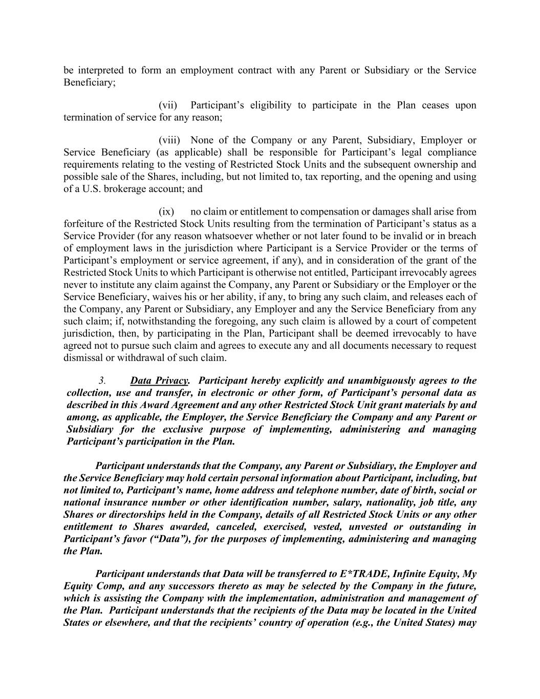 be interpreted to form an employment contract with any Parent or Subsidiary or the Service Beneficiary; (vii) Participant’s eligibility to participate in the Plan ceases upon termination of service for any reason; (viii) None of the Company or any Parent, Subsidiary, Employer or Service Beneficiary (as applicable) shall be responsible for Participant’s legal compliance requirements relating to the vesting of Restricted Stock Units and the subsequent ownership and possible sale of the Shares, including, but not limited to, tax reporting, and the opening and using of a U.S. brokerage account; and (ix) no claim or entitlement to compensation or damages shall arise from forfeiture of the Restricted Stock Units resulting from the termination of Participant’s status as a Service Provider (for any reason whatsoever whether or not later found to be invalid or in breach of employment laws in the jurisdiction where Participant is a Service Provider or the terms of Participant’s employment or service agreement, if any), and in consideration of the grant of the Restricted Stock Units to which Participant is otherwise not entitled, Participant irrevocably agrees never to institute any claim against the Company, any Parent or Subsidiary or the Employer or the Service Beneficiary, waives his or her ability, if any, to bring any such claim, and releases each of the Company, any Parent or Subsidiary, any Employer and any the Service Beneficiary from any such claim; if, notwithstanding the foregoing, any such claim is allowed by a court of competent jurisdiction, then, by participating in the Plan, Participant shall be deemed irrevocably to have agreed not to pursue such claim and agrees to execute any and all documents necessary to request dismissal or withdrawal of such claim. 3. Data Privacy. Participant hereby explicitly and unambiguously agrees to the collection, use and transfer, in electronic or other form, of Participant’s personal data as described in this Award Agreement and any other Restricted Stock Unit grant materials by and among, as applicable, the Employer, the Service Beneficiary the Company and any Parent or Subsidiary for the exclusive purpose of implementing, administering and managing Participant’s participation in the Plan. Participant understands that the Company, any Parent or Subsidiary, the Employer and the Service Beneficiary may hold certain personal information about Participant, including, but not limited to, Participant’s name, home address and telephone number, date of birth, social or national insurance number or other identification number, salary, nationality, job title, any Shares or directorships held in the Company, details of all Restricted Stock Units or any other entitlement to Shares awarded, canceled, exercised, vested, unvested or outstanding in Participant’s favor (“Data”), for the purposes of implementing, administering and managing the Plan. Participant understands that Data will be transferred to E*TRADE, Infinite Equity, My Equity Comp, and any successors thereto as may be selected by the Company in the future, which is assisting the Company with the implementation, administration and management of the Plan. Participant understands that the recipients of the Data may be located in the United States or elsewhere, and that the recipients’ country of operation (e.g., the United States) may