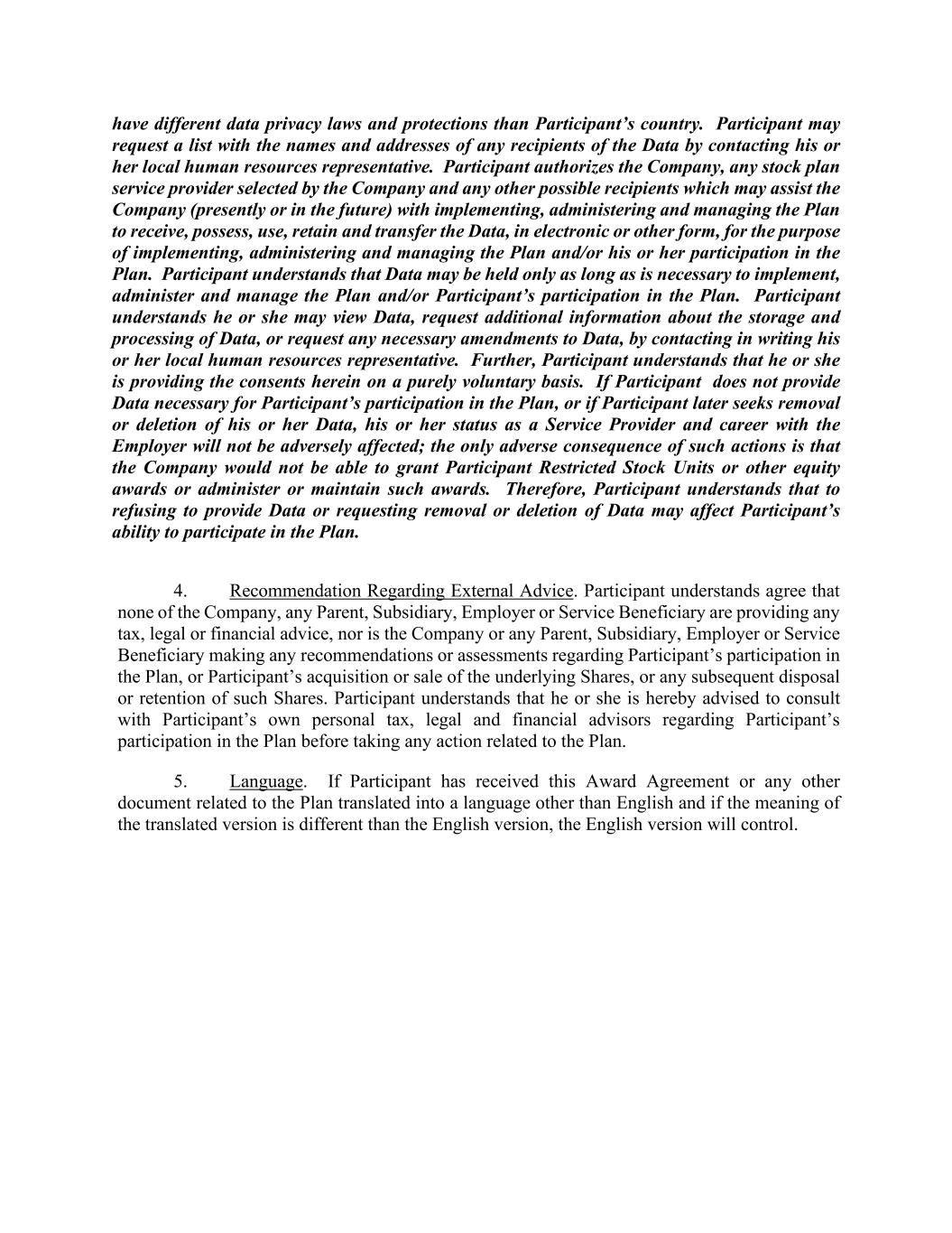 have different data privacy laws and protections than Participant’s country. Participant may request a list with the names and addresses of any recipients of the Data by contacting his or her local human resources representative. Participant authorizes the Company, any stock plan service provider selected by the Company and any other possible recipients which may assist the Company (presently or in the future) with implementing, administering and managing the Plan to receive, possess, use, retain and transfer the Data, in electronic or other form, for the purpose of implementing, administering and managing the Plan and/or his or her participation in the Plan. Participant understands that Data may be held only as long as is necessary to implement, administer and manage the Plan and/or Participant’s participation in the Plan. Participant understands he or she may view Data, request additional information about the storage and processing of Data, or request any necessary amendments to Data, by contacting in writing his or her local human resources representative. Further, Participant understands that he or she is providing the consents herein on a purely voluntary basis. If Participant does not provide Data necessary for Participant’s participation in the Plan, or if Participant later seeks removal or deletion of his or her Data, his or her status as a Service Provider and career with the Employer will not be adversely affected; the only adverse consequence of such actions is that the Company would not be able to grant Participant Restricted Stock Units or other equity awards or administer or maintain such awards. Therefore, Participant understands that to refusing to provide Data or requesting removal or deletion of Data may affect Participant’s ability to participate in the Plan. 4. Recommendation Regarding External Advice. Participant understands agree that none of the Company, any Parent, Subsidiary, Employer or Service Beneficiary are providing any tax, legal or financial advice, nor is the Company or any Parent, Subsidiary, Employer or Service Beneficiary making any recommendations or assessments regarding Participant’s participation in the Plan, or Participant’s acquisition or sale of the underlying Shares, or any subsequent disposal or retention of such Shares. Participant understands that he or she is hereby advised to consult with Participant’s own personal tax, legal and financial advisors regarding Participant’s participation in the Plan before taking any action related to the Plan. 5. Language. If Participant has received this Award Agreement or any other document related to the Plan translated into a language other than English and if the meaning of the translated version is different than the English version, the English version will control.