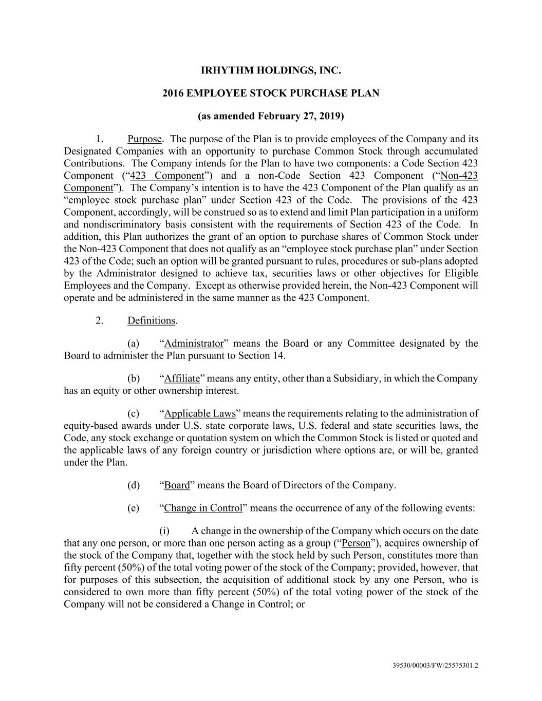 39530/00003/FW/25575301.2 IRHYTHM HOLDINGS, INC. 2016 EMPLOYEE STOCK PURCHASE PLAN (as amended February 27, 2019) 1. Purpose. The purpose of the Plan is to provide employees of the Company and its Designated Companies with an opportunity to purchase Common Stock through accumulated Contributions. The Company intends for the Plan to have two components: a Code Section 423 Component (“423 Component”) and a non-Code Section 423 Component (“Non-423 Component”). The Company’s intention is to have the 423 Component of the Plan qualify as an “employee stock purchase plan” under Section 423 of the Code. The provisions of the 423 Component, accordingly, will be construed so as to extend and limit Plan participation in a uniform and nondiscriminatory basis consistent with the requirements of Section 423 of the Code. In addition, this Plan authorizes the grant of an option to purchase shares of Common Stock under the Non-423 Component that does not qualify as an “employee stock purchase plan” under Section 423 of the Code; such an option will be granted pursuant to rules, procedures or sub-plans adopted by the Administrator designed to achieve tax, securities laws or other objectives for Eligible Employees and the Company. Except as otherwise provided herein, the Non-423 Component will operate and be administered in the same manner as the 423 Component. 2. Definitions. (a) “Administrator” means the Board or any Committee designated by the Board to administer the Plan pursuant to Section 14. (b) “Affiliate” means any entity, other than a Subsidiary, in which the Company has an equity or other ownership interest. (c) “Applicable Laws” means the requirements relating to the administration of equity-based awards under U.S. state corporate laws, U.S. federal and state securities laws, the Code, any stock exchange or quotation system on which the Common Stock is listed or quoted and the applicable laws of any foreign country or jurisdiction where options are, or will be, granted under the Plan. (d) “Board” means the Board of Directors of the Company. (e) “Change in Control” means the occurrence of any of the following events: (i) A change in the ownership of the Company which occurs on the date that any one person, or more than one person acting as a group (“Person”), acquires ownership of the stock of the Company that, together with the stock held by such Person, constitutes more than fifty percent (50%) of the total voting power of the stock of the Company; provided, however, that for purposes of this subsection, the acquisition of additional stock by any one Person, who is considered to own more than fifty percent (50%) of the total voting power of the stock of the Company will not be considered a Change in Control; or
