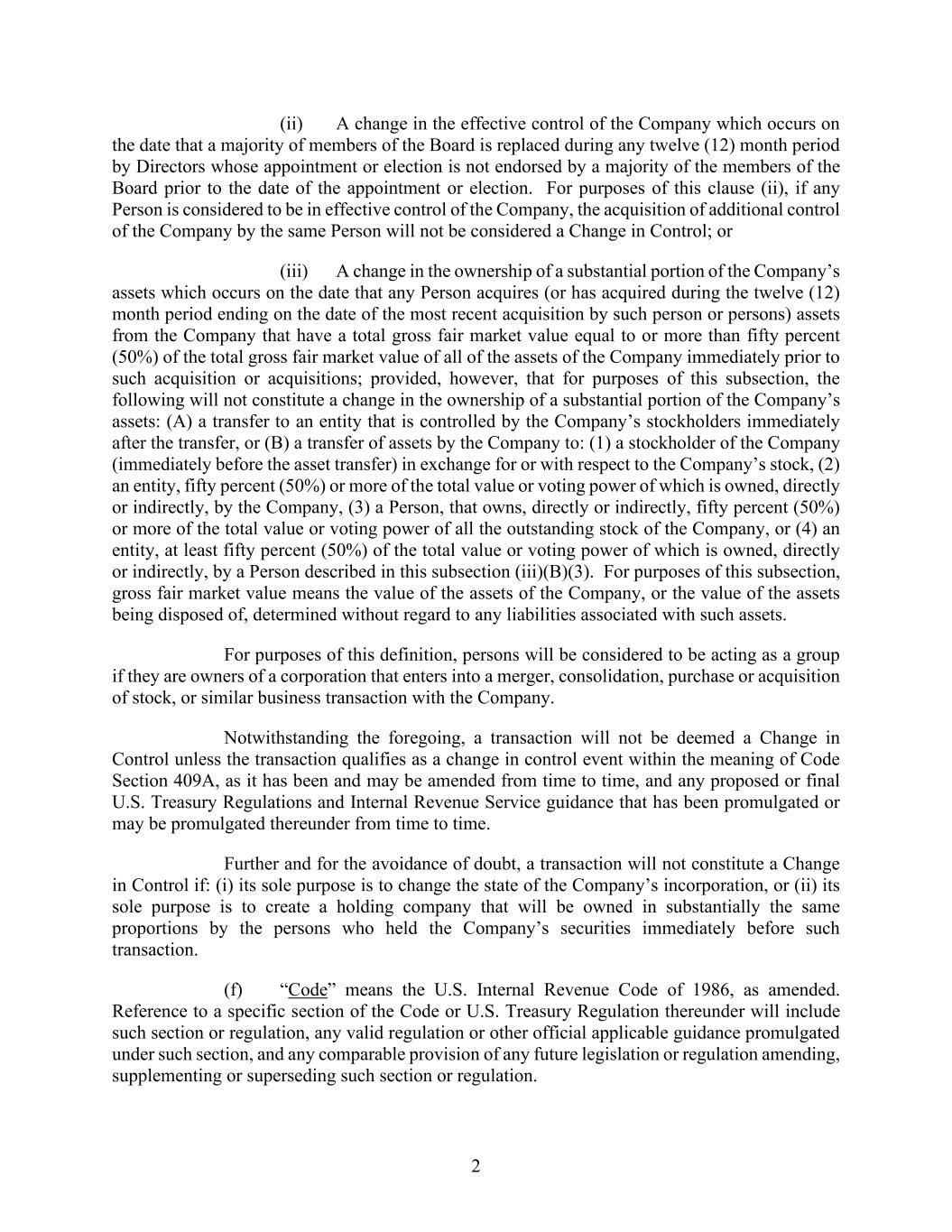 2 (ii) A change in the effective control of the Company which occurs on the date that a majority of members of the Board is replaced during any twelve (12) month period by Directors whose appointment or election is not endorsed by a majority of the members of the Board prior to the date of the appointment or election. For purposes of this clause (ii), if any Person is considered to be in effective control of the Company, the acquisition of additional control of the Company by the same Person will not be considered a Change in Control; or (iii) A change in the ownership of a substantial portion of the Company’s assets which occurs on the date that any Person acquires (or has acquired during the twelve (12) month period ending on the date of the most recent acquisition by such person or persons) assets from the Company that have a total gross fair market value equal to or more than fifty percent (50%) of the total gross fair market value of all of the assets of the Company immediately prior to such acquisition or acquisitions; provided, however, that for purposes of this subsection, the following will not constitute a change in the ownership of a substantial portion of the Company’s assets: (A) a transfer to an entity that is controlled by the Company’s stockholders immediately after the transfer, or (B) a transfer of assets by the Company to: (1) a stockholder of the Company (immediately before the asset transfer) in exchange for or with respect to the Company’s stock, (2) an entity, fifty percent (50%) or more of the total value or voting power of which is owned, directly or indirectly, by the Company, (3) a Person, that owns, directly or indirectly, fifty percent (50%) or more of the total value or voting power of all the outstanding stock of the Company, or (4) an entity, at least fifty percent (50%) of the total value or voting power of which is owned, directly or indirectly, by a Person described in this subsection (iii)(B)(3). For purposes of this subsection, gross fair market value means the value of the assets of the Company, or the value of the assets being disposed of, determined without regard to any liabilities associated with such assets. For purposes of this definition, persons will be considered to be acting as a group if they are owners of a corporation that enters into a merger, consolidation, purchase or acquisition of stock, or similar business transaction with the Company. Notwithstanding the foregoing, a transaction will not be deemed a Change in Control unless the transaction qualifies as a change in control event within the meaning of Code Section 409A, as it has been and may be amended from time to time, and any proposed or final U.S. Treasury Regulations and Internal Revenue Service guidance that has been promulgated or may be promulgated thereunder from time to time. Further and for the avoidance of doubt, a transaction will not constitute a Change in Control if: (i) its sole purpose is to change the state of the Company’s incorporation, or (ii) its sole purpose is to create a holding company that will be owned in substantially the same proportions by the persons who held the Company’s securities immediately before such transaction. (f) “Code” means the U.S. Internal Revenue Code of 1986, as amended. Reference to a specific section of the Code or U.S. Treasury Regulation thereunder will include such section or regulation, any valid regulation or other official applicable guidance promulgated under such section, and any comparable provision of any future legislation or regulation amending, supplementing or superseding such section or regulation.