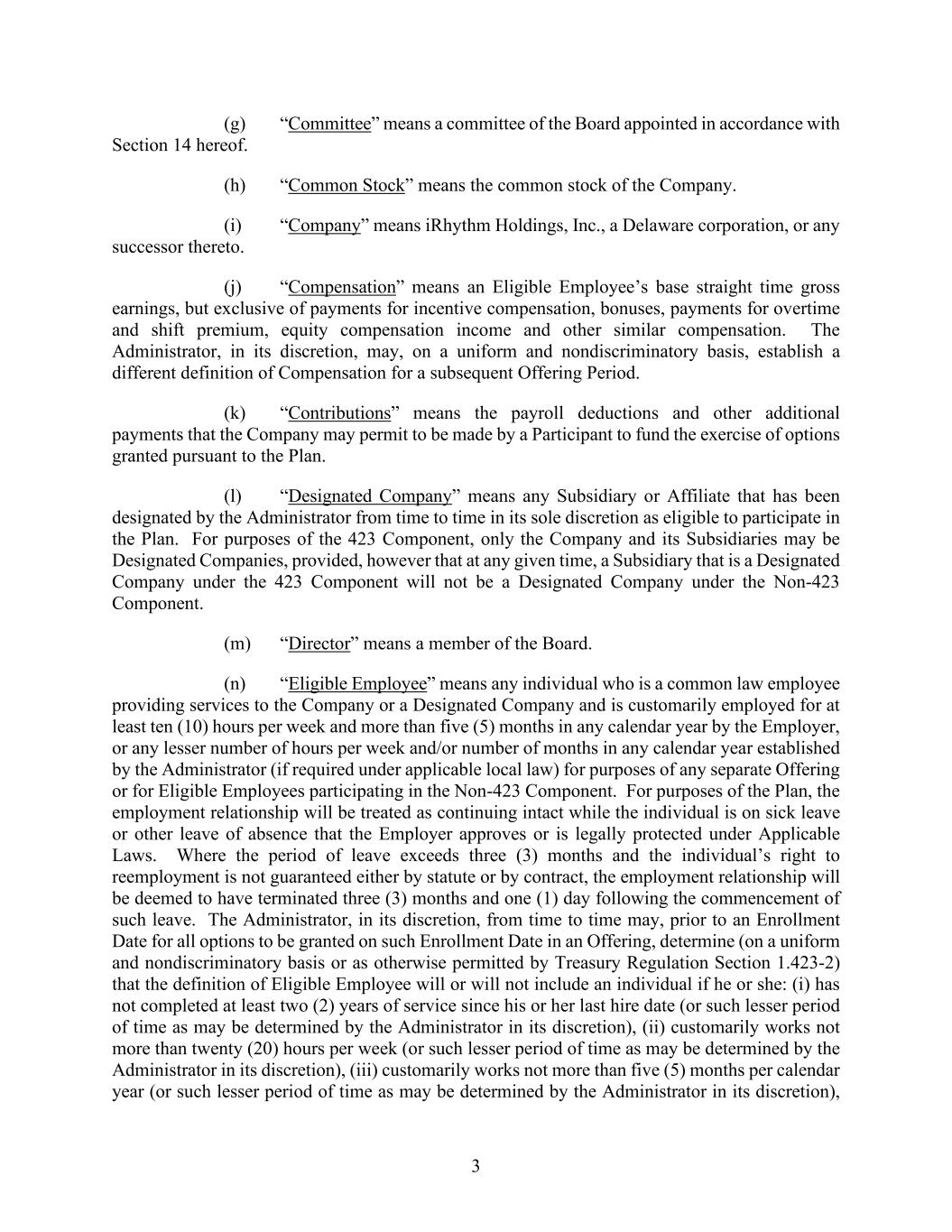 3 (g) “Committee” means a committee of the Board appointed in accordance with Section 14 hereof. (h) “Common Stock” means the common stock of the Company. (i) “Company” means iRhythm Holdings, Inc., a Delaware corporation, or any successor thereto. (j) “Compensation” means an Eligible Employee’s base straight time gross earnings, but exclusive of payments for incentive compensation, bonuses, payments for overtime and shift premium, equity compensation income and other similar compensation. The Administrator, in its discretion, may, on a uniform and nondiscriminatory basis, establish a different definition of Compensation for a subsequent Offering Period. (k) “Contributions” means the payroll deductions and other additional payments that the Company may permit to be made by a Participant to fund the exercise of options granted pursuant to the Plan. (l) “Designated Company” means any Subsidiary or Affiliate that has been designated by the Administrator from time to time in its sole discretion as eligible to participate in the Plan. For purposes of the 423 Component, only the Company and its Subsidiaries may be Designated Companies, provided, however that at any given time, a Subsidiary that is a Designated Company under the 423 Component will not be a Designated Company under the Non-423 Component. (m) “Director” means a member of the Board. (n) “Eligible Employee” means any individual who is a common law employee providing services to the Company or a Designated Company and is customarily employed for at least ten (10) hours per week and more than five (5) months in any calendar year by the Employer, or any lesser number of hours per week and/or number of months in any calendar year established by the Administrator (if required under applicable local law) for purposes of any separate Offering or for Eligible Employees participating in the Non-423 Component. For purposes of the Plan, the employment relationship will be treated as continuing intact while the individual is on sick leave or other leave of absence that the Employer approves or is legally protected under Applicable Laws. Where the period of leave exceeds three (3) months and the individual’s right to reemployment is not guaranteed either by statute or by contract, the employment relationship will be deemed to have terminated three (3) months and one (1) day following the commencement of such leave. The Administrator, in its discretion, from time to time may, prior to an Enrollment Date for all options to be granted on such Enrollment Date in an Offering, determine (on a uniform and nondiscriminatory basis or as otherwise permitted by Treasury Regulation Section 1.423-2) that the definition of Eligible Employee will or will not include an individual if he or she: (i) has not completed at least two (2) years of service since his or her last hire date (or such lesser period of time as may be determined by the Administrator in its discretion), (ii) customarily works not more than twenty (20) hours per week (or such lesser period of time as may be determined by the Administrator in its discretion), (iii) customarily works not more than five (5) months per calendar year (or such lesser period of time as may be determined by the Administrator in its discretion),
