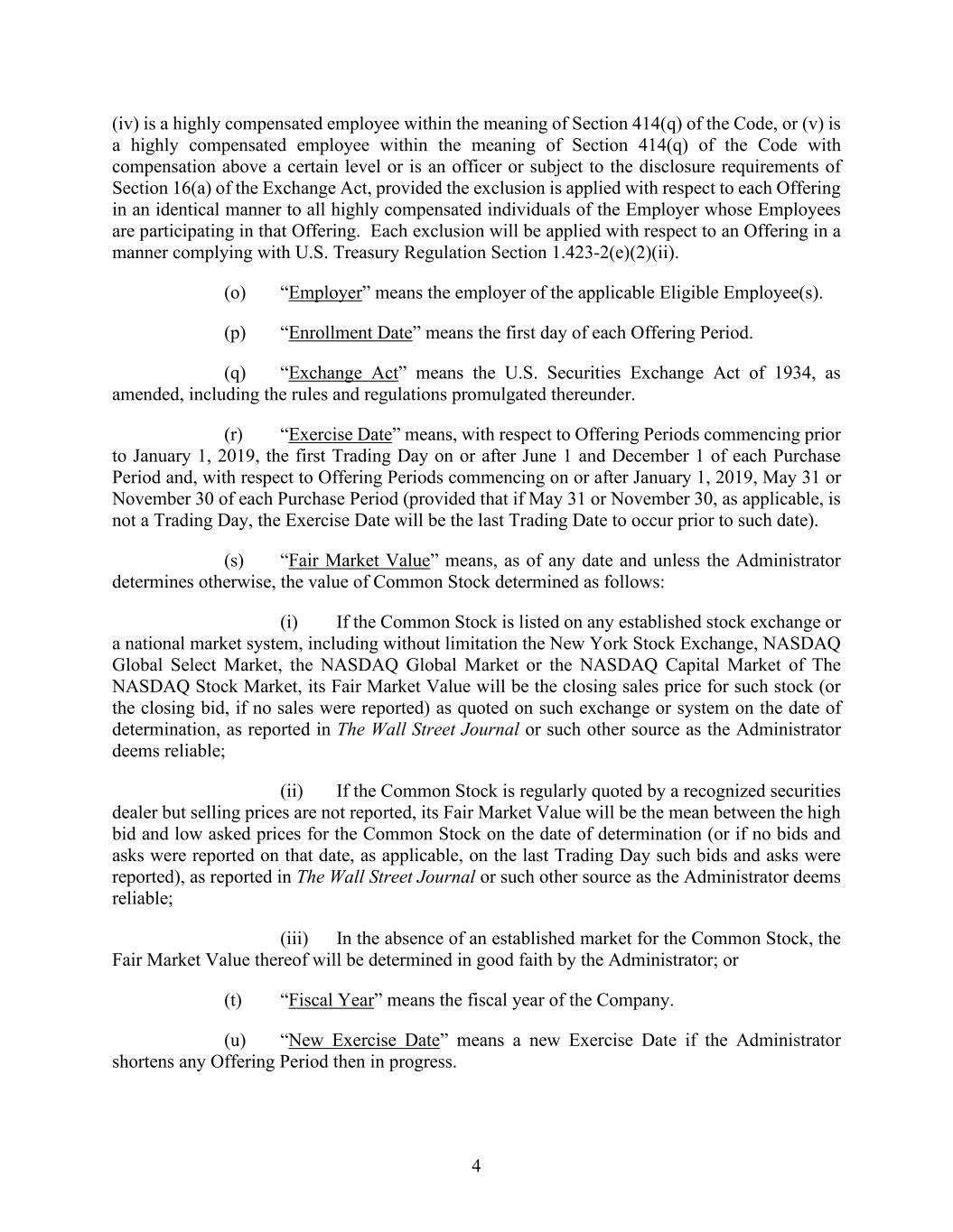 4 (iv) is a highly compensated employee within the meaning of Section 414(q) of the Code, or (v) is a highly compensated employee within the meaning of Section 414(q) of the Code with compensation above a certain level or is an officer or subject to the disclosure requirements of Section 16(a) of the Exchange Act, provided the exclusion is applied with respect to each Offering in an identical manner to all highly compensated individuals of the Employer whose Employees are participating in that Offering. Each exclusion will be applied with respect to an Offering in a manner complying with U.S. Treasury Regulation Section 1.423-2(e)(2)(ii). (o) “Employer” means the employer of the applicable Eligible Employee(s). (p) “Enrollment Date” means the first day of each Offering Period. (q) “Exchange Act” means the U.S. Securities Exchange Act of 1934, as amended, including the rules and regulations promulgated thereunder. (r) “Exercise Date” means, with respect to Offering Periods commencing prior to January 1, 2019, the first Trading Day on or after June 1 and December 1 of each Purchase Period and, with respect to Offering Periods commencing on or after January 1, 2019, May 31 or November 30 of each Purchase Period (provided that if May 31 or November 30, as applicable, is not a Trading Day, the Exercise Date will be the last Trading Date to occur prior to such date). (s) “Fair Market Value” means, as of any date and unless the Administrator determines otherwise, the value of Common Stock determined as follows: (i) If the Common Stock is listed on any established stock exchange or a national market system, including without limitation the New York Stock Exchange, NASDAQ Global Select Market, the NASDAQ Global Market or the NASDAQ Capital Market of The NASDAQ Stock Market, its Fair Market Value will be the closing sales price for such stock (or the closing bid, if no sales were reported) as quoted on such exchange or system on the date of determination, as reported in The Wall Street Journal or such other source as the Administrator deems reliable; (ii) If the Common Stock is regularly quoted by a recognized securities dealer but selling prices are not reported, its Fair Market Value will be the mean between the high bid and low asked prices for the Common Stock on the date of determination (or if no bids and asks were reported on that date, as applicable, on the last Trading Day such bids and asks were reported), as reported in The Wall Street Journal or such other source as the Administrator deems reliable; (iii) In the absence of an established market for the Common Stock, the Fair Market Value thereof will be determined in good faith by the Administrator; or (t) “Fiscal Year” means the fiscal year of the Company. (u) “New Exercise Date” means a new Exercise Date if the Administrator shortens any Offering Period then in progress.