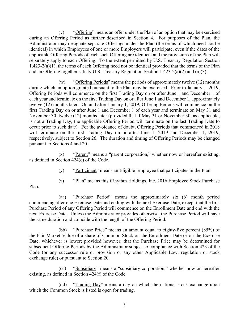 5 (v) “Offering” means an offer under the Plan of an option that may be exercised during an Offering Period as further described in Section 4. For purposes of the Plan, the Administrator may designate separate Offerings under the Plan (the terms of which need not be identical) in which Employees of one or more Employers will participate, even if the dates of the applicable Offering Periods of each such Offering are identical and the provisions of the Plan will separately apply to each Offering. To the extent permitted by U.S. Treasury Regulation Section 1.423-2(a)(1), the terms of each Offering need not be identical provided that the terms of the Plan and an Offering together satisfy U.S. Treasury Regulation Section 1.423-2(a)(2) and (a)(3). (w) “Offering Periods” means the periods of approximately twelve (12) months during which an option granted pursuant to the Plan may be exercised. Prior to January 1, 2019, Offering Periods will commence on the first Trading Day on or after June 1 and December 1 of each year and terminate on the first Trading Day on or after June 1 and December 1, approximately twelve (12) months later. On and after January 1, 2019, Offering Periods will commence on the first Trading Day on or after June 1 and December 1 of each year and terminate on May 31 and November 30, twelve (12) months later (provided that if May 31 or November 30, as applicable, is not a Trading Day, the applicable Offering Period will terminate on the last Trading Date to occur prior to such date). For the avoidance of doubt, Offering Periods that commenced in 2018 will terminate on the first Trading Day on or after June 1, 2019 and December 1, 2019, respectively, subject to Section 26. The duration and timing of Offering Periods may be changed pursuant to Sections 4 and 20. (x) “Parent” means a “parent corporation,” whether now or hereafter existing, as defined in Section 424(e) of the Code. (y) “Participant” means an Eligible Employee that participates in the Plan. (z) “Plan” means this iRhythm Holdings, Inc. 2016 Employee Stock Purchase Plan. (aa) “Purchase Period” means the approximately six (6) month period commencing after one Exercise Date and ending with the next Exercise Date, except that the first Purchase Period of any Offering Period will commence on the Enrollment Date and end with the next Exercise Date. Unless the Administrator provides otherwise, the Purchase Period will have the same duration and coincide with the length of the Offering Period. (bb) “Purchase Price” means an amount equal to eighty-five percent (85%) of the Fair Market Value of a share of Common Stock on the Enrollment Date or on the Exercise Date, whichever is lower; provided however, that the Purchase Price may be determined for subsequent Offering Periods by the Administrator subject to compliance with Section 423 of the Code (or any successor rule or provision or any other Applicable Law, regulation or stock exchange rule) or pursuant to Section 20. (cc) “Subsidiary” means a “subsidiary corporation,” whether now or hereafter existing, as defined in Section 424(f) of the Code. (dd) “Trading Day” means a day on which the national stock exchange upon which the Common Stock is listed is open for trading.