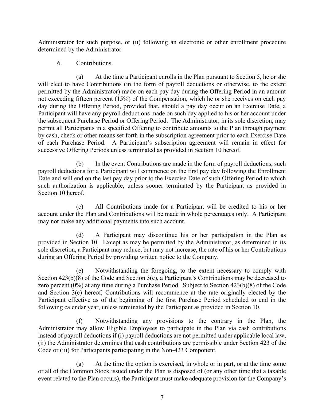 7 Administrator for such purpose, or (ii) following an electronic or other enrollment procedure determined by the Administrator. 6. Contributions. (a) At the time a Participant enrolls in the Plan pursuant to Section 5, he or she will elect to have Contributions (in the form of payroll deductions or otherwise, to the extent permitted by the Administrator) made on each pay day during the Offering Period in an amount not exceeding fifteen percent (15%) of the Compensation, which he or she receives on each pay day during the Offering Period, provided that, should a pay day occur on an Exercise Date, a Participant will have any payroll deductions made on such day applied to his or her account under the subsequent Purchase Period or Offering Period. The Administrator, in its sole discretion, may permit all Participants in a specified Offering to contribute amounts to the Plan through payment by cash, check or other means set forth in the subscription agreement prior to each Exercise Date of each Purchase Period. A Participant’s subscription agreement will remain in effect for successive Offering Periods unless terminated as provided in Section 10 hereof. (b) In the event Contributions are made in the form of payroll deductions, such payroll deductions for a Participant will commence on the first pay day following the Enrollment Date and will end on the last pay day prior to the Exercise Date of such Offering Period to which such authorization is applicable, unless sooner terminated by the Participant as provided in Section 10 hereof. (c) All Contributions made for a Participant will be credited to his or her account under the Plan and Contributions will be made in whole percentages only. A Participant may not make any additional payments into such account. (d) A Participant may discontinue his or her participation in the Plan as provided in Section 10. Except as may be permitted by the Administrator, as determined in its sole discretion, a Participant may reduce, but may not increase, the rate of his or her Contributions during an Offering Period by providing written notice to the Company. (e) Notwithstanding the foregoing, to the extent necessary to comply with Section 423(b)(8) of the Code and Section 3(c), a Participant’s Contributions may be decreased to zero percent (0%) at any time during a Purchase Period. Subject to Section 423(b)(8) of the Code and Section 3(c) hereof, Contributions will recommence at the rate originally elected by the Participant effective as of the beginning of the first Purchase Period scheduled to end in the following calendar year, unless terminated by the Participant as provided in Section 10. (f) Notwithstanding any provisions to the contrary in the Plan, the Administrator may allow Eligible Employees to participate in the Plan via cash contributions instead of payroll deductions if (i) payroll deductions are not permitted under applicable local law, (ii) the Administrator determines that cash contributions are permissible under Section 423 of the Code or (iii) for Participants participating in the Non-423 Component. (g) At the time the option is exercised, in whole or in part, or at the time some or all of the Common Stock issued under the Plan is disposed of (or any other time that a taxable event related to the Plan occurs), the Participant must make adequate provision for the Company’s