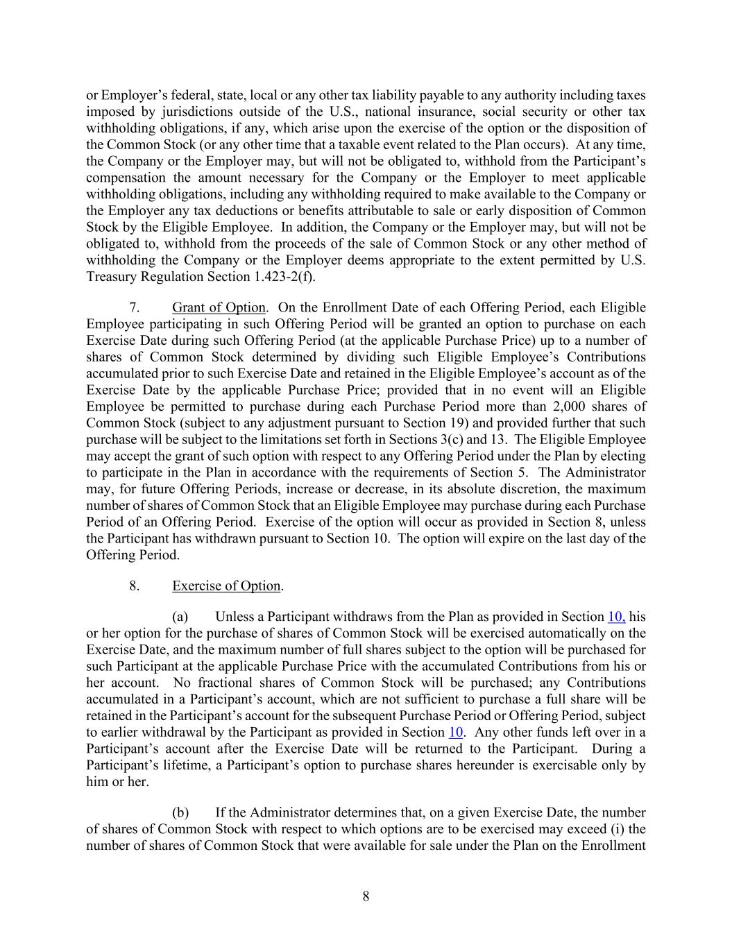 8 or Employer’s federal, state, local or any other tax liability payable to any authority including taxes imposed by jurisdictions outside of the U.S., national insurance, social security or other tax withholding obligations, if any, which arise upon the exercise of the option or the disposition of the Common Stock (or any other time that a taxable event related to the Plan occurs). At any time, the Company or the Employer may, but will not be obligated to, withhold from the Participant’s compensation the amount necessary for the Company or the Employer to meet applicable withholding obligations, including any withholding required to make available to the Company or the Employer any tax deductions or benefits attributable to sale or early disposition of Common Stock by the Eligible Employee. In addition, the Company or the Employer may, but will not be obligated to, withhold from the proceeds of the sale of Common Stock or any other method of withholding the Company or the Employer deems appropriate to the extent permitted by U.S. Treasury Regulation Section 1.423-2(f). 7. Grant of Option. On the Enrollment Date of each Offering Period, each Eligible Employee participating in such Offering Period will be granted an option to purchase on each Exercise Date during such Offering Period (at the applicable Purchase Price) up to a number of shares of Common Stock determined by dividing such Eligible Employee’s Contributions accumulated prior to such Exercise Date and retained in the Eligible Employee’s account as of the Exercise Date by the applicable Purchase Price; provided that in no event will an Eligible Employee be permitted to purchase during each Purchase Period more than 2,000 shares of Common Stock (subject to any adjustment pursuant to Section 19) and provided further that such purchase will be subject to the limitations set forth in Sections 3(c) and 13. The Eligible Employee may accept the grant of such option with respect to any Offering Period under the Plan by electing to participate in the Plan in accordance with the requirements of Section 5. The Administrator may, for future Offering Periods, increase or decrease, in its absolute discretion, the maximum number of shares of Common Stock that an Eligible Employee may purchase during each Purchase Period of an Offering Period. Exercise of the option will occur as provided in Section 8, unless the Participant has withdrawn pursuant to Section 10. The option will expire on the last day of the Offering Period. 8. Exercise of Option. (a) Unless a Participant withdraws from the Plan as provided in Section 10, his or her option for the purchase of shares of Common Stock will be exercised automatically on the Exercise Date, and the maximum number of full shares subject to the option will be purchased for such Participant at the applicable Purchase Price with the accumulated Contributions from his or her account. No fractional shares of Common Stock will be purchased; any Contributions accumulated in a Participant’s account, which are not sufficient to purchase a full share will be retained in the Participant’s account for the subsequent Purchase Period or Offering Period, subject to earlier withdrawal by the Participant as provided in Section 10. Any other funds left over in a Participant’s account after the Exercise Date will be returned to the Participant. During a Participant’s lifetime, a Participant’s option to purchase shares hereunder is exercisable only by him or her. (b) If the Administrator determines that, on a given Exercise Date, the number of shares of Common Stock with respect to which options are to be exercised may exceed (i) the number of shares of Common Stock that were available for sale under the Plan on the Enrollment