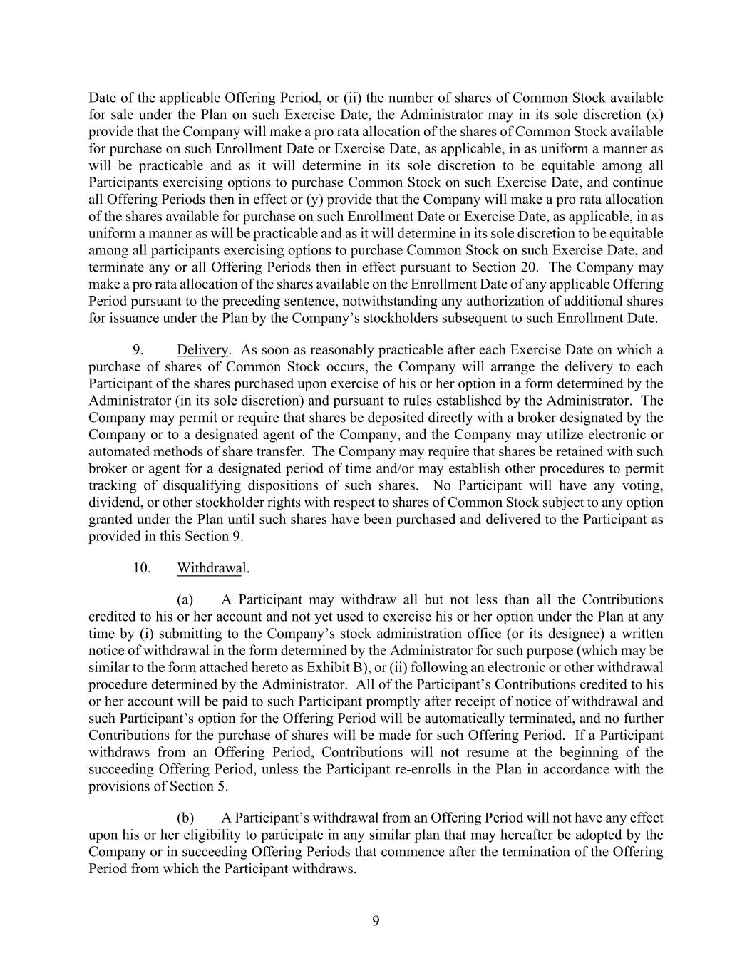 9 Date of the applicable Offering Period, or (ii) the number of shares of Common Stock available for sale under the Plan on such Exercise Date, the Administrator may in its sole discretion (x) provide that the Company will make a pro rata allocation of the shares of Common Stock available for purchase on such Enrollment Date or Exercise Date, as applicable, in as uniform a manner as will be practicable and as it will determine in its sole discretion to be equitable among all Participants exercising options to purchase Common Stock on such Exercise Date, and continue all Offering Periods then in effect or (y) provide that the Company will make a pro rata allocation of the shares available for purchase on such Enrollment Date or Exercise Date, as applicable, in as uniform a manner as will be practicable and as it will determine in its sole discretion to be equitable among all participants exercising options to purchase Common Stock on such Exercise Date, and terminate any or all Offering Periods then in effect pursuant to Section 20. The Company may make a pro rata allocation of the shares available on the Enrollment Date of any applicable Offering Period pursuant to the preceding sentence, notwithstanding any authorization of additional shares for issuance under the Plan by the Company’s stockholders subsequent to such Enrollment Date. 9. Delivery. As soon as reasonably practicable after each Exercise Date on which a purchase of shares of Common Stock occurs, the Company will arrange the delivery to each Participant of the shares purchased upon exercise of his or her option in a form determined by the Administrator (in its sole discretion) and pursuant to rules established by the Administrator. The Company may permit or require that shares be deposited directly with a broker designated by the Company or to a designated agent of the Company, and the Company may utilize electronic or automated methods of share transfer. The Company may require that shares be retained with such broker or agent for a designated period of time and/or may establish other procedures to permit tracking of disqualifying dispositions of such shares. No Participant will have any voting, dividend, or other stockholder rights with respect to shares of Common Stock subject to any option granted under the Plan until such shares have been purchased and delivered to the Participant as provided in this Section 9. 10. Withdrawal. (a) A Participant may withdraw all but not less than all the Contributions credited to his or her account and not yet used to exercise his or her option under the Plan at any time by (i) submitting to the Company’s stock administration office (or its designee) a written notice of withdrawal in the form determined by the Administrator for such purpose (which may be similar to the form attached hereto as Exhibit B), or (ii) following an electronic or other withdrawal procedure determined by the Administrator. All of the Participant’s Contributions credited to his or her account will be paid to such Participant promptly after receipt of notice of withdrawal and such Participant’s option for the Offering Period will be automatically terminated, and no further Contributions for the purchase of shares will be made for such Offering Period. If a Participant withdraws from an Offering Period, Contributions will not resume at the beginning of the succeeding Offering Period, unless the Participant re-enrolls in the Plan in accordance with the provisions of Section 5. (b) A Participant’s withdrawal from an Offering Period will not have any effect upon his or her eligibility to participate in any similar plan that may hereafter be adopted by the Company or in succeeding Offering Periods that commence after the termination of the Offering Period from which the Participant withdraws.