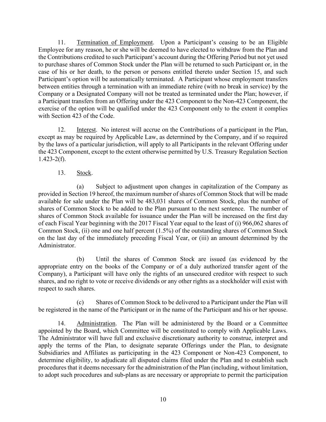 10 11. Termination of Employment. Upon a Participant’s ceasing to be an Eligible Employee for any reason, he or she will be deemed to have elected to withdraw from the Plan and the Contributions credited to such Participant’s account during the Offering Period but not yet used to purchase shares of Common Stock under the Plan will be returned to such Participant or, in the case of his or her death, to the person or persons entitled thereto under Section 15, and such Participant’s option will be automatically terminated. A Participant whose employment transfers between entities through a termination with an immediate rehire (with no break in service) by the Company or a Designated Company will not be treated as terminated under the Plan; however, if a Participant transfers from an Offering under the 423 Component to the Non-423 Component, the exercise of the option will be qualified under the 423 Component only to the extent it complies with Section 423 of the Code. 12. Interest. No interest will accrue on the Contributions of a participant in the Plan, except as may be required by Applicable Law, as determined by the Company, and if so required by the laws of a particular jurisdiction, will apply to all Participants in the relevant Offering under the 423 Component, except to the extent otherwise permitted by U.S. Treasury Regulation Section 1.423-2(f). 13. Stock. (a) Subject to adjustment upon changes in capitalization of the Company as provided in Section 19 hereof, the maximum number of shares of Common Stock that will be made available for sale under the Plan will be 483,031 shares of Common Stock, plus the number of shares of Common Stock to be added to the Plan pursuant to the next sentence. The number of shares of Common Stock available for issuance under the Plan will be increased on the first day of each Fiscal Year beginning with the 2017 Fiscal Year equal to the least of (i) 966,062 shares of Common Stock, (ii) one and one half percent (1.5%) of the outstanding shares of Common Stock on the last day of the immediately preceding Fiscal Year, or (iii) an amount determined by the Administrator. (b) Until the shares of Common Stock are issued (as evidenced by the appropriate entry on the books of the Company or of a duly authorized transfer agent of the Company), a Participant will have only the rights of an unsecured creditor with respect to such shares, and no right to vote or receive dividends or any other rights as a stockholder will exist with respect to such shares. (c) Shares of Common Stock to be delivered to a Participant under the Plan will be registered in the name of the Participant or in the name of the Participant and his or her spouse. 14. Administration. The Plan will be administered by the Board or a Committee appointed by the Board, which Committee will be constituted to comply with Applicable Laws. The Administrator will have full and exclusive discretionary authority to construe, interpret and apply the terms of the Plan, to designate separate Offerings under the Plan, to designate Subsidiaries and Affiliates as participating in the 423 Component or Non-423 Component, to determine eligibility, to adjudicate all disputed claims filed under the Plan and to establish such procedures that it deems necessary for the administration of the Plan (including, without limitation, to adopt such procedures and sub-plans as are necessary or appropriate to permit the participation