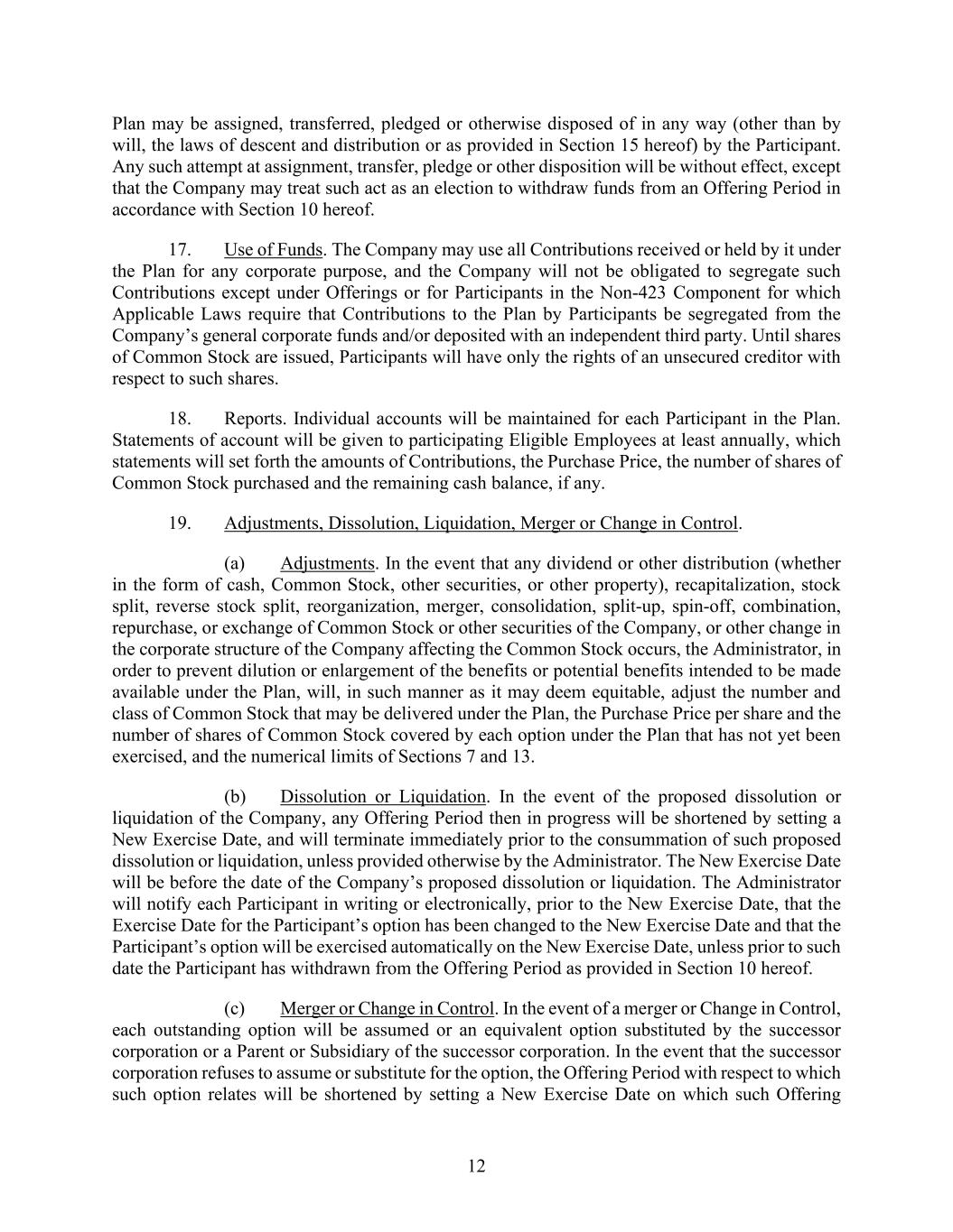 12 Plan may be assigned, transferred, pledged or otherwise disposed of in any way (other than by will, the laws of descent and distribution or as provided in Section 15 hereof) by the Participant. Any such attempt at assignment, transfer, pledge or other disposition will be without effect, except that the Company may treat such act as an election to withdraw funds from an Offering Period in accordance with Section 10 hereof. 17. Use of Funds. The Company may use all Contributions received or held by it under the Plan for any corporate purpose, and the Company will not be obligated to segregate such Contributions except under Offerings or for Participants in the Non-423 Component for which Applicable Laws require that Contributions to the Plan by Participants be segregated from the Company’s general corporate funds and/or deposited with an independent third party. Until shares of Common Stock are issued, Participants will have only the rights of an unsecured creditor with respect to such shares. 18. Reports. Individual accounts will be maintained for each Participant in the Plan. Statements of account will be given to participating Eligible Employees at least annually, which statements will set forth the amounts of Contributions, the Purchase Price, the number of shares of Common Stock purchased and the remaining cash balance, if any. 19. Adjustments, Dissolution, Liquidation, Merger or Change in Control. (a) Adjustments. In the event that any dividend or other distribution (whether in the form of cash, Common Stock, other securities, or other property), recapitalization, stock split, reverse stock split, reorganization, merger, consolidation, split-up, spin-off, combination, repurchase, or exchange of Common Stock or other securities of the Company, or other change in the corporate structure of the Company affecting the Common Stock occurs, the Administrator, in order to prevent dilution or enlargement of the benefits or potential benefits intended to be made available under the Plan, will, in such manner as it may deem equitable, adjust the number and class of Common Stock that may be delivered under the Plan, the Purchase Price per share and the number of shares of Common Stock covered by each option under the Plan that has not yet been exercised, and the numerical limits of Sections 7 and 13. (b) Dissolution or Liquidation. In the event of the proposed dissolution or liquidation of the Company, any Offering Period then in progress will be shortened by setting a New Exercise Date, and will terminate immediately prior to the consummation of such proposed dissolution or liquidation, unless provided otherwise by the Administrator. The New Exercise Date will be before the date of the Company’s proposed dissolution or liquidation. The Administrator will notify each Participant in writing or electronically, prior to the New Exercise Date, that the Exercise Date for the Participant’s option has been changed to the New Exercise Date and that the Participant’s option will be exercised automatically on the New Exercise Date, unless prior to such date the Participant has withdrawn from the Offering Period as provided in Section 10 hereof. (c) Merger or Change in Control. In the event of a merger or Change in Control, each outstanding option will be assumed or an equivalent option substituted by the successor corporation or a Parent or Subsidiary of the successor corporation. In the event that the successor corporation refuses to assume or substitute for the option, the Offering Period with respect to which such option relates will be shortened by setting a New Exercise Date on which such Offering