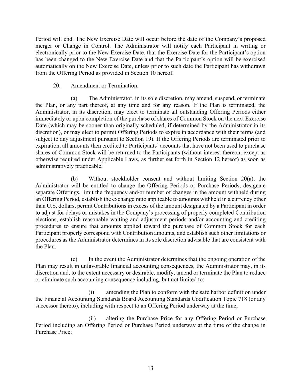13 Period will end. The New Exercise Date will occur before the date of the Company’s proposed merger or Change in Control. The Administrator will notify each Participant in writing or electronically prior to the New Exercise Date, that the Exercise Date for the Participant’s option has been changed to the New Exercise Date and that the Participant’s option will be exercised automatically on the New Exercise Date, unless prior to such date the Participant has withdrawn from the Offering Period as provided in Section 10 hereof. 20. Amendment or Termination. (a) The Administrator, in its sole discretion, may amend, suspend, or terminate the Plan, or any part thereof, at any time and for any reason. If the Plan is terminated, the Administrator, in its discretion, may elect to terminate all outstanding Offering Periods either immediately or upon completion of the purchase of shares of Common Stock on the next Exercise Date (which may be sooner than originally scheduled, if determined by the Administrator in its discretion), or may elect to permit Offering Periods to expire in accordance with their terms (and subject to any adjustment pursuant to Section 19). If the Offering Periods are terminated prior to expiration, all amounts then credited to Participants’ accounts that have not been used to purchase shares of Common Stock will be returned to the Participants (without interest thereon, except as otherwise required under Applicable Laws, as further set forth in Section 12 hereof) as soon as administratively practicable. (b) Without stockholder consent and without limiting Section 20(a), the Administrator will be entitled to change the Offering Periods or Purchase Periods, designate separate Offerings, limit the frequency and/or number of changes in the amount withheld during an Offering Period, establish the exchange ratio applicable to amounts withheld in a currency other than U.S. dollars, permit Contributions in excess of the amount designated by a Participant in order to adjust for delays or mistakes in the Company’s processing of properly completed Contribution elections, establish reasonable waiting and adjustment periods and/or accounting and crediting procedures to ensure that amounts applied toward the purchase of Common Stock for each Participant properly correspond with Contribution amounts, and establish such other limitations or procedures as the Administrator determines in its sole discretion advisable that are consistent with the Plan. (c) In the event the Administrator determines that the ongoing operation of the Plan may result in unfavorable financial accounting consequences, the Administrator may, in its discretion and, to the extent necessary or desirable, modify, amend or terminate the Plan to reduce or eliminate such accounting consequence including, but not limited to: (i) amending the Plan to conform with the safe harbor definition under the Financial Accounting Standards Board Accounting Standards Codification Topic 718 (or any successor thereto), including with respect to an Offering Period underway at the time; (ii) altering the Purchase Price for any Offering Period or Purchase Period including an Offering Period or Purchase Period underway at the time of the change in Purchase Price;