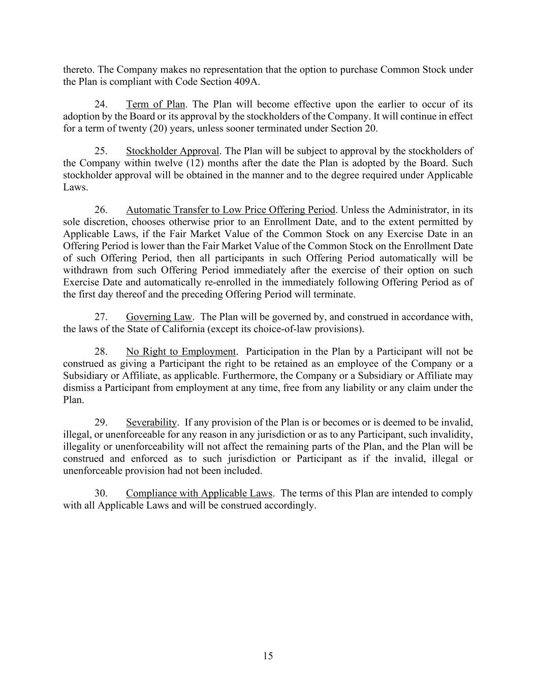 15 thereto. The Company makes no representation that the option to purchase Common Stock under the Plan is compliant with Code Section 409A. 24. Term of Plan. The Plan will become effective upon the earlier to occur of its adoption by the Board or its approval by the stockholders of the Company. It will continue in effect for a term of twenty (20) years, unless sooner terminated under Section 20. 25. Stockholder Approval. The Plan will be subject to approval by the stockholders of the Company within twelve (12) months after the date the Plan is adopted by the Board. Such stockholder approval will be obtained in the manner and to the degree required under Applicable Laws. 26. Automatic Transfer to Low Price Offering Period. Unless the Administrator, in its sole discretion, chooses otherwise prior to an Enrollment Date, and to the extent permitted by Applicable Laws, if the Fair Market Value of the Common Stock on any Exercise Date in an Offering Period is lower than the Fair Market Value of the Common Stock on the Enrollment Date of such Offering Period, then all participants in such Offering Period automatically will be withdrawn from such Offering Period immediately after the exercise of their option on such Exercise Date and automatically re-enrolled in the immediately following Offering Period as of the first day thereof and the preceding Offering Period will terminate. 27. Governing Law. The Plan will be governed by, and construed in accordance with, the laws of the State of California (except its choice-of-law provisions). 28. No Right to Employment. Participation in the Plan by a Participant will not be construed as giving a Participant the right to be retained as an employee of the Company or a Subsidiary or Affiliate, as applicable. Furthermore, the Company or a Subsidiary or Affiliate may dismiss a Participant from employment at any time, free from any liability or any claim under the Plan. 29. Severability. If any provision of the Plan is or becomes or is deemed to be invalid, illegal, or unenforceable for any reason in any jurisdiction or as to any Participant, such invalidity, illegality or unenforceability will not affect the remaining parts of the Plan, and the Plan will be construed and enforced as to such jurisdiction or Participant as if the invalid, illegal or unenforceable provision had not been included. 30. Compliance with Applicable Laws. The terms of this Plan are intended to comply with all Applicable Laws and will be construed accordingly.