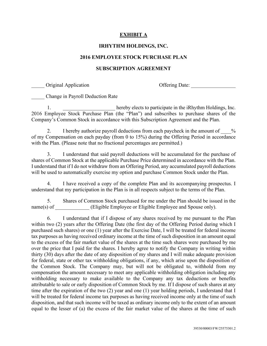 39530/00003/FW/25575301.2 EXHIBIT A IRHYTHM HOLDINGS, INC. 2016 EMPLOYEE STOCK PURCHASE PLAN SUBSCRIPTION AGREEMENT _____ Original Application Offering Date: _________________ _____ Change in Payroll Deduction Rate 1. ____________________ hereby elects to participate in the iRhythm Holdings, Inc. 2016 Employee Stock Purchase Plan (the “Plan”) and subscribes to purchase shares of the Company’s Common Stock in accordance with this Subscription Agreement and the Plan. 2. I hereby authorize payroll deductions from each paycheck in the amount of ____% of my Compensation on each payday (from 0 to 15%) during the Offering Period in accordance with the Plan. (Please note that no fractional percentages are permitted.) 3. I understand that said payroll deductions will be accumulated for the purchase of shares of Common Stock at the applicable Purchase Price determined in accordance with the Plan. I understand that if I do not withdraw from an Offering Period, any accumulated payroll deductions will be used to automatically exercise my option and purchase Common Stock under the Plan. 4. I have received a copy of the complete Plan and its accompanying prospectus. I understand that my participation in the Plan is in all respects subject to the terms of the Plan. 5. Shares of Common Stock purchased for me under the Plan should be issued in the name(s) of _____________ (Eligible Employee or Eligible Employee and Spouse only). 6. I understand that if I dispose of any shares received by me pursuant to the Plan within two (2) years after the Offering Date (the first day of the Offering Period during which I purchased such shares) or one (1) year after the Exercise Date, I will be treated for federal income tax purposes as having received ordinary income at the time of such disposition in an amount equal to the excess of the fair market value of the shares at the time such shares were purchased by me over the price that I paid for the shares. I hereby agree to notify the Company in writing within thirty (30) days after the date of any disposition of my shares and I will make adequate provision for federal, state or other tax withholding obligations, if any, which arise upon the disposition of the Common Stock. The Company may, but will not be obligated to, withhold from my compensation the amount necessary to meet any applicable withholding obligation including any withholding necessary to make available to the Company any tax deductions or benefits attributable to sale or early disposition of Common Stock by me. If I dispose of such shares at any time after the expiration of the two (2) year and one (1) year holding periods, I understand that I will be treated for federal income tax purposes as having received income only at the time of such disposition, and that such income will be taxed as ordinary income only to the extent of an amount equal to the lesser of (a) the excess of the fair market value of the shares at the time of such