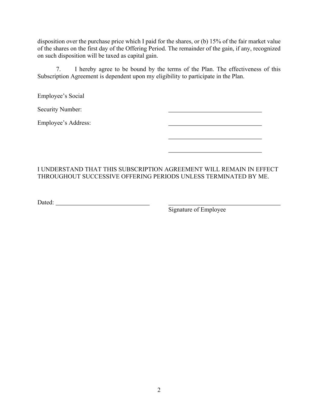 2 disposition over the purchase price which I paid for the shares, or (b) 15% of the fair market value of the shares on the first day of the Offering Period. The remainder of the gain, if any, recognized on such disposition will be taxed as capital gain. 7. I hereby agree to be bound by the terms of the Plan. The effectiveness of this Subscription Agreement is dependent upon my eligibility to participate in the Plan. Employee’s Social Security Number: Employee’s Address: I UNDERSTAND THAT THIS SUBSCRIPTION AGREEMENT WILL REMAIN IN EFFECT THROUGHOUT SUCCESSIVE OFFERING PERIODS UNLESS TERMINATED BY ME. Dated: Signature of Employee