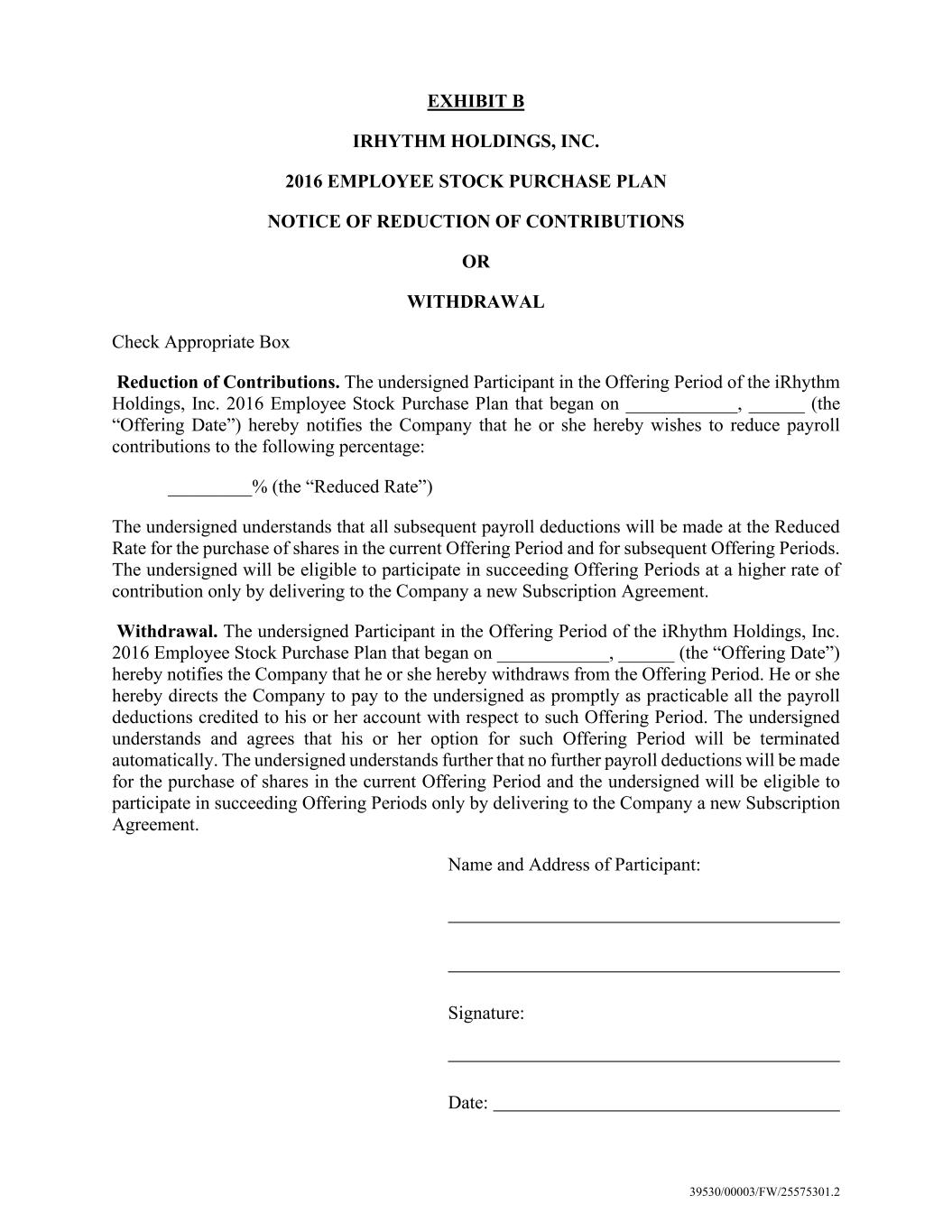 39530/00003/FW/25575301.2 EXHIBIT B IRHYTHM HOLDINGS, INC. 2016 EMPLOYEE STOCK PURCHASE PLAN NOTICE OF REDUCTION OF CONTRIBUTIONS OR WITHDRAWAL Check Appropriate Box Reduction of Contributions. The undersigned Participant in the Offering Period of the iRhythm Holdings, Inc. 2016 Employee Stock Purchase Plan that began on ____________, ______ (the “Offering Date”) hereby notifies the Company that he or she hereby wishes to reduce payroll contributions to the following percentage: _________% (the “Reduced Rate”) The undersigned understands that all subsequent payroll deductions will be made at the Reduced Rate for the purchase of shares in the current Offering Period and for subsequent Offering Periods. The undersigned will be eligible to participate in succeeding Offering Periods at a higher rate of contribution only by delivering to the Company a new Subscription Agreement. Withdrawal. The undersigned Participant in the Offering Period of the iRhythm Holdings, Inc. 2016 Employee Stock Purchase Plan that began on ____________, ______ (the “Offering Date”) hereby notifies the Company that he or she hereby withdraws from the Offering Period. He or she hereby directs the Company to pay to the undersigned as promptly as practicable all the payroll deductions credited to his or her account with respect to such Offering Period. The undersigned understands and agrees that his or her option for such Offering Period will be terminated automatically. The undersigned understands further that no further payroll deductions will be made for the purchase of shares in the current Offering Period and the undersigned will be eligible to participate in succeeding Offering Periods only by delivering to the Company a new Subscription Agreement. Name and Address of Participant: Signature: Date: