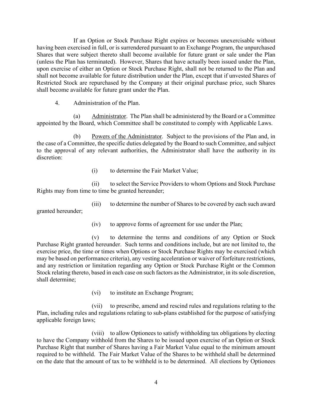 4 If an Option or Stock Purchase Right expires or becomes unexercisable without having been exercised in full, or is surrendered pursuant to an Exchange Program, the unpurchased Shares that were subject thereto shall become available for future grant or sale under the Plan (unless the Plan has terminated). However, Shares that have actually been issued under the Plan, upon exercise of either an Option or Stock Purchase Right, shall not be returned to the Plan and shall not become available for future distribution under the Plan, except that if unvested Shares of Restricted Stock are repurchased by the Company at their original purchase price, such Shares shall become available for future grant under the Plan. 4. Administration of the Plan. (a) Administrator. The Plan shall be administered by the Board or a Committee appointed by the Board, which Committee shall be constituted to comply with Applicable Laws. (b) Powers of the Administrator. Subject to the provisions of the Plan and, in the case of a Committee, the specific duties delegated by the Board to such Committee, and subject to the approval of any relevant authorities, the Administrator shall have the authority in its discretion: (i) to determine the Fair Market Value; (ii) to select the Service Providers to whom Options and Stock Purchase Rights may from time to time be granted hereunder; (iii) to determine the number of Shares to be covered by each such award granted hereunder; (iv) to approve forms of agreement for use under the Plan; (v) to determine the terms and conditions of any Option or Stock Purchase Right granted hereunder. Such terms and conditions include, but are not limited to, the exercise price, the time or times when Options or Stock Purchase Rights may be exercised (which may be based on performance criteria), any vesting acceleration or waiver of forfeiture restrictions, and any restriction or limitation regarding any Option or Stock Purchase Right or the Common Stock relating thereto, based in each case on such factors as the Administrator, in its sole discretion, shall determine; (vi) to institute an Exchange Program; (vii) to prescribe, amend and rescind rules and regulations relating to the Plan, including rules and regulations relating to sub-plans established for the purpose of satisfying applicable foreign laws; (viii) to allow Optionees to satisfy withholding tax obligations by electing to have the Company withhold from the Shares to be issued upon exercise of an Option or Stock Purchase Right that number of Shares having a Fair Market Value equal to the minimum amount required to be withheld. The Fair Market Value of the Shares to be withheld shall be determined on the date that the amount of tax to be withheld is to be determined. All elections by Optionees