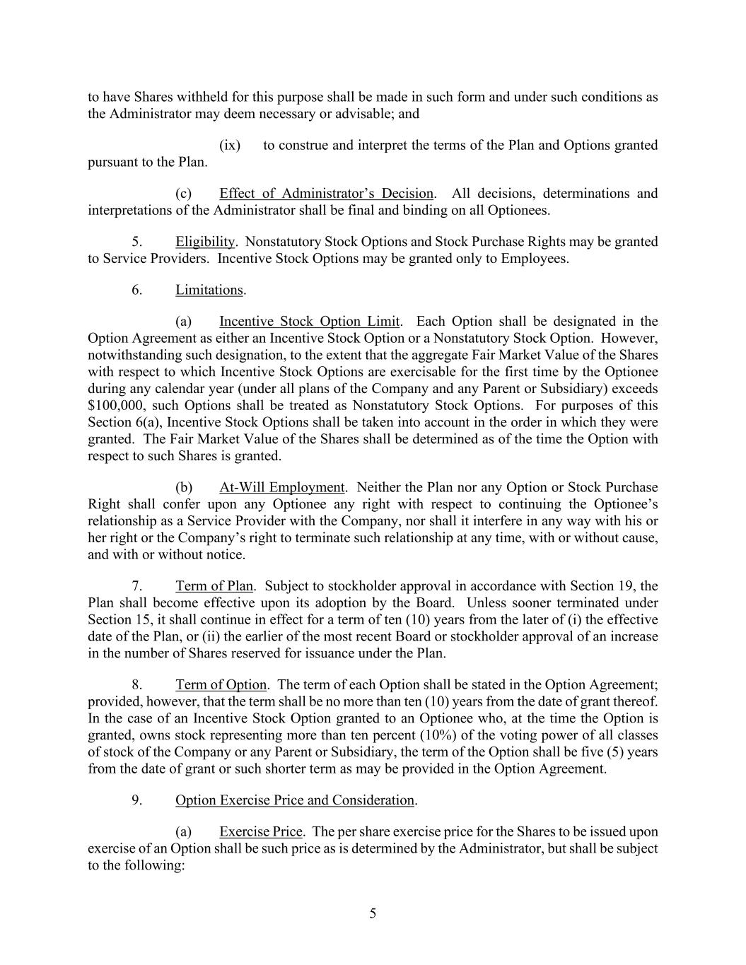 5 to have Shares withheld for this purpose shall be made in such form and under such conditions as the Administrator may deem necessary or advisable; and (ix) to construe and interpret the terms of the Plan and Options granted pursuant to the Plan. (c) Effect of Administrator’s Decision. All decisions, determinations and interpretations of the Administrator shall be final and binding on all Optionees. 5. Eligibility. Nonstatutory Stock Options and Stock Purchase Rights may be granted to Service Providers. Incentive Stock Options may be granted only to Employees. 6. Limitations. (a) Incentive Stock Option Limit. Each Option shall be designated in the Option Agreement as either an Incentive Stock Option or a Nonstatutory Stock Option. However, notwithstanding such designation, to the extent that the aggregate Fair Market Value of the Shares with respect to which Incentive Stock Options are exercisable for the first time by the Optionee during any calendar year (under all plans of the Company and any Parent or Subsidiary) exceeds $100,000, such Options shall be treated as Nonstatutory Stock Options. For purposes of this Section 6(a), Incentive Stock Options shall be taken into account in the order in which they were granted. The Fair Market Value of the Shares shall be determined as of the time the Option with respect to such Shares is granted. (b) At-Will Employment. Neither the Plan nor any Option or Stock Purchase Right shall confer upon any Optionee any right with respect to continuing the Optionee’s relationship as a Service Provider with the Company, nor shall it interfere in any way with his or her right or the Company’s right to terminate such relationship at any time, with or without cause, and with or without notice. 7. Term of Plan. Subject to stockholder approval in accordance with Section 19, the Plan shall become effective upon its adoption by the Board. Unless sooner terminated under Section 15, it shall continue in effect for a term of ten (10) years from the later of (i) the effective date of the Plan, or (ii) the earlier of the most recent Board or stockholder approval of an increase in the number of Shares reserved for issuance under the Plan. 8. Term of Option. The term of each Option shall be stated in the Option Agreement; provided, however, that the term shall be no more than ten (10) years from the date of grant thereof. In the case of an Incentive Stock Option granted to an Optionee who, at the time the Option is granted, owns stock representing more than ten percent (10%) of the voting power of all classes of stock of the Company or any Parent or Subsidiary, the term of the Option shall be five (5) years from the date of grant or such shorter term as may be provided in the Option Agreement. 9. Option Exercise Price and Consideration. (a) Exercise Price. The per share exercise price for the Shares to be issued upon exercise of an Option shall be such price as is determined by the Administrator, but shall be subject to the following: