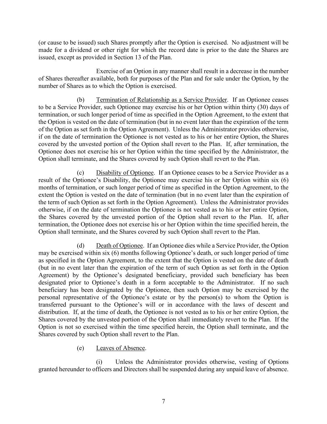 7 (or cause to be issued) such Shares promptly after the Option is exercised. No adjustment will be made for a dividend or other right for which the record date is prior to the date the Shares are issued, except as provided in Section 13 of the Plan. Exercise of an Option in any manner shall result in a decrease in the number of Shares thereafter available, both for purposes of the Plan and for sale under the Option, by the number of Shares as to which the Option is exercised. (b) Termination of Relationship as a Service Provider. If an Optionee ceases to be a Service Provider, such Optionee may exercise his or her Option within thirty (30) days of termination, or such longer period of time as specified in the Option Agreement, to the extent that the Option is vested on the date of termination (but in no event later than the expiration of the term of the Option as set forth in the Option Agreement). Unless the Administrator provides otherwise, if on the date of termination the Optionee is not vested as to his or her entire Option, the Shares covered by the unvested portion of the Option shall revert to the Plan. If, after termination, the Optionee does not exercise his or her Option within the time specified by the Administrator, the Option shall terminate, and the Shares covered by such Option shall revert to the Plan. (c) Disability of Optionee. If an Optionee ceases to be a Service Provider as a result of the Optionee’s Disability, the Optionee may exercise his or her Option within six (6) months of termination, or such longer period of time as specified in the Option Agreement, to the extent the Option is vested on the date of termination (but in no event later than the expiration of the term of such Option as set forth in the Option Agreement). Unless the Administrator provides otherwise, if on the date of termination the Optionee is not vested as to his or her entire Option, the Shares covered by the unvested portion of the Option shall revert to the Plan. If, after termination, the Optionee does not exercise his or her Option within the time specified herein, the Option shall terminate, and the Shares covered by such Option shall revert to the Plan. (d) Death of Optionee. If an Optionee dies while a Service Provider, the Option may be exercised within six (6) months following Optionee’s death, or such longer period of time as specified in the Option Agreement, to the extent that the Option is vested on the date of death (but in no event later than the expiration of the term of such Option as set forth in the Option Agreement) by the Optionee’s designated beneficiary, provided such beneficiary has been designated prior to Optionee’s death in a form acceptable to the Administrator. If no such beneficiary has been designated by the Optionee, then such Option may be exercised by the personal representative of the Optionee’s estate or by the person(s) to whom the Option is transferred pursuant to the Optionee’s will or in accordance with the laws of descent and distribution. If, at the time of death, the Optionee is not vested as to his or her entire Option, the Shares covered by the unvested portion of the Option shall immediately revert to the Plan. If the Option is not so exercised within the time specified herein, the Option shall terminate, and the Shares covered by such Option shall revert to the Plan. (e) Leaves of Absence. (i) Unless the Administrator provides otherwise, vesting of Options granted hereunder to officers and Directors shall be suspended during any unpaid leave of absence.