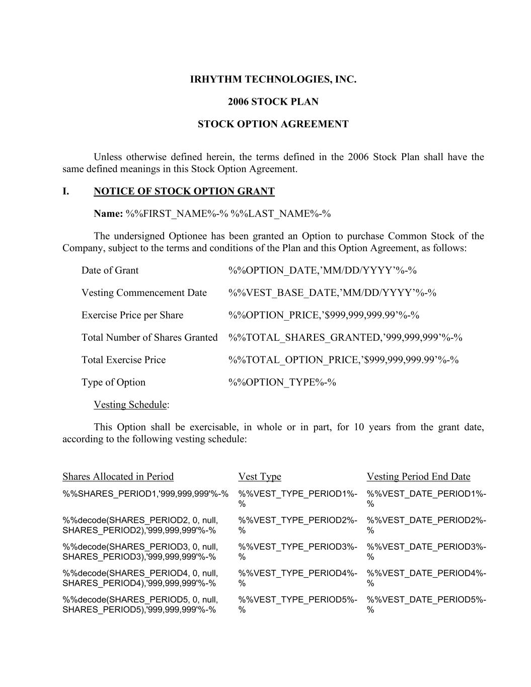 IRHYTHM TECHNOLOGIES, INC. 2006 STOCK PLAN STOCK OPTION AGREEMENT Unless otherwise defined herein, the terms defined in the 2006 Stock Plan shall have the same defined meanings in this Stock Option Agreement. I. NOTICE OF STOCK OPTION GRANT Name: %%FIRST_NAME%-% %%LAST_NAME%-% The undersigned Optionee has been granted an Option to purchase Common Stock of the Company, subject to the terms and conditions of the Plan and this Option Agreement, as follows: Date of Grant %%OPTION_DATE,’MM/DD/YYYY’%-% Vesting Commencement Date %%VEST_BASE_DATE,’MM/DD/YYYY’%-% Exercise Price per Share %%OPTION_PRICE,’$999,999,999.99’%-% Total Number of Shares Granted %%TOTAL_SHARES_GRANTED,’999,999,999’%-% Total Exercise Price %%TOTAL_OPTION_PRICE,’$999,999,999.99’%-% Type of Option %%OPTION_TYPE%-% Vesting Schedule: This Option shall be exercisable, in whole or in part, for 10 years from the grant date, according to the following vesting schedule: Shares Allocated in Period Vest Type Vesting Period End Date %%SHARES_PERIOD1,'999,999,999'%-% %%VEST_TYPE_PERIOD1%- % %%VEST_DATE_PERIOD1%- % %%decode(SHARES_PERIOD2, 0, null, SHARES_PERIOD2),'999,999,999'%-% %%VEST_TYPE_PERIOD2%- % %%VEST_DATE_PERIOD2%- % %%decode(SHARES_PERIOD3, 0, null, SHARES_PERIOD3),'999,999,999'%-% %%VEST_TYPE_PERIOD3%- % %%VEST_DATE_PERIOD3%- % %%decode(SHARES_PERIOD4, 0, null, SHARES_PERIOD4),'999,999,999'%-% %%VEST_TYPE_PERIOD4%- % %%VEST_DATE_PERIOD4%- % %%decode(SHARES_PERIOD5, 0, null, SHARES_PERIOD5),'999,999,999'%-% %%VEST_TYPE_PERIOD5%- % %%VEST_DATE_PERIOD5%- %