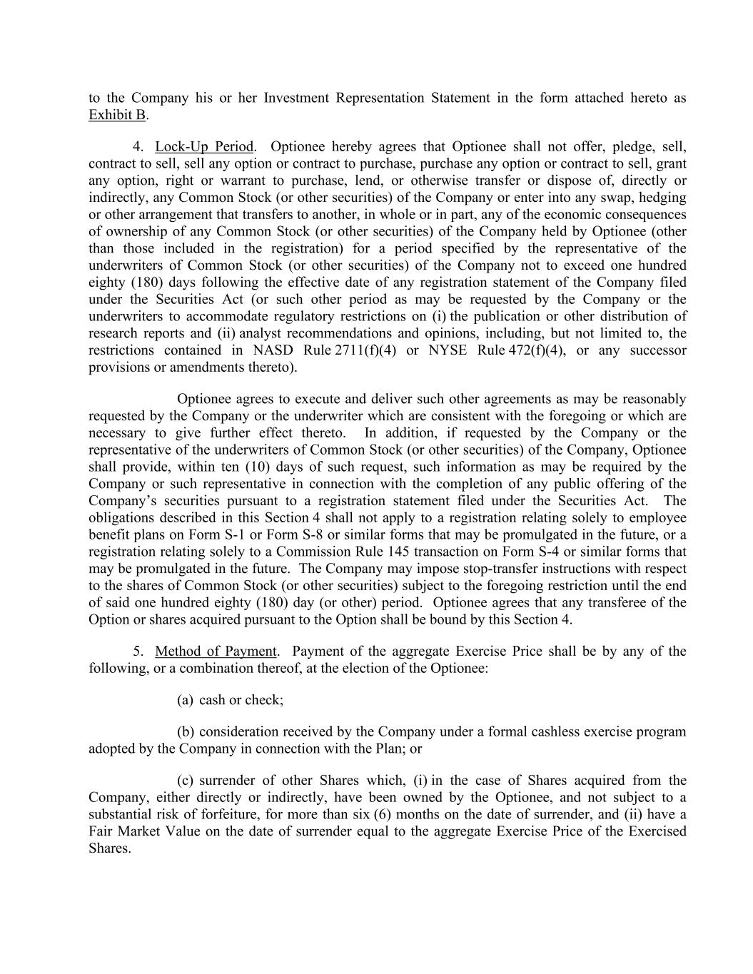 to the Company his or her Investment Representation Statement in the form attached hereto as Exhibit B. 4. Lock-Up Period. Optionee hereby agrees that Optionee shall not offer, pledge, sell, contract to sell, sell any option or contract to purchase, purchase any option or contract to sell, grant any option, right or warrant to purchase, lend, or otherwise transfer or dispose of, directly or indirectly, any Common Stock (or other securities) of the Company or enter into any swap, hedging or other arrangement that transfers to another, in whole or in part, any of the economic consequences of ownership of any Common Stock (or other securities) of the Company held by Optionee (other than those included in the registration) for a period specified by the representative of the underwriters of Common Stock (or other securities) of the Company not to exceed one hundred eighty (180) days following the effective date of any registration statement of the Company filed under the Securities Act (or such other period as may be requested by the Company or the underwriters to accommodate regulatory restrictions on (i) the publication or other distribution of research reports and (ii) analyst recommendations and opinions, including, but not limited to, the restrictions contained in NASD Rule 2711(f)(4) or NYSE Rule 472(f)(4), or any successor provisions or amendments thereto). Optionee agrees to execute and deliver such other agreements as may be reasonably requested by the Company or the underwriter which are consistent with the foregoing or which are necessary to give further effect thereto. In addition, if requested by the Company or the representative of the underwriters of Common Stock (or other securities) of the Company, Optionee shall provide, within ten (10) days of such request, such information as may be required by the Company or such representative in connection with the completion of any public offering of the Company’s securities pursuant to a registration statement filed under the Securities Act. The obligations described in this Section 4 shall not apply to a registration relating solely to employee benefit plans on Form S-1 or Form S-8 or similar forms that may be promulgated in the future, or a registration relating solely to a Commission Rule 145 transaction on Form S-4 or similar forms that may be promulgated in the future. The Company may impose stop-transfer instructions with respect to the shares of Common Stock (or other securities) subject to the foregoing restriction until the end of said one hundred eighty (180) day (or other) period. Optionee agrees that any transferee of the Option or shares acquired pursuant to the Option shall be bound by this Section 4. 5. Method of Payment. Payment of the aggregate Exercise Price shall be by any of the following, or a combination thereof, at the election of the Optionee: (a) cash or check; (b) consideration received by the Company under a formal cashless exercise program adopted by the Company in connection with the Plan; or (c) surrender of other Shares which, (i) in the case of Shares acquired from the Company, either directly or indirectly, have been owned by the Optionee, and not subject to a substantial risk of forfeiture, for more than six (6) months on the date of surrender, and (ii) have a Fair Market Value on the date of surrender equal to the aggregate Exercise Price of the Exercised Shares.